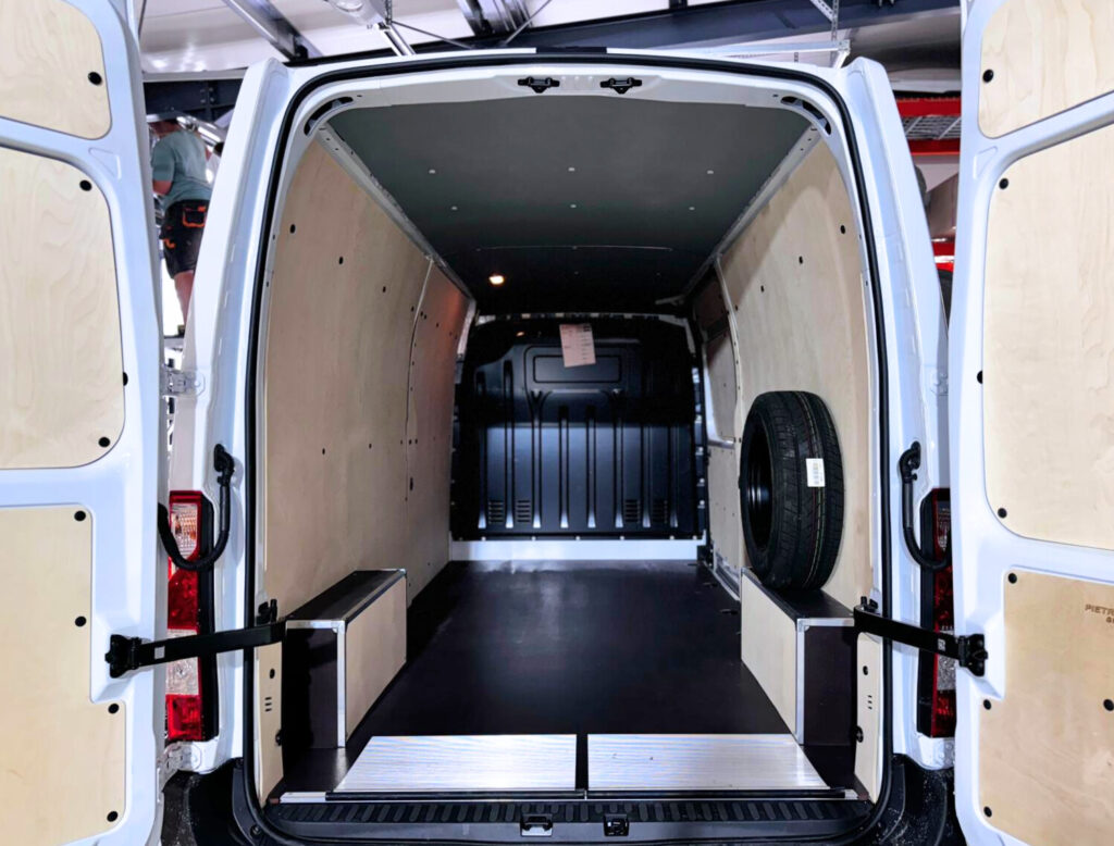 Zabudowa Renault Master to solidne materiały i funkcjonalne rozwiązania, w tym rampa automatyczna i uchwyt na koło zapasowe.