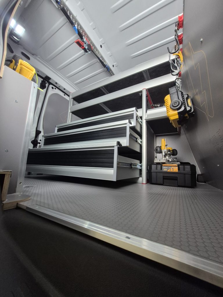 Zabudowa techniczna Toyota Proace City L1H1 dla WS Elektro: podłoga HEXA, nadkola X-TRA, listwy Airline, regał GEMA i wyfrezowane logo.