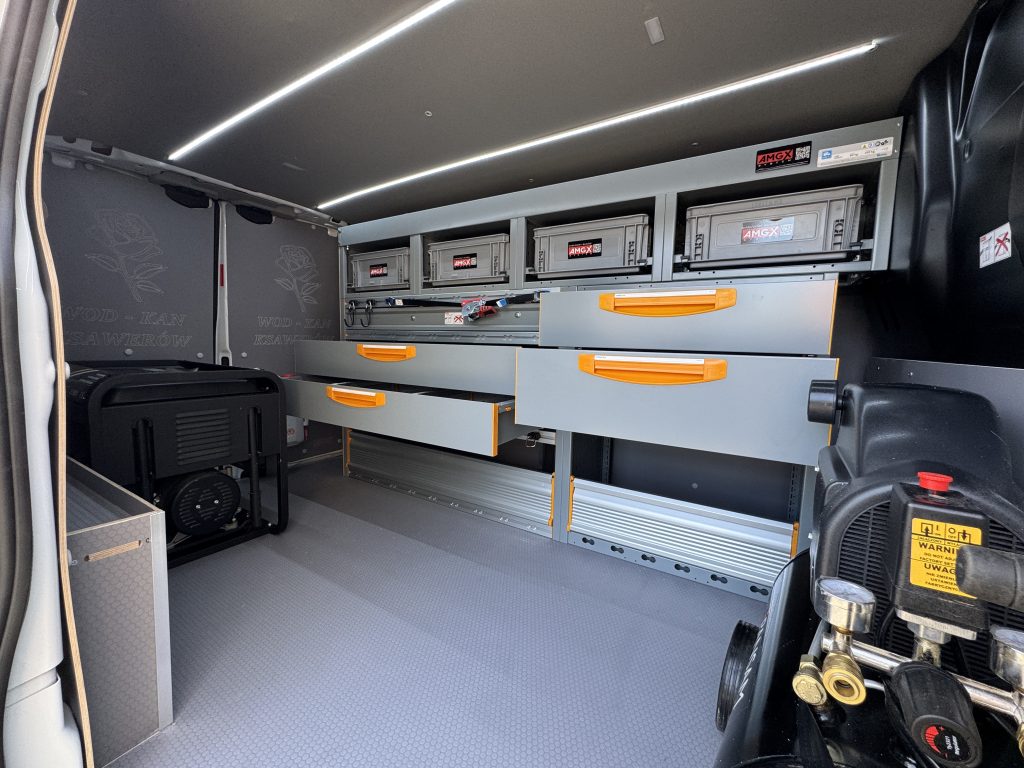 Profesjonalna zabudowa Ford Transit Custom L1H1 dla Gminnej Jednostki Wodno-Kanalizacyjnej Ksawerów. Podłoga HEXA, panele wodoodporne, izolacja, oświetlenie LED oraz systemy mocowania i regały STORE VAN.