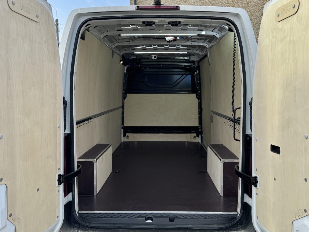 Zabudowa Renault Master dla firm budowlanych – trwała sklejka, listwy Airline, LED-owe oświetlenie i praktyczny szperacz. Profesjonalne rozwiązanie na lata.
