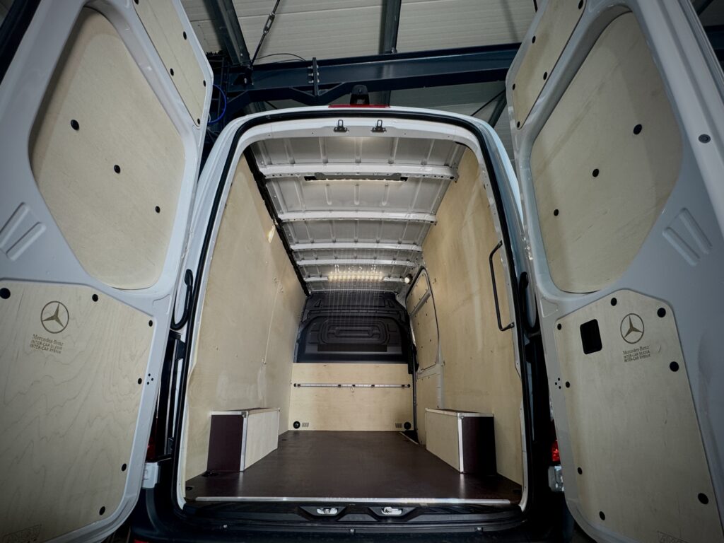 Zabudowa dla firmy BUDROL-PROJEKT do elektrycznego Mercedesa Sprintera stworzona z ekologicznej sklejki liściastej to idealne rozwiązanie dla branży budowlanej. Wytrzymała podłoga, aluminiowe okucia nadkoli i funkcjonalne mocowania zapewniają trwałość, bezpieczeństwo i niezawodność.