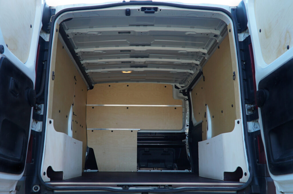 Zabudowa wnętrza Renault Trafic L2H1 zapewnia funkcjonalność i trwałość, chroniąc przestrzeń przed uszkodzeniami.