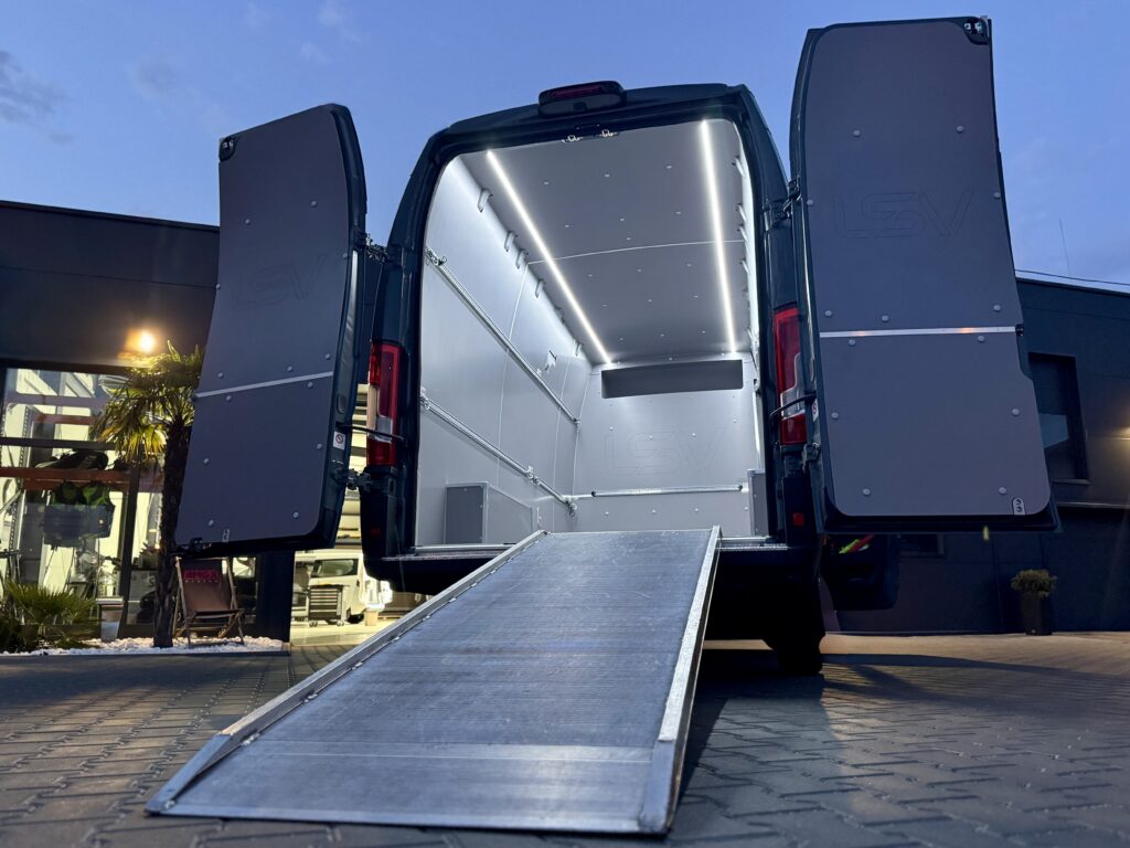 Profesjonalna zabudowa Fiat Ducato L4H3 dla firmy LSV – podłogi, panele, izolacja, LED i systemy mocowania ładunku w najwyższej jakości.