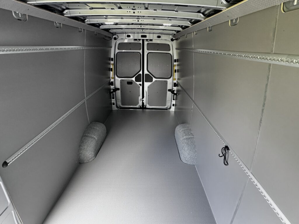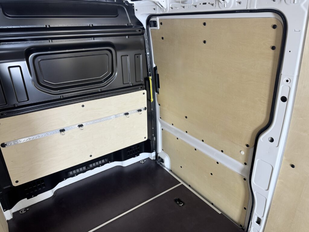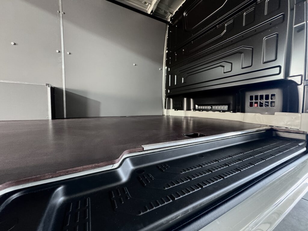 Zamontowaliśmy wodoodporną, laminowaną sklejkę . Panele połączyliśmy aluminiowymi listwami. Podłoga to wytrzymała sklejka 12 mm. Nadkola zabezpieczyliśmy aluminiowymi okuciami.