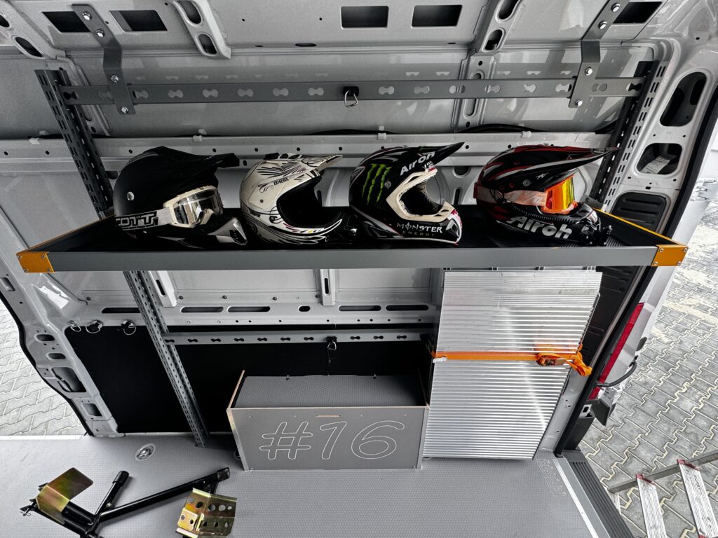 • Regał Light Shelf STOREVAN z półką na kaski, optymalizujący przestrzeń ładunkową i umożliwiający wygodne przechowywanie kasków.