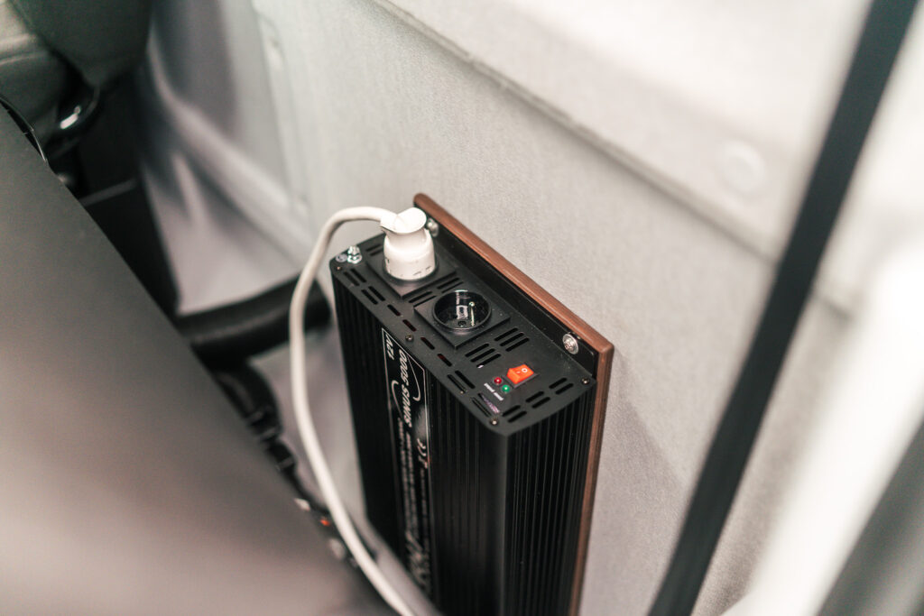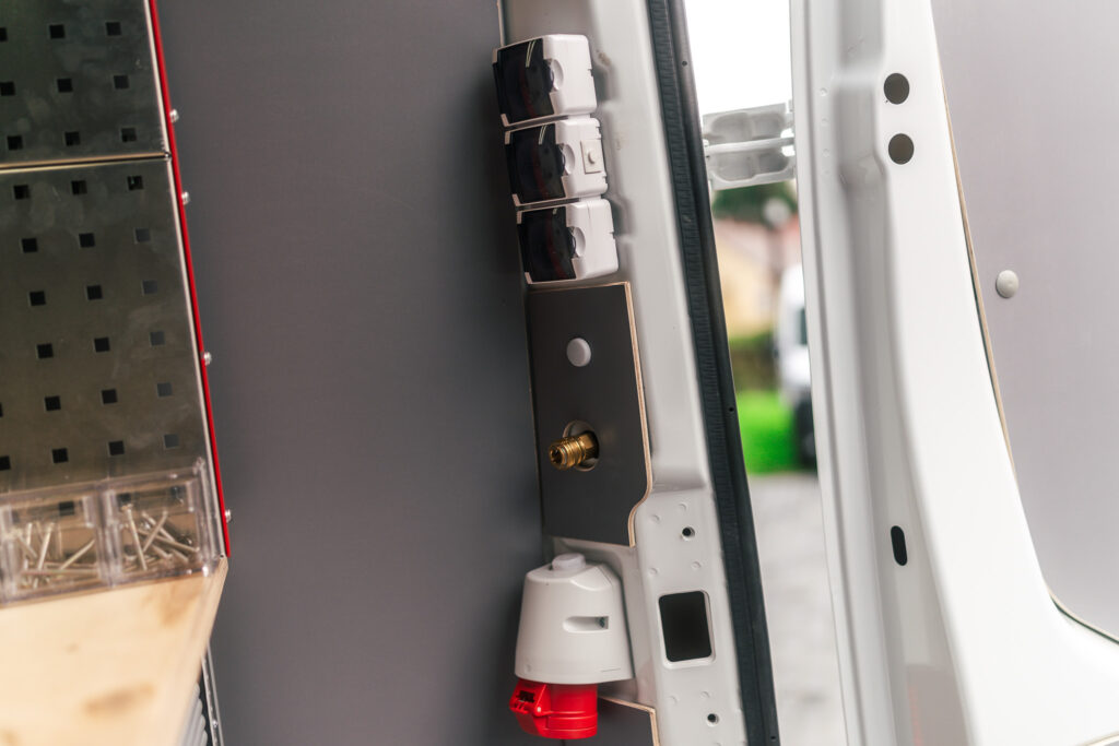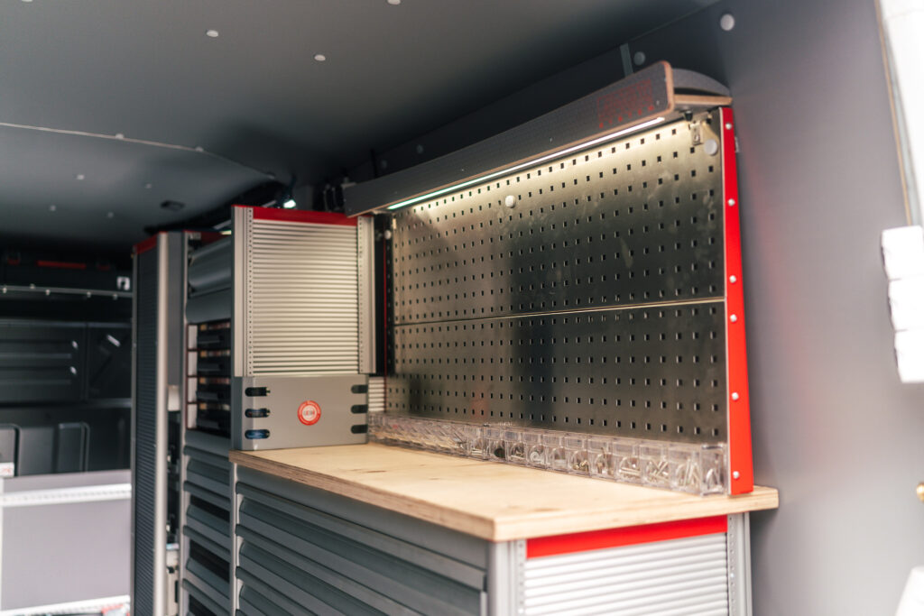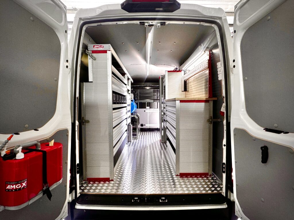 Wyposażyliśmy wnętrze w funkcjonalny stół roboczy z blatem oraz tablicę z kuwetami – prawdziwy warsztat na kółkach! Zadbaliśmy o mocowania na sprzęt specjalistyczny, w tym zwijacze pneumatyczne, półki na spraye oraz węże. Dodatkowo, zainstalowaliśmy mobilny kącik sanitarny ShoulderSink, co zwiększa komfort pracy w terenie.