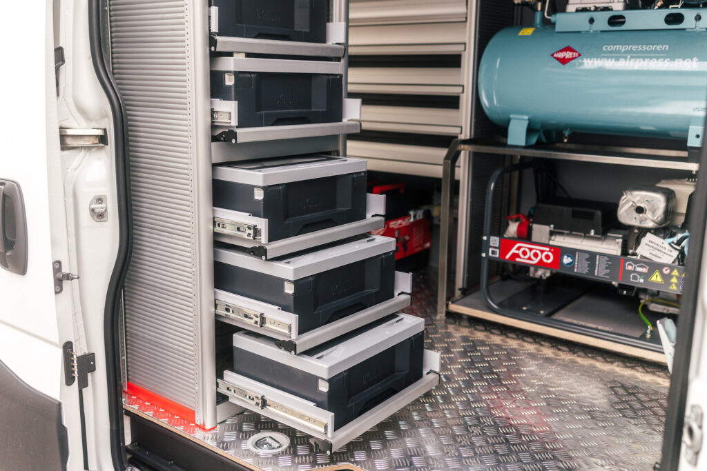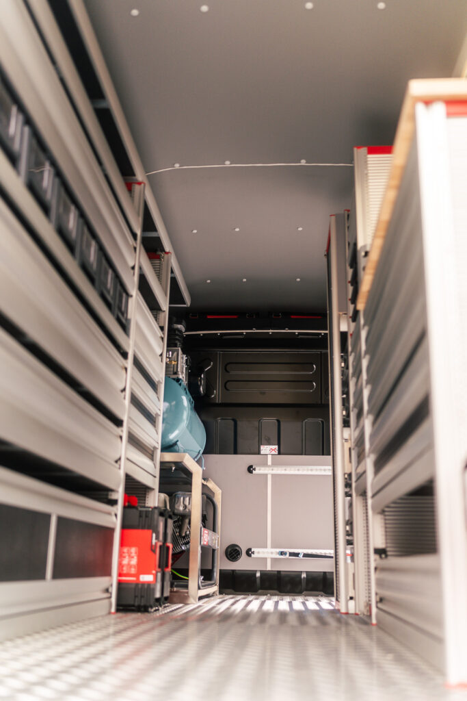 W przestrzeni ładunkowej zamontowaliśmy stojak ze stali nierdzewnej, na którym umieściliśmy agregat i kompresor. Dzięki zabudowie włoskiej marki GEMA, wykonanej z wytłaczanego, anodyzowanego aluminium i lekkich materiałów kompozytowych, nasze szuflady i półki są zoptymalizowane pod kątem maksymalnej pojemności i obciążenia. W zestawie znajdują się skrzynki narzędziowe Pro AUER Packaging, idealne do bezpiecznego przechowywania i transportu narzędzi, oraz walizki na drobne towary.