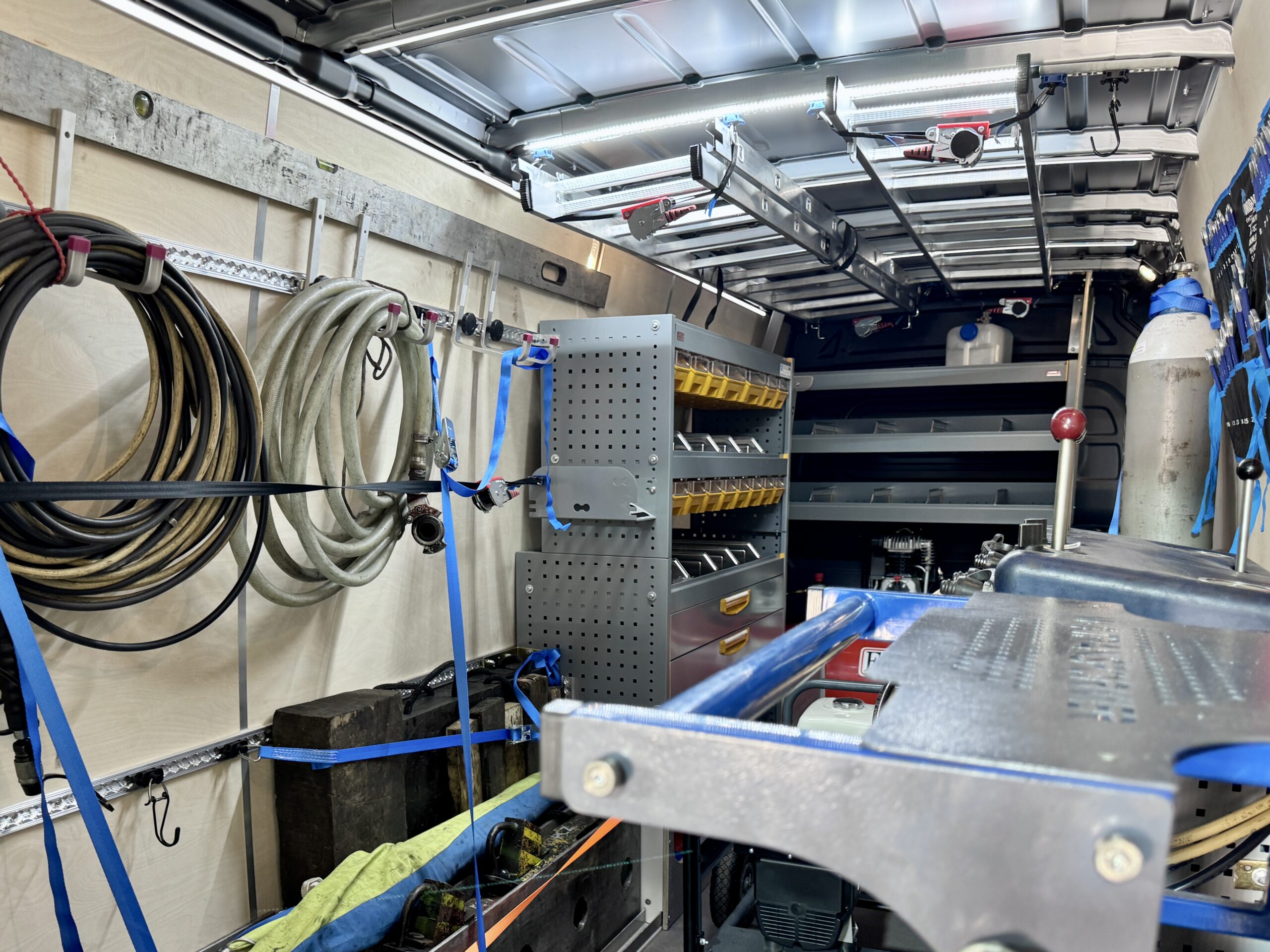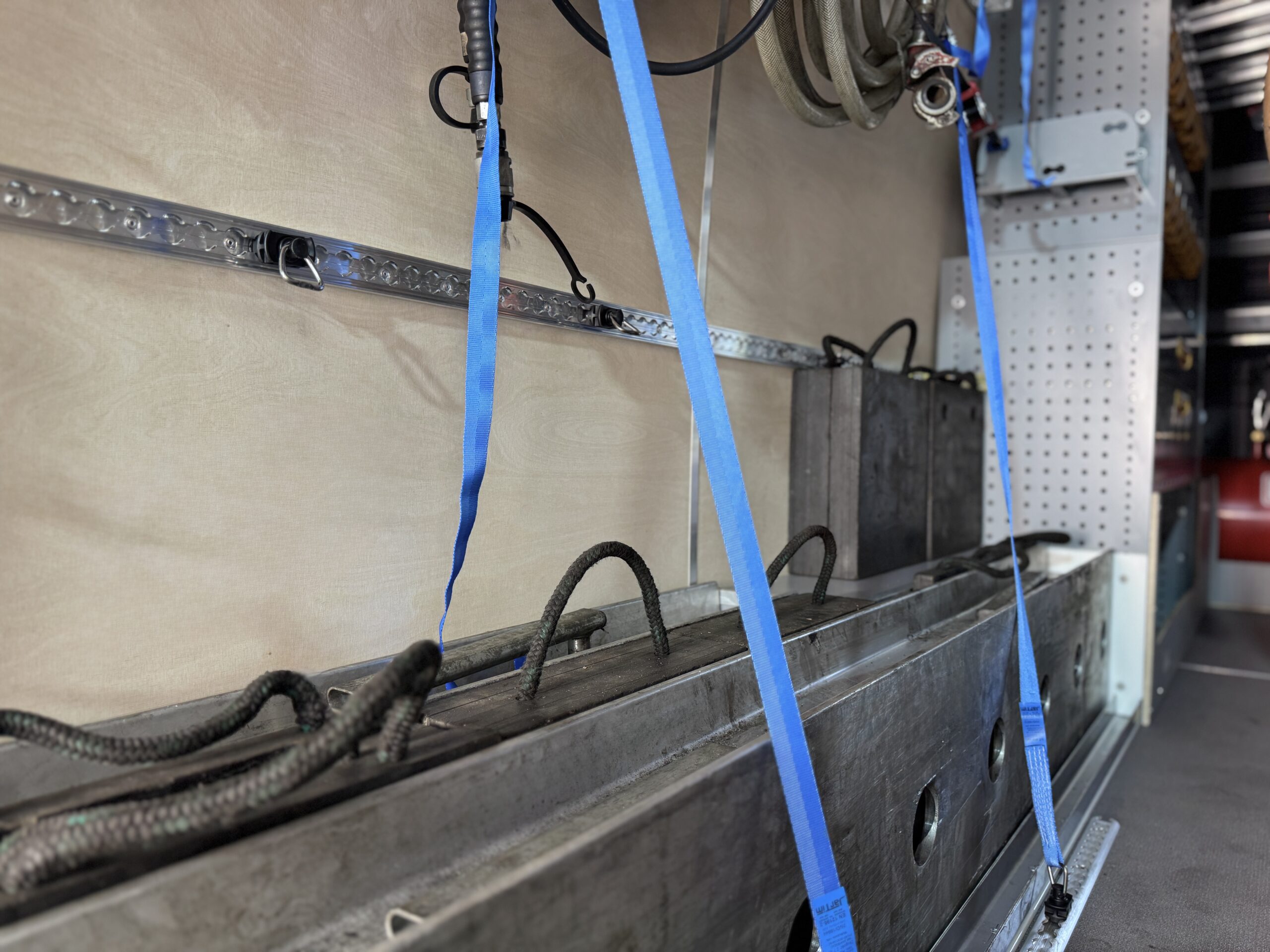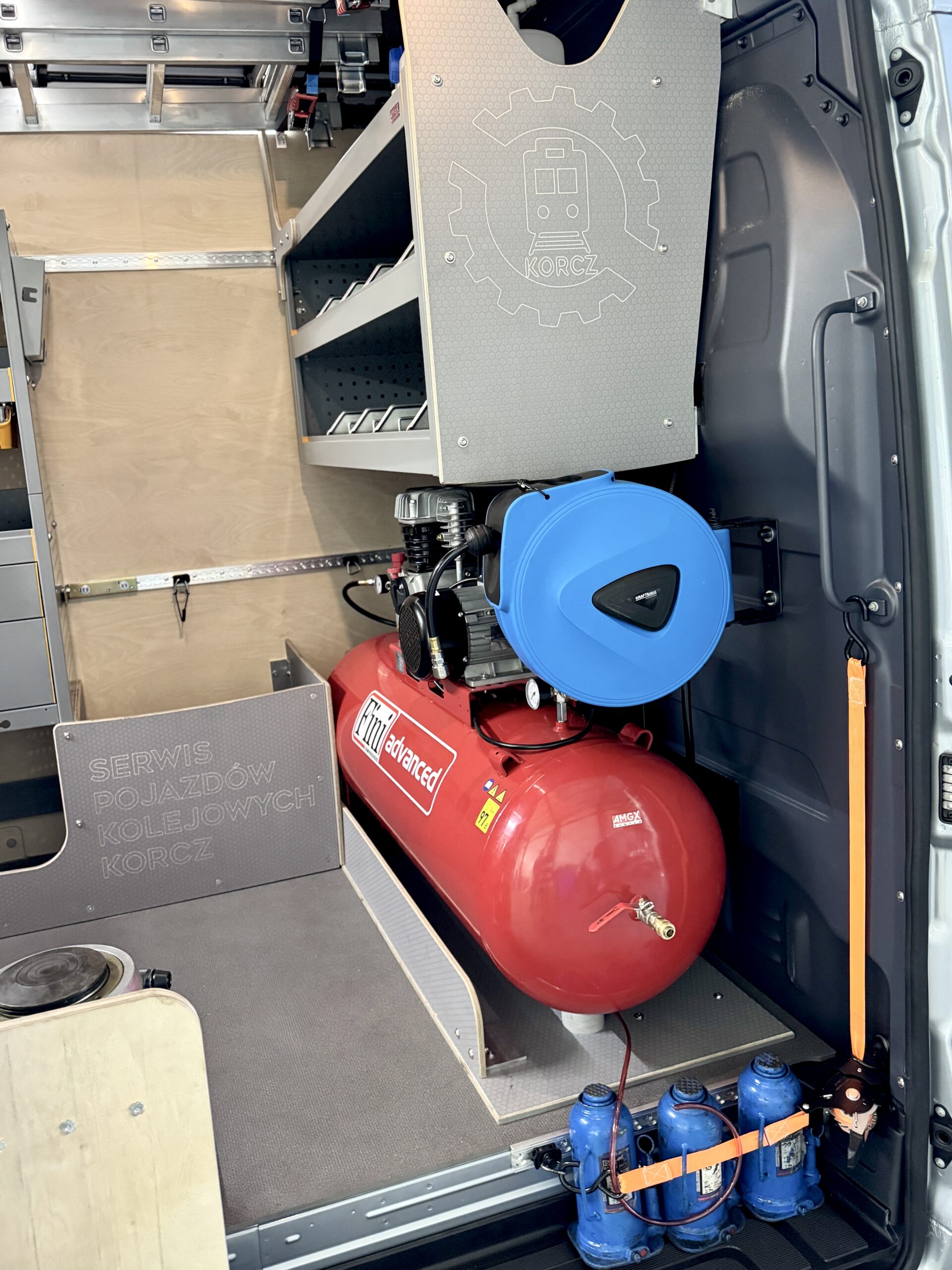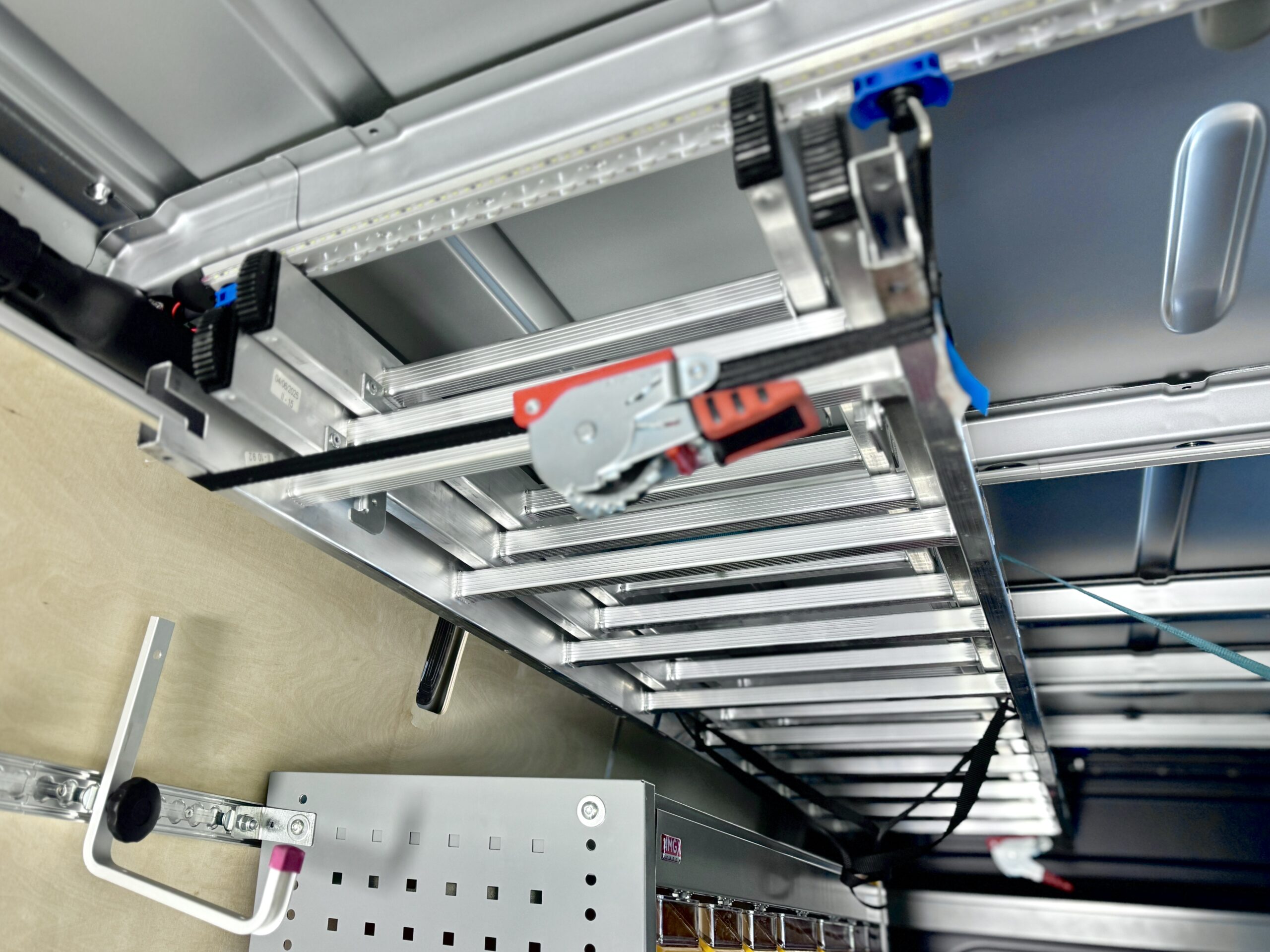 Obok blatu zaprojektowano specjalne miejsce na butlę, wykonane z wytrzymałej, 20‑mm sklejki. Umieściliśmy również funkcjonalna skrzynię na drewniane klocki podporowe. Lewarki zamocowaliśmy na progu przy bocznych drzwiach. Do listwy airline zamontowaliśmy haki na kable z możliwością przekładania. Szyny kolejowe umieściliśmy na płycie PE-HD (PE300), zapewniającej wytrzymałość i łatwe przesuwanie ciężkich elementów. Całość zabezpieczyliśmy ceownikiem nierdzewnym. Drabinę umieszczono pod sufitem na listwach Wistra, mocując ją automatycznymi pasami montażowymi.