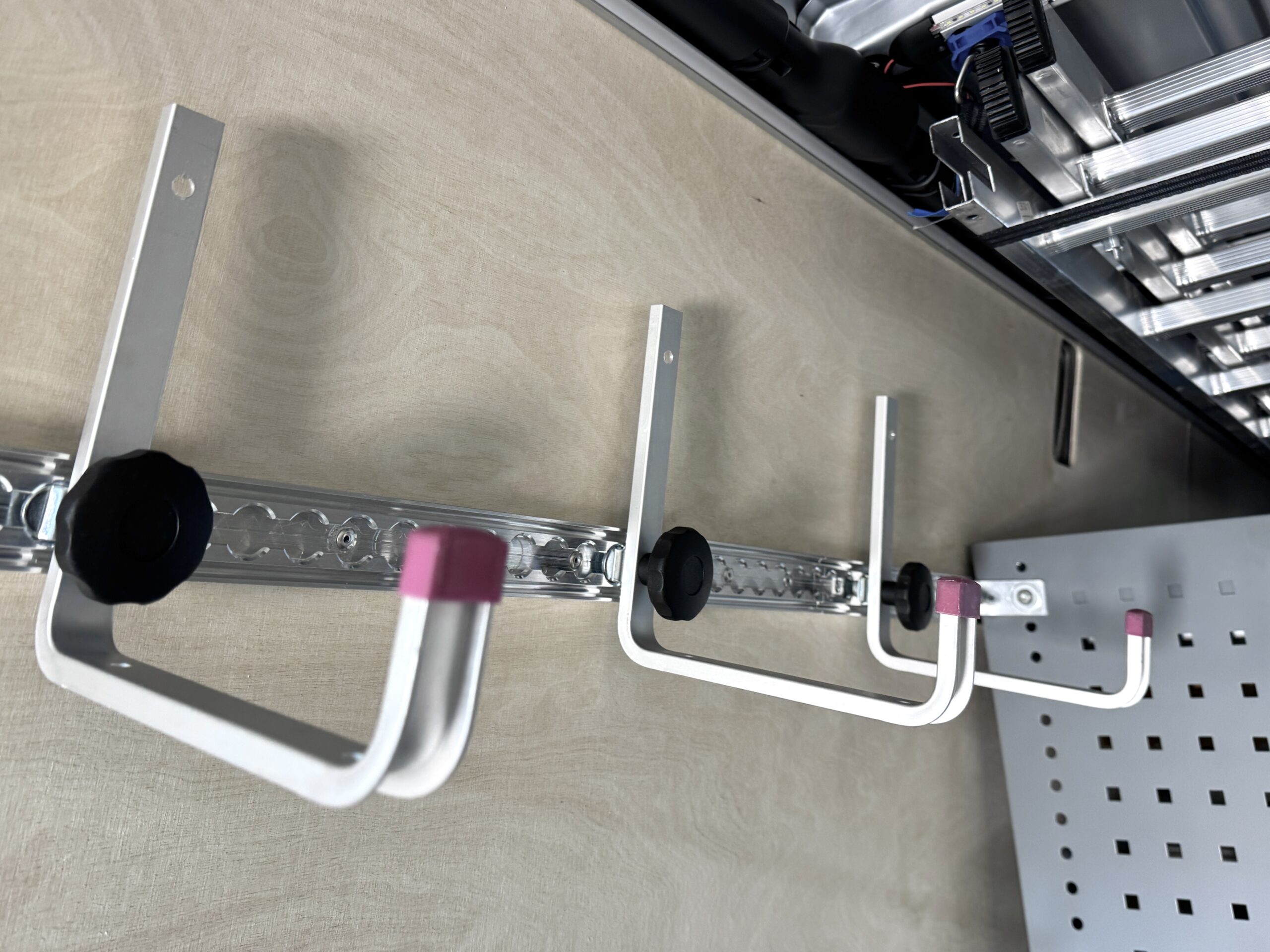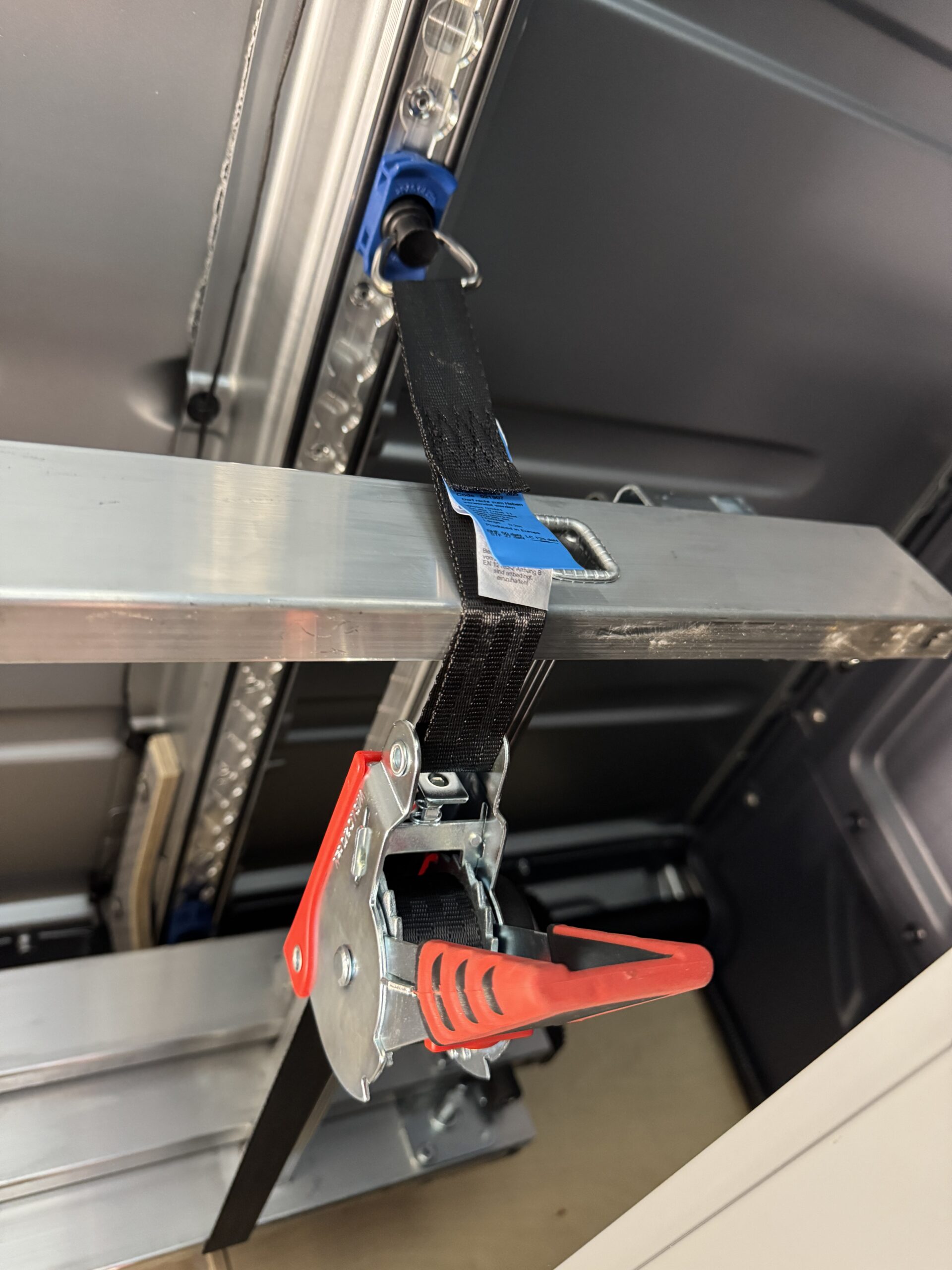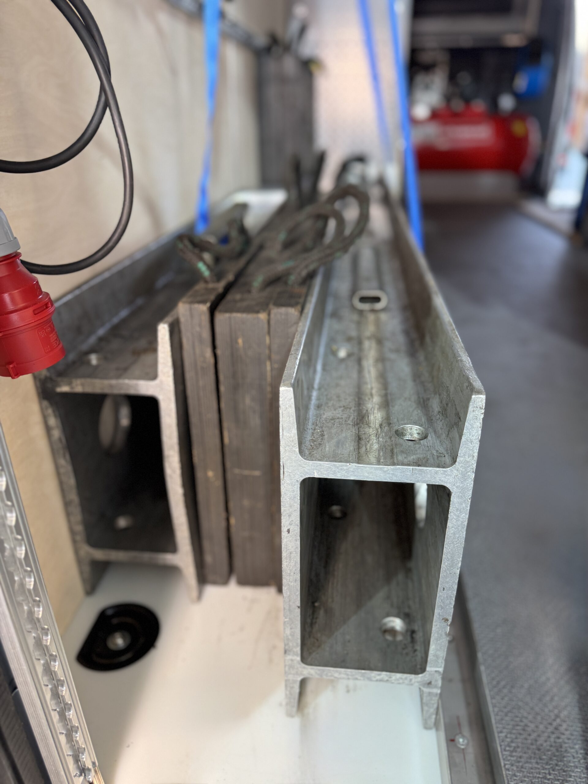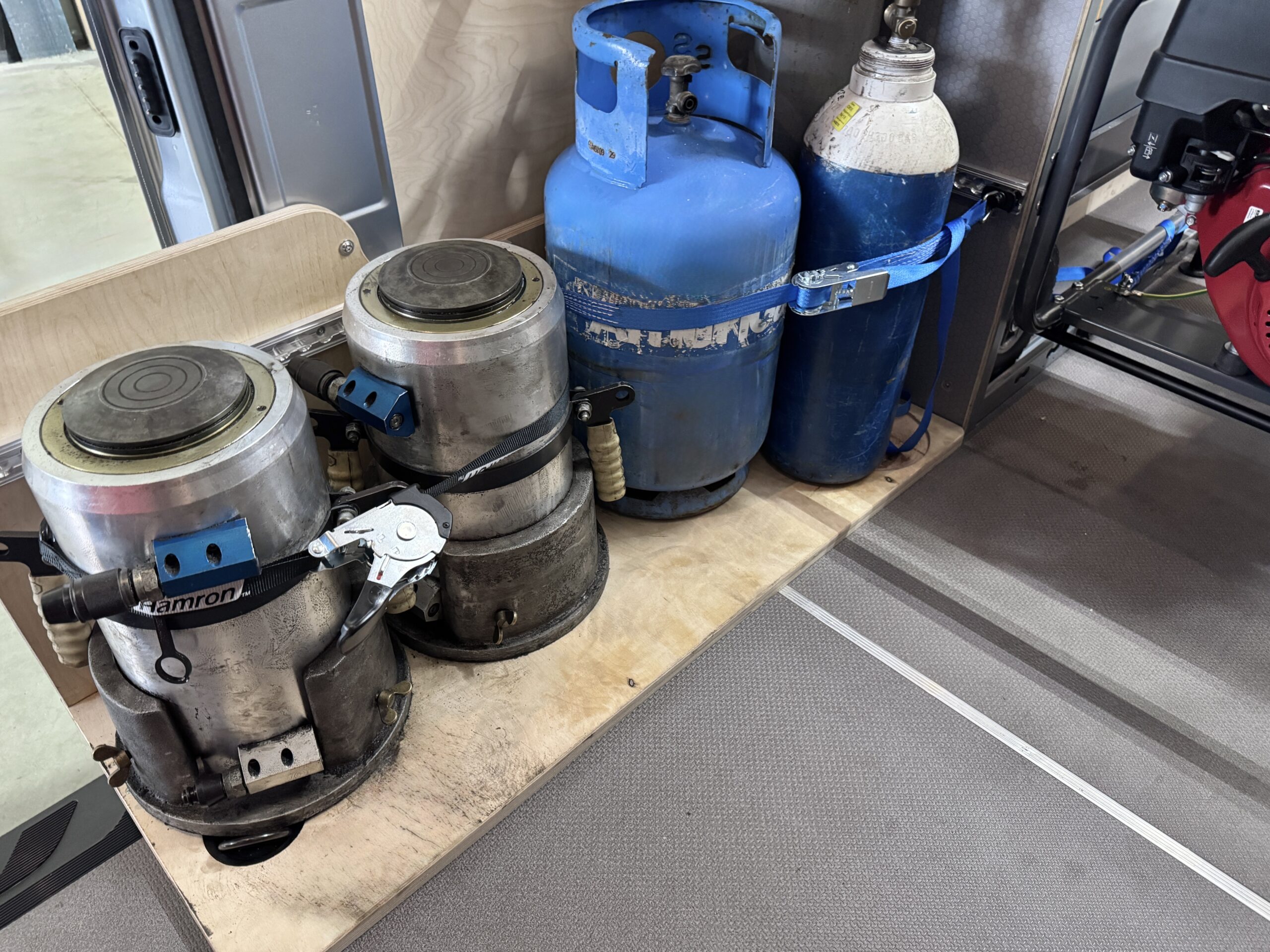 Obok blatu zaprojektowano specjalne miejsce na butlę, wykonane z wytrzymałej, 20‑mm sklejki. Umieściliśmy również funkcjonalna skrzynię na drewniane klocki podporowe. Lewarki zamocowaliśmy na progu przy bocznych drzwiach. Do listwy airline zamontowaliśmy haki na kable z możliwością przekładania. Szyny kolejowe umieściliśmy na płycie PE-HD (PE300), zapewniającej wytrzymałość i łatwe przesuwanie ciężkich elementów. Całość zabezpieczyliśmy ceownikiem nierdzewnym. Drabinę umieszczono pod sufitem na listwach Wistra, mocując ją automatycznymi pasami montażowymi.