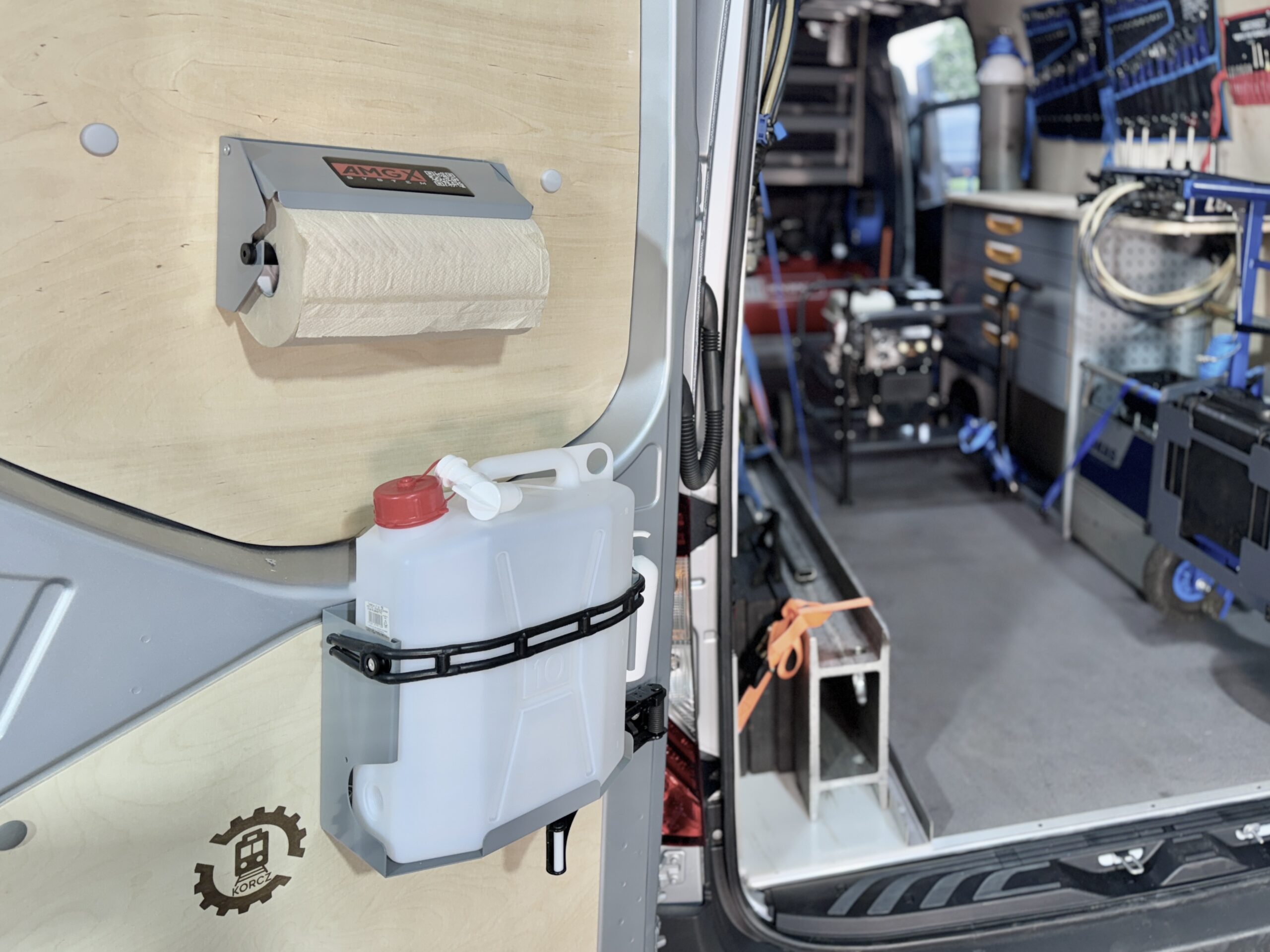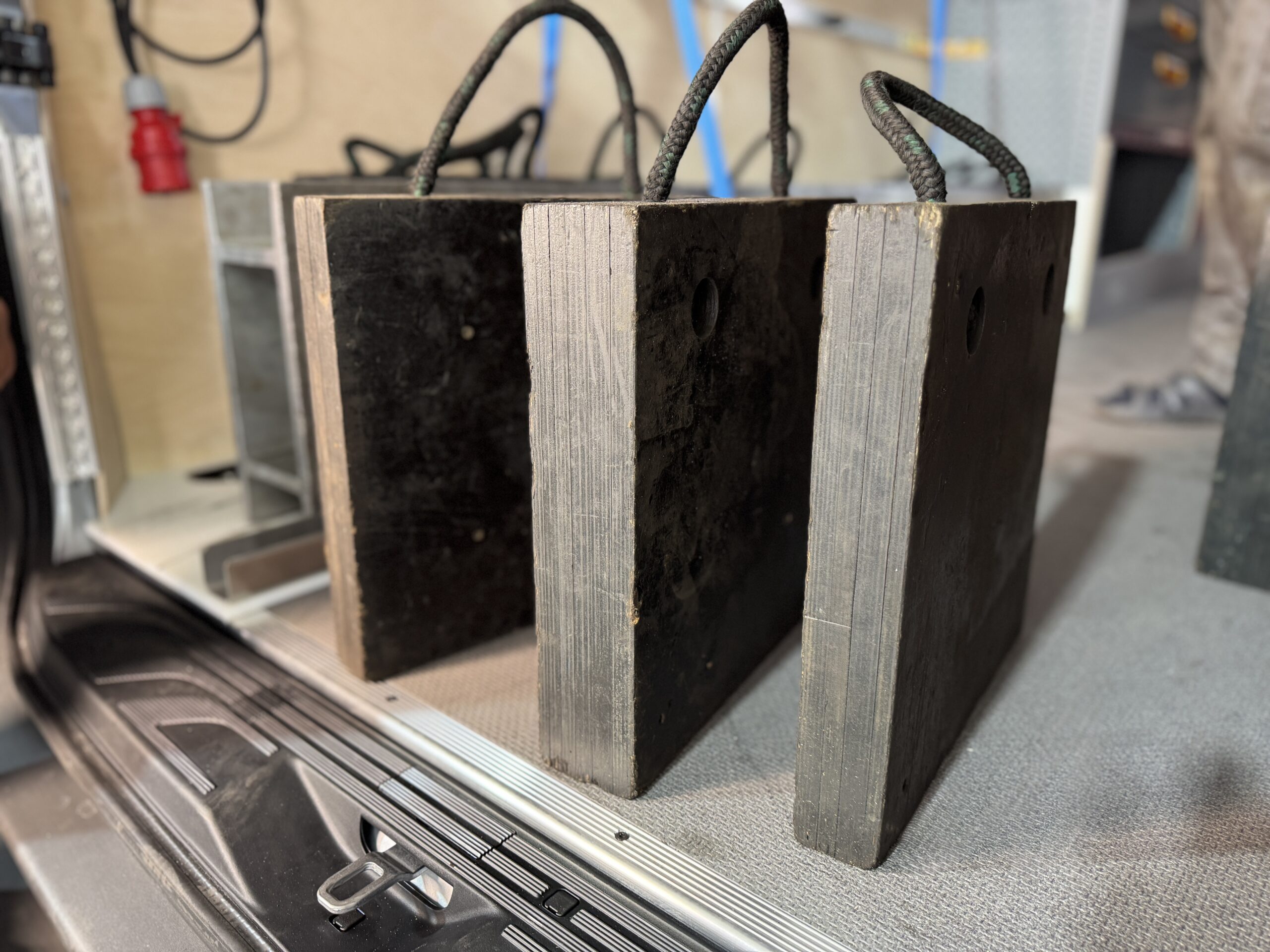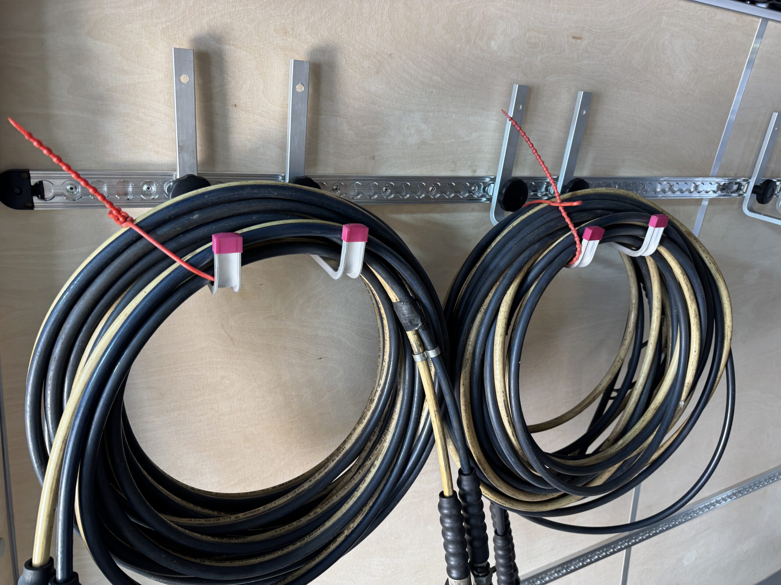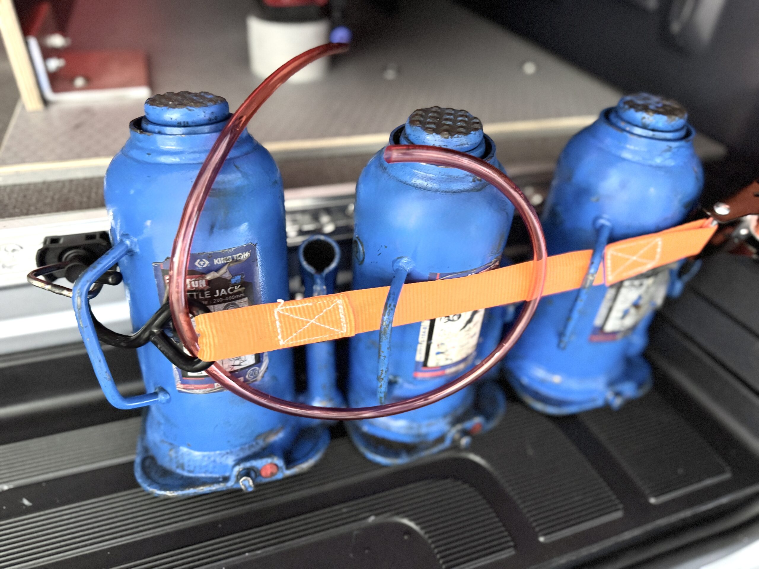 Obok blatu zaprojektowano specjalne miejsce na butlę, wykonane z wytrzymałej, 20‑mm sklejki. Umieściliśmy również funkcjonalna skrzynię na drewniane klocki podporowe. Lewarki zamocowaliśmy na progu przy bocznych drzwiach. Do listwy airline zamontowaliśmy haki na kable z możliwością przekładania. Szyny kolejowe umieściliśmy na płycie PE-HD (PE300), zapewniającej wytrzymałość i łatwe przesuwanie ciężkich elementów. Całość zabezpieczyliśmy ceownikiem nierdzewnym. Drabinę umieszczono pod sufitem na listwach Wistra, mocując ją automatycznymi pasami montażowymi.