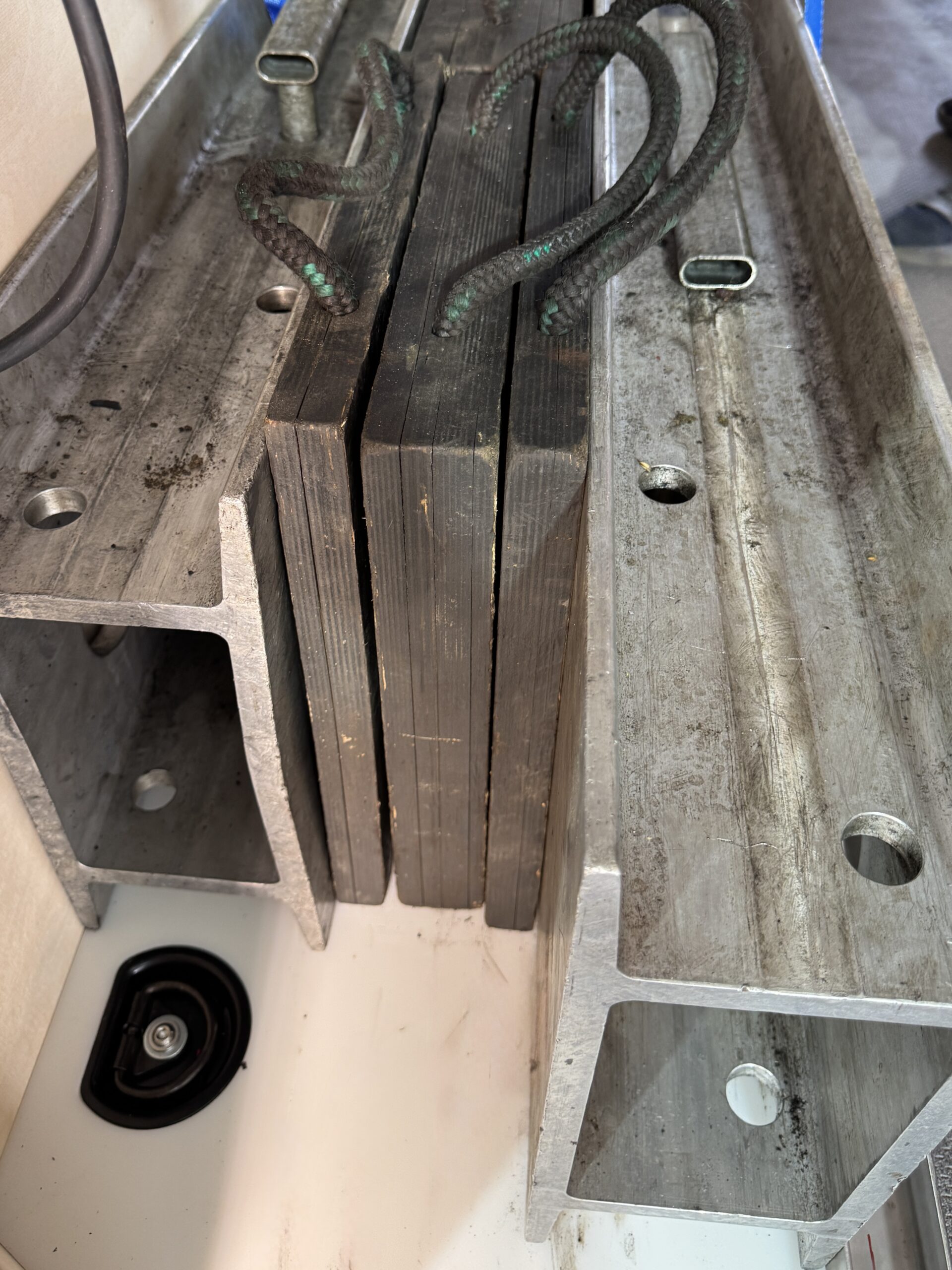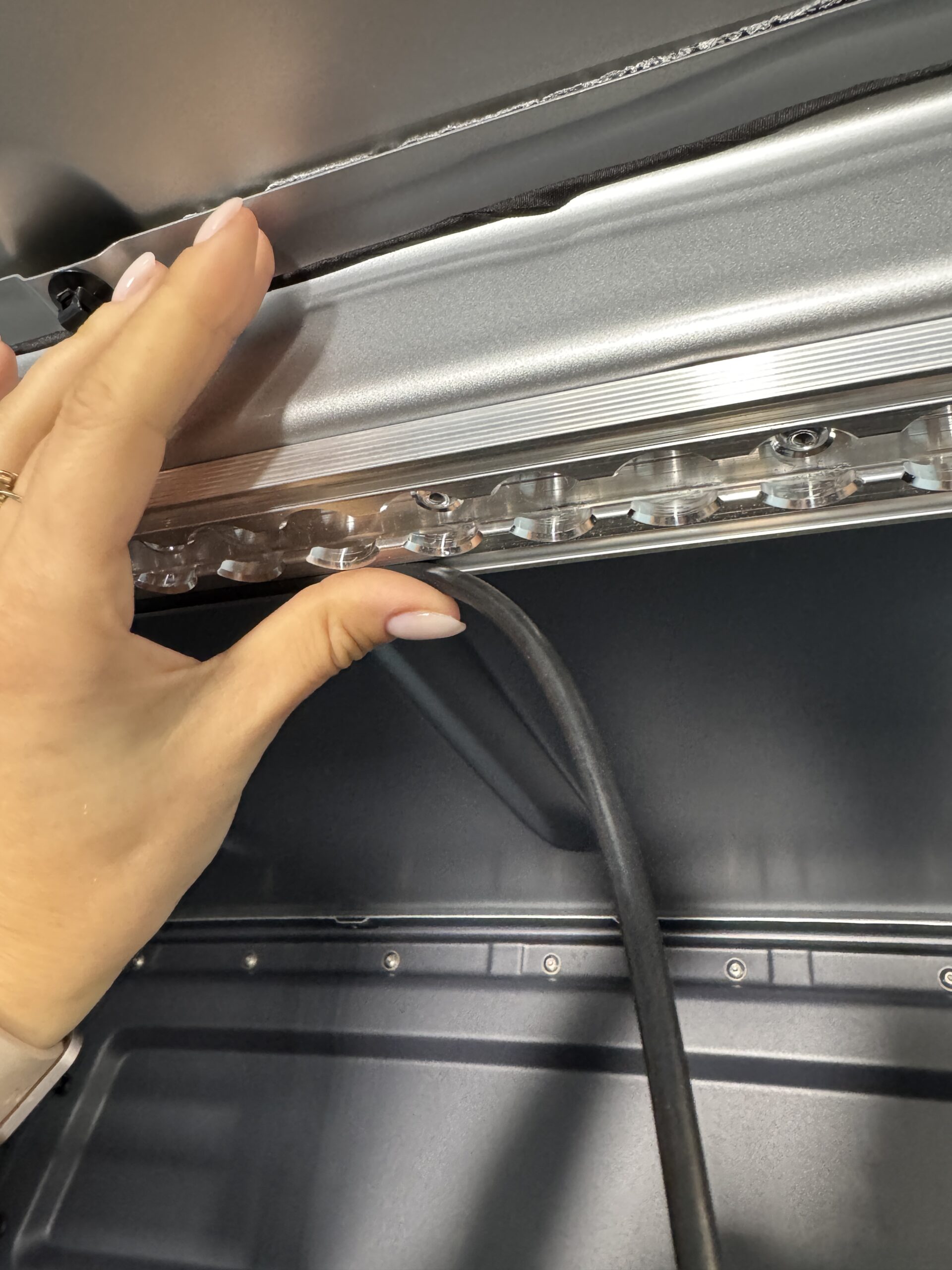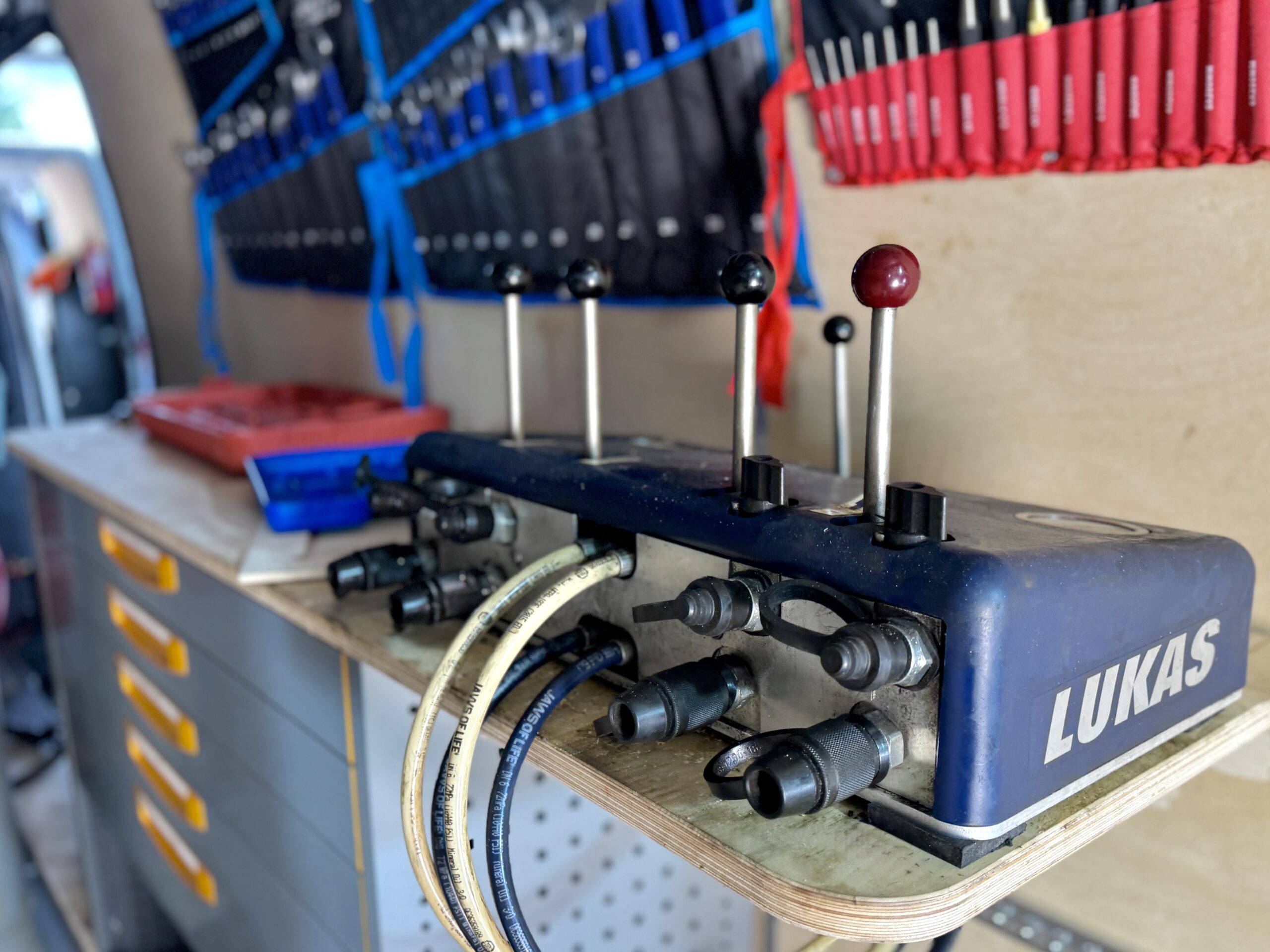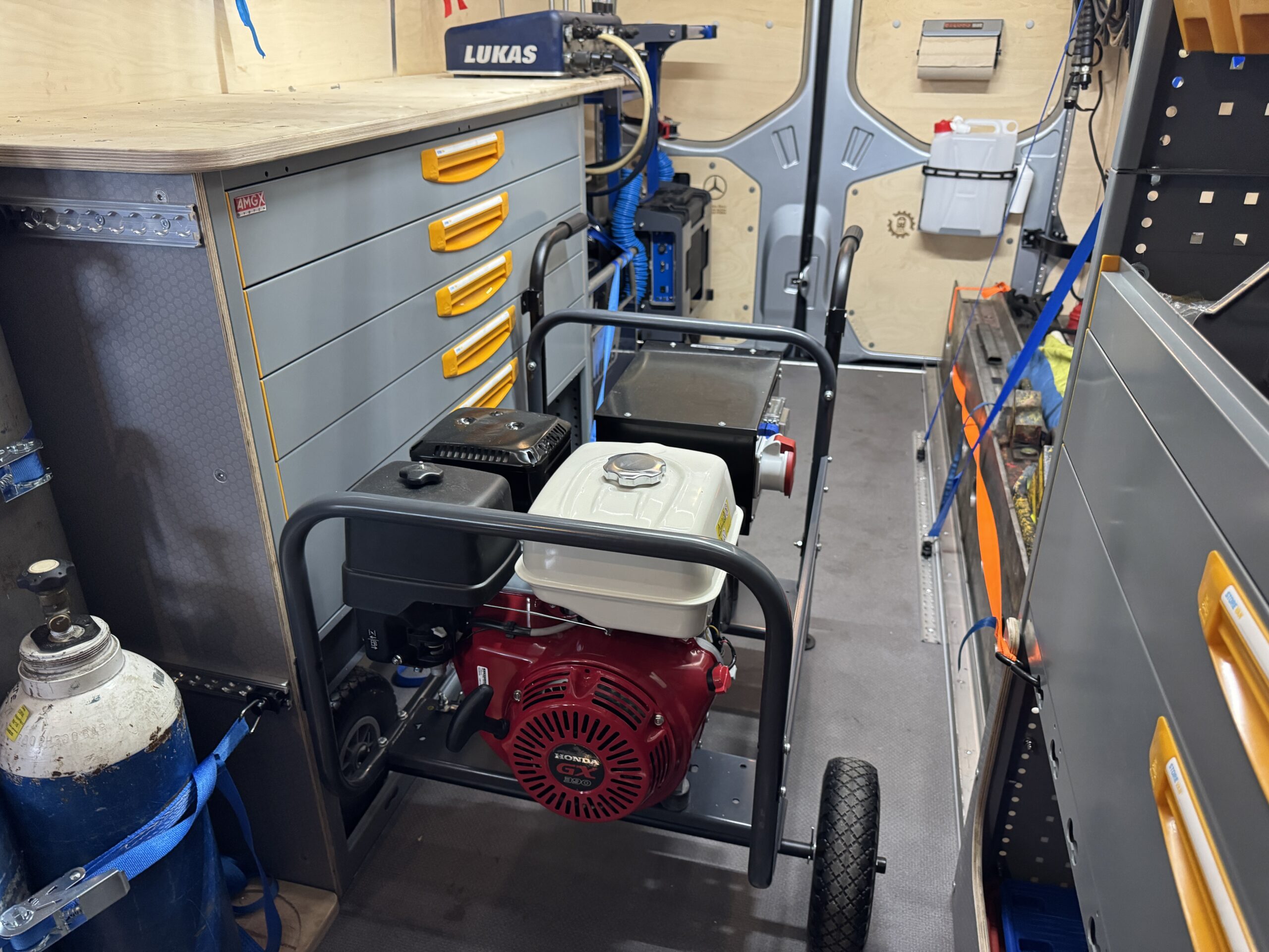 Obok blatu zaprojektowano specjalne miejsce na butlę, wykonane z wytrzymałej, 20‑mm sklejki. Umieściliśmy również funkcjonalna skrzynię na drewniane klocki podporowe. Lewarki zamocowaliśmy na progu przy bocznych drzwiach. Do listwy airline zamontowaliśmy haki na kable z możliwością przekładania. Szyny kolejowe umieściliśmy na płycie PE-HD (PE300), zapewniającej wytrzymałość i łatwe przesuwanie ciężkich elementów. Całość zabezpieczyliśmy ceownikiem nierdzewnym. Drabinę umieszczono pod sufitem na listwach Wistra, mocując ją automatycznymi pasami montażowymi.