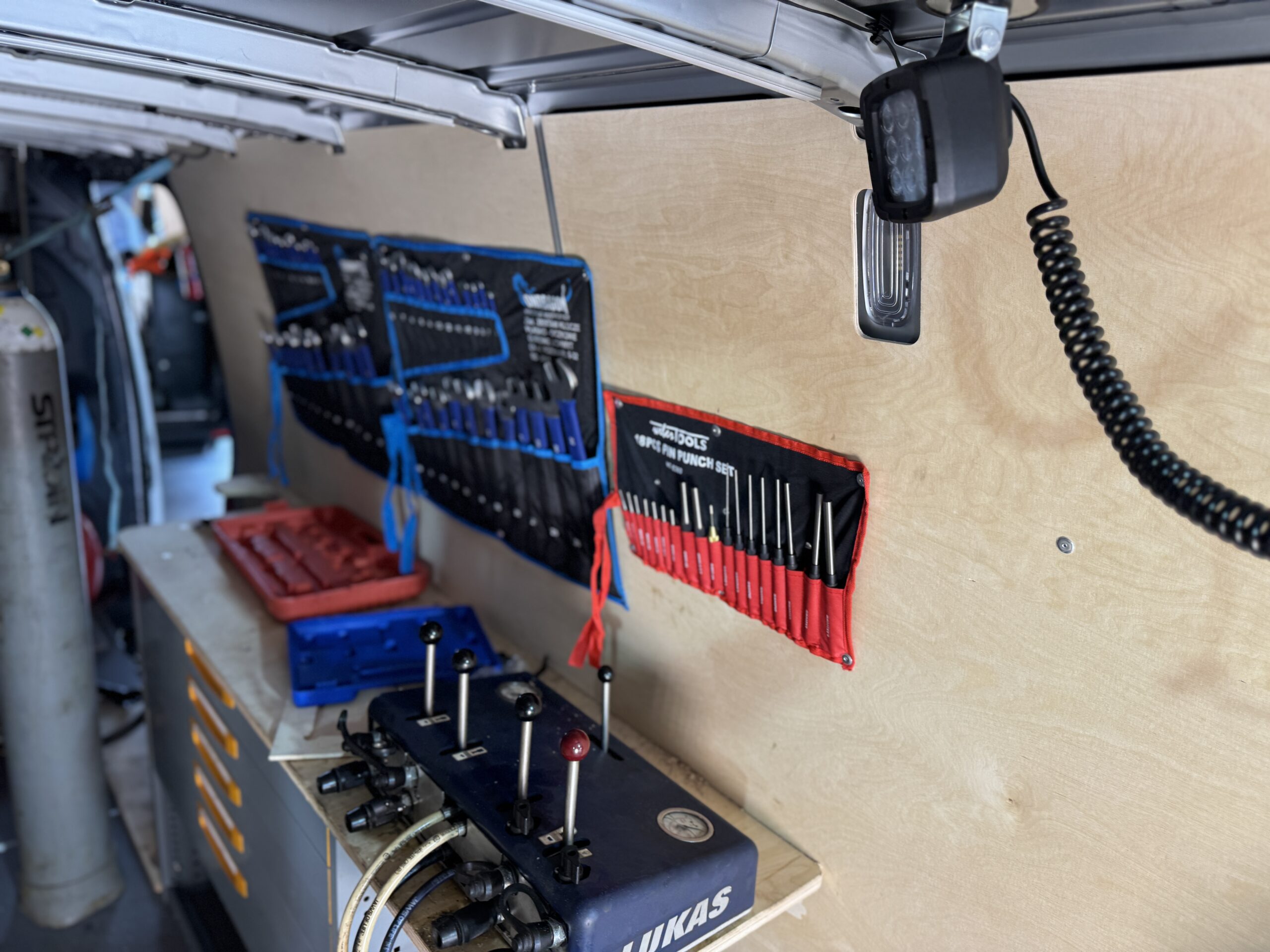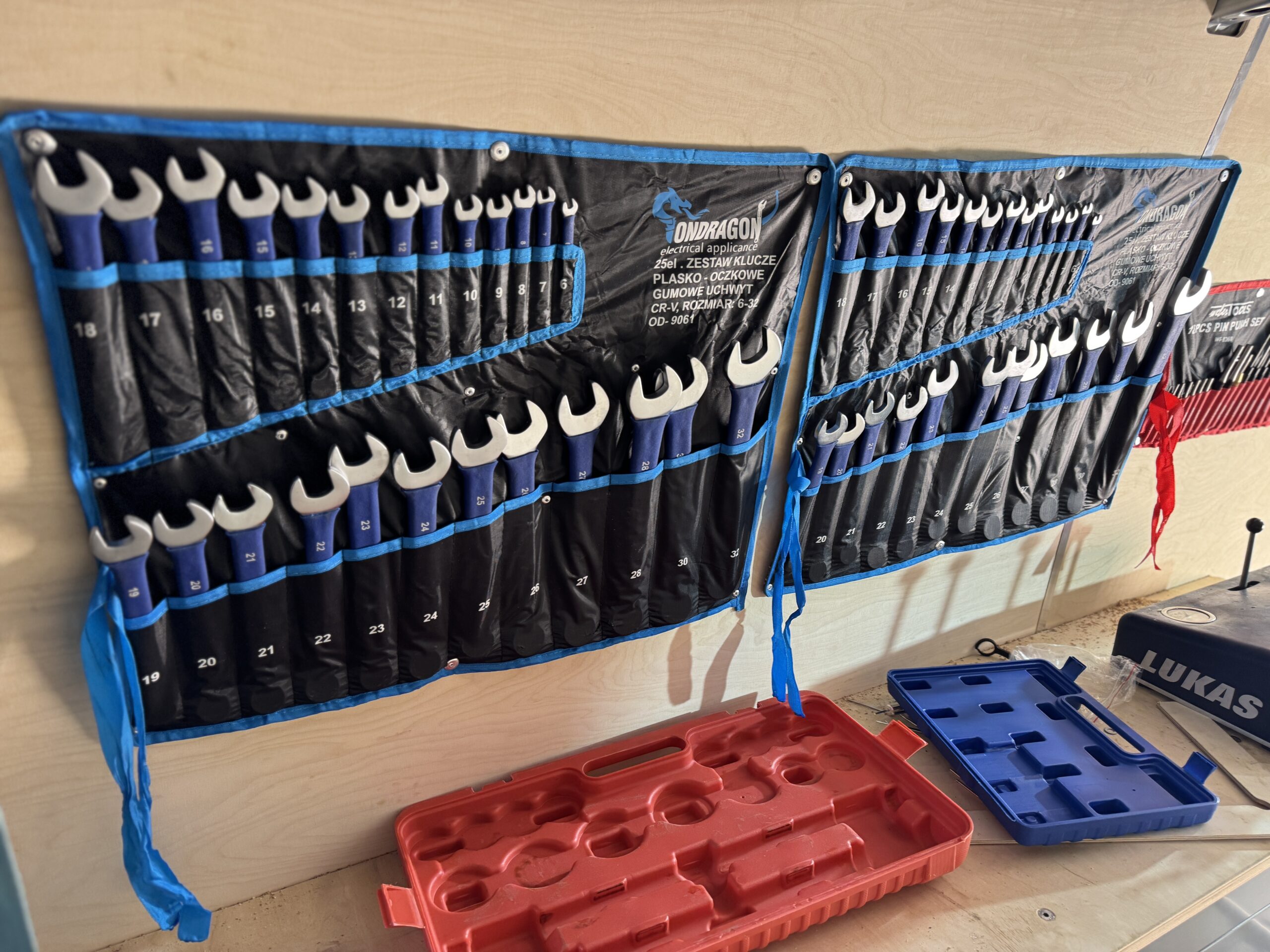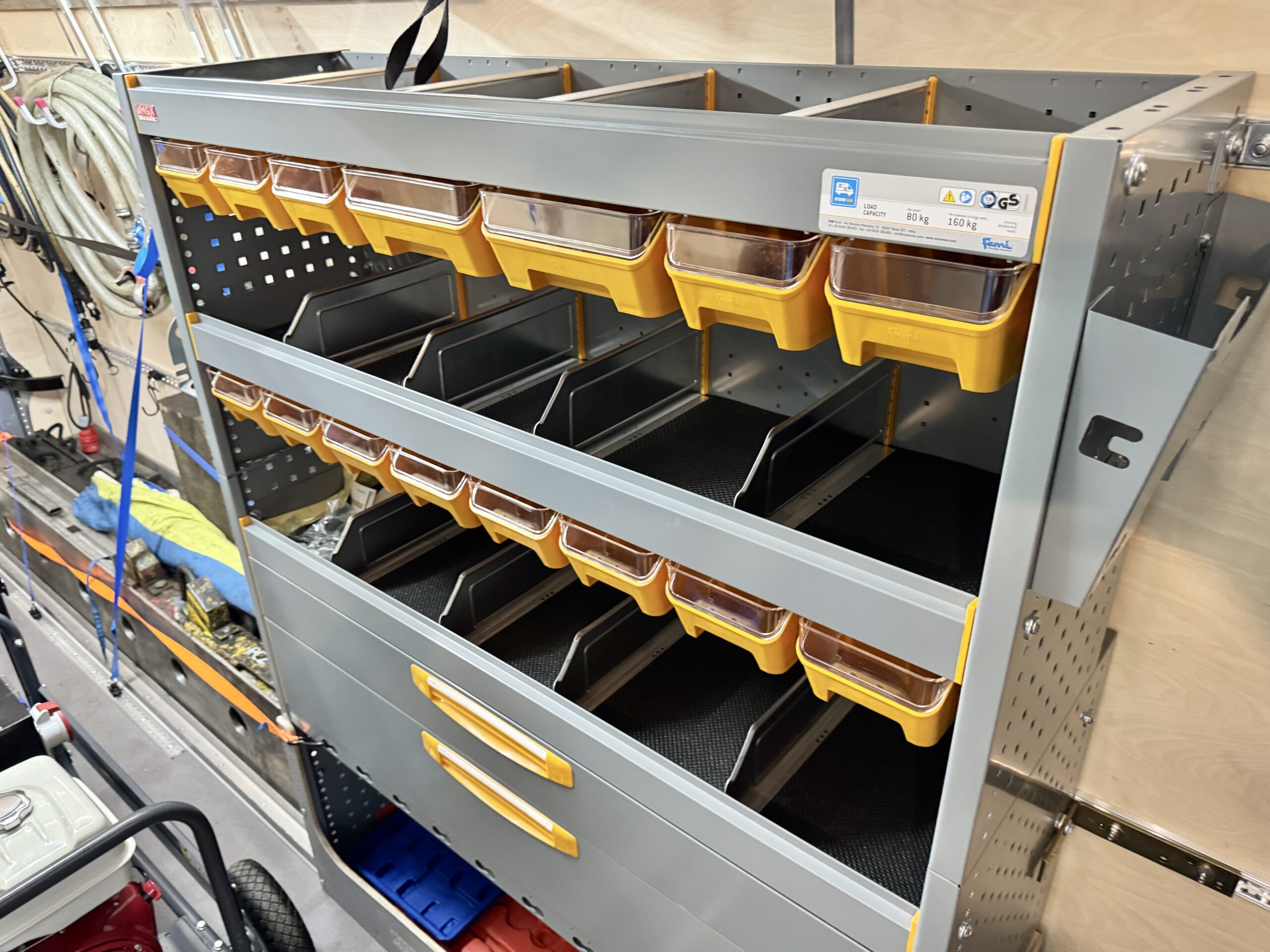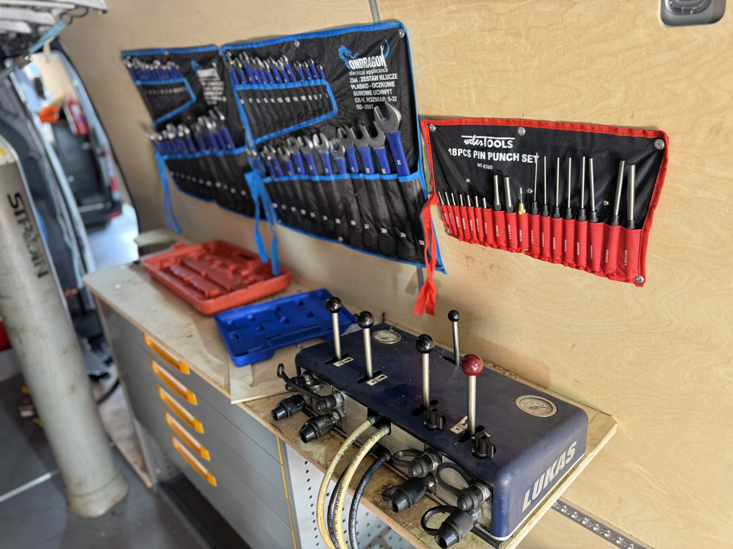 Zamontowaliśmy regały oraz blat roboczy renomowanej firmy StoreVan, które wyróżniają się wysoką jakością wykonania i funkcjonalnością. Dzięki nim możliwe jest wygodne zorganizowanie różnego rodzaju narzędzi.