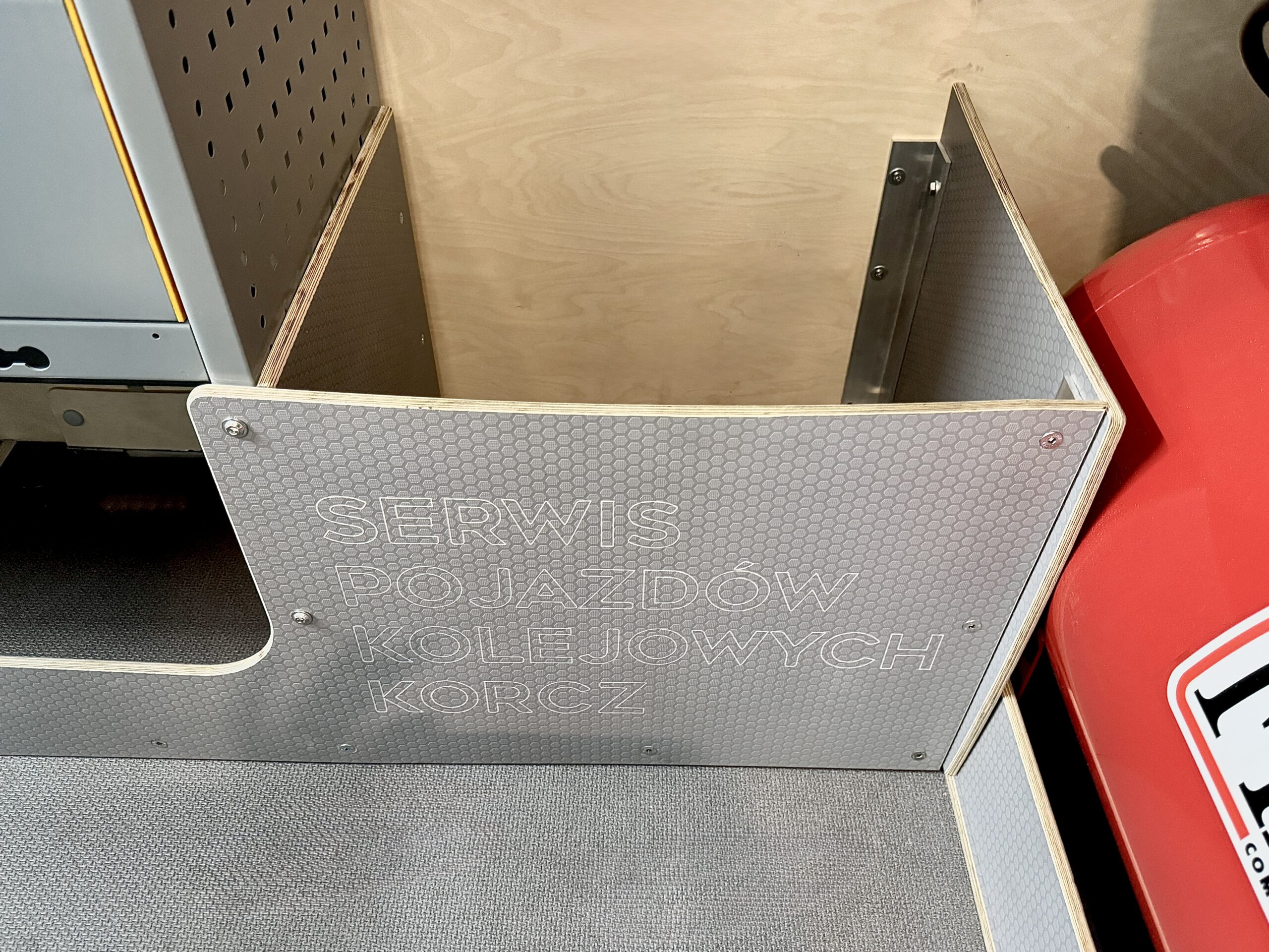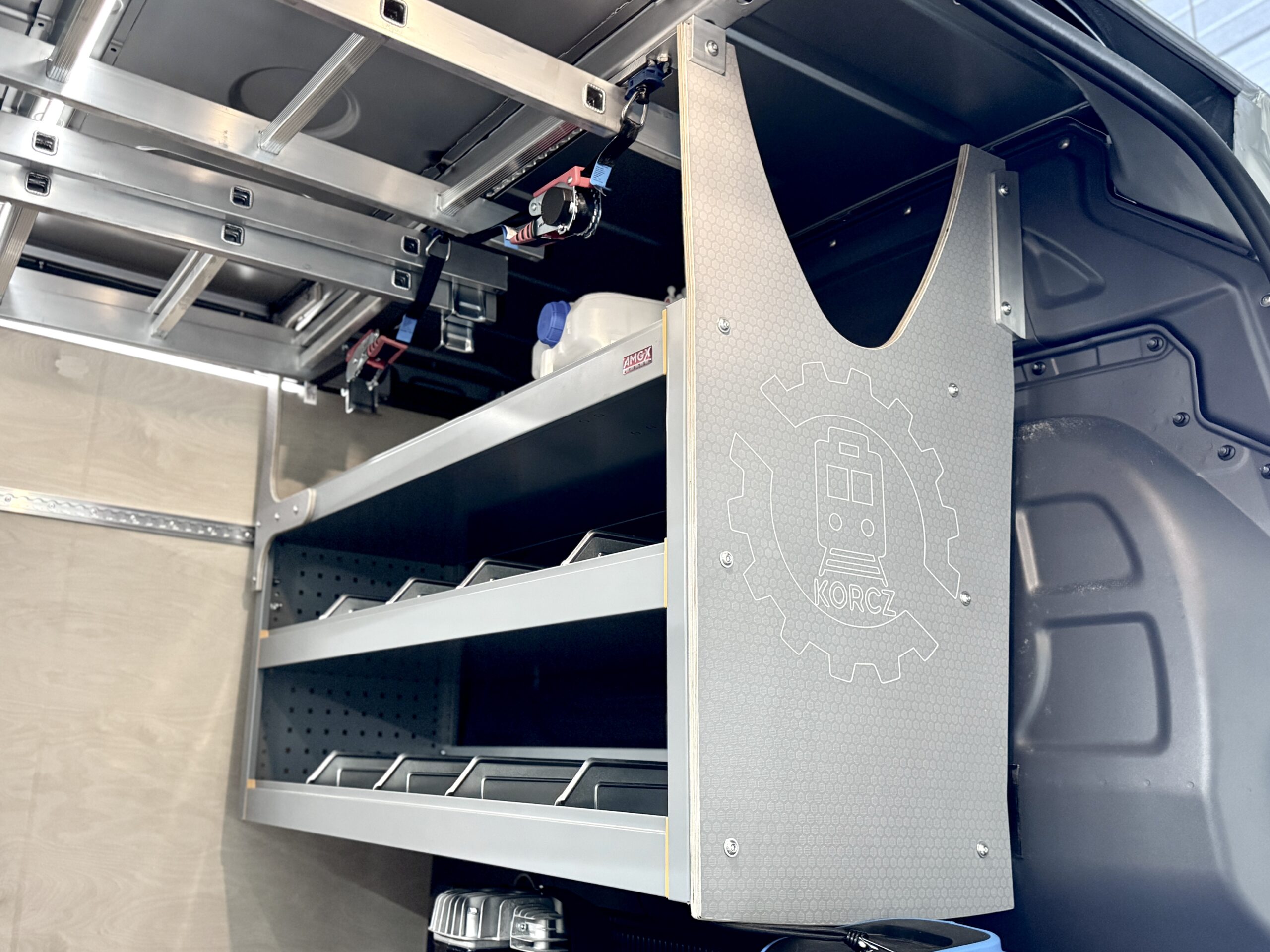Całość zabudowy Mercedesa Sprintera L4H2 dla firmy Korcz – Serwis Pojazdów Kolejowych – oparliśmy jest na ściankach bocznych wykonanych ze sklejki liściastej o grubości 6,5 mm. Taka konstrukcja zapewnia solidność, trwałość i bezpieczeństwo użytkowania.