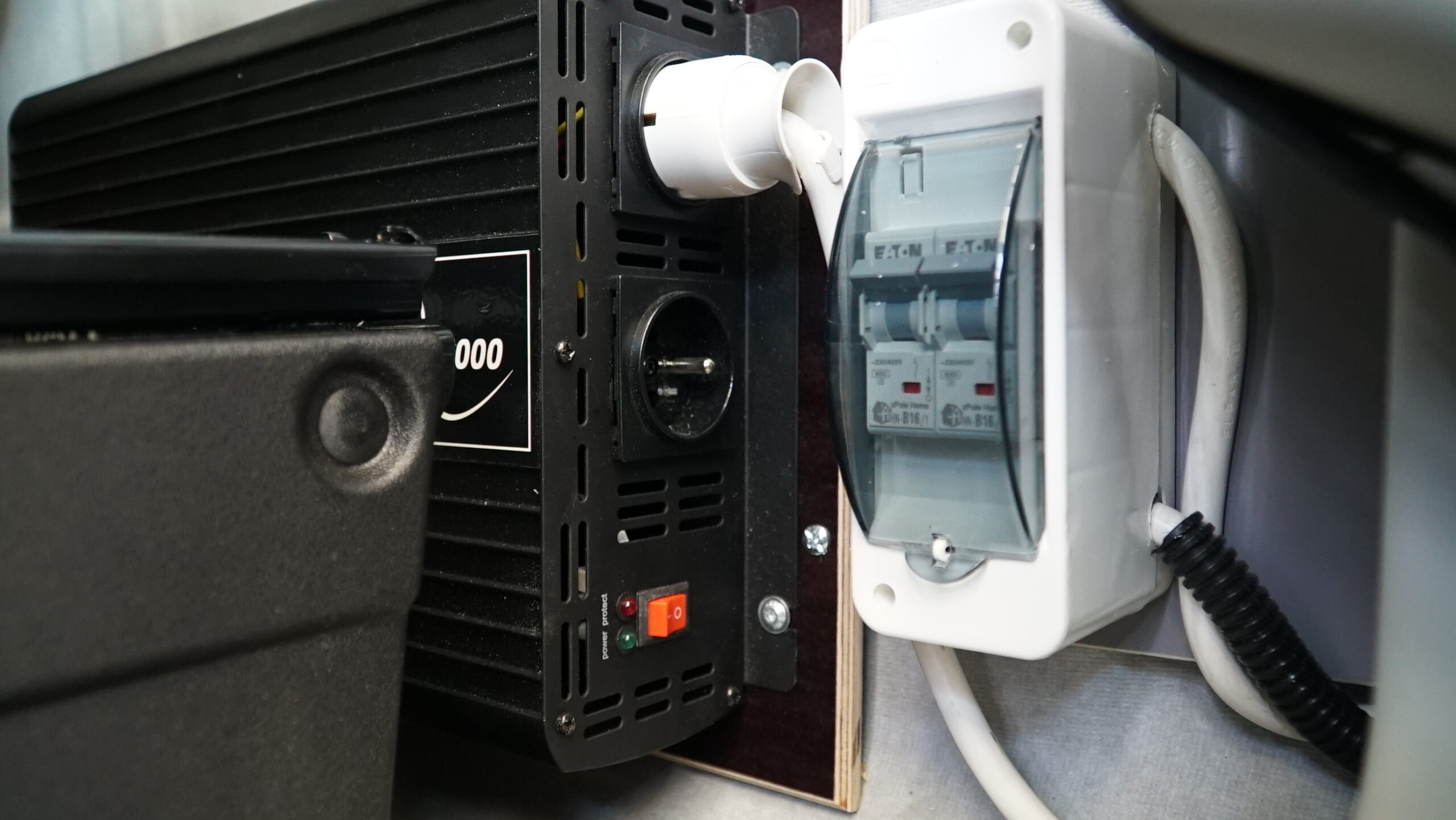 przetwornicę oraz rozdzielnicę z wyłącznikiem nadprądowym (za fotelem kierowcy),