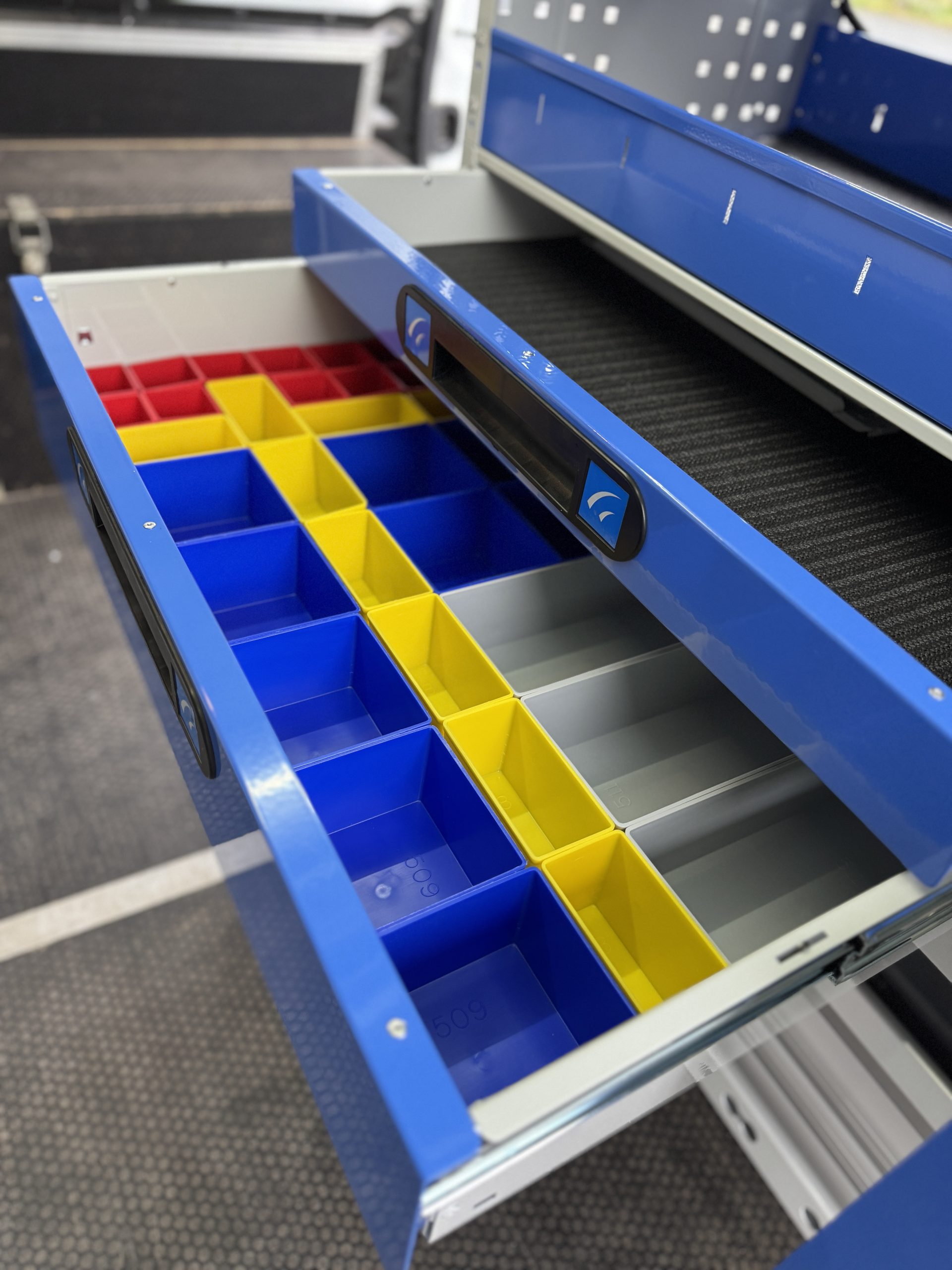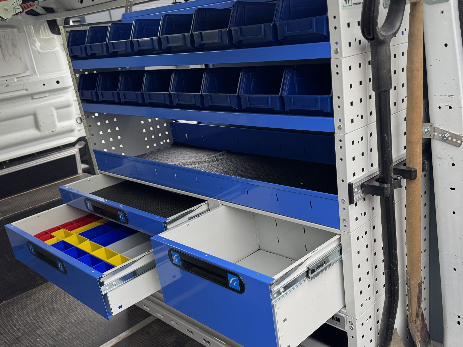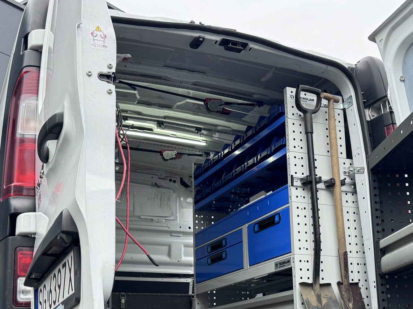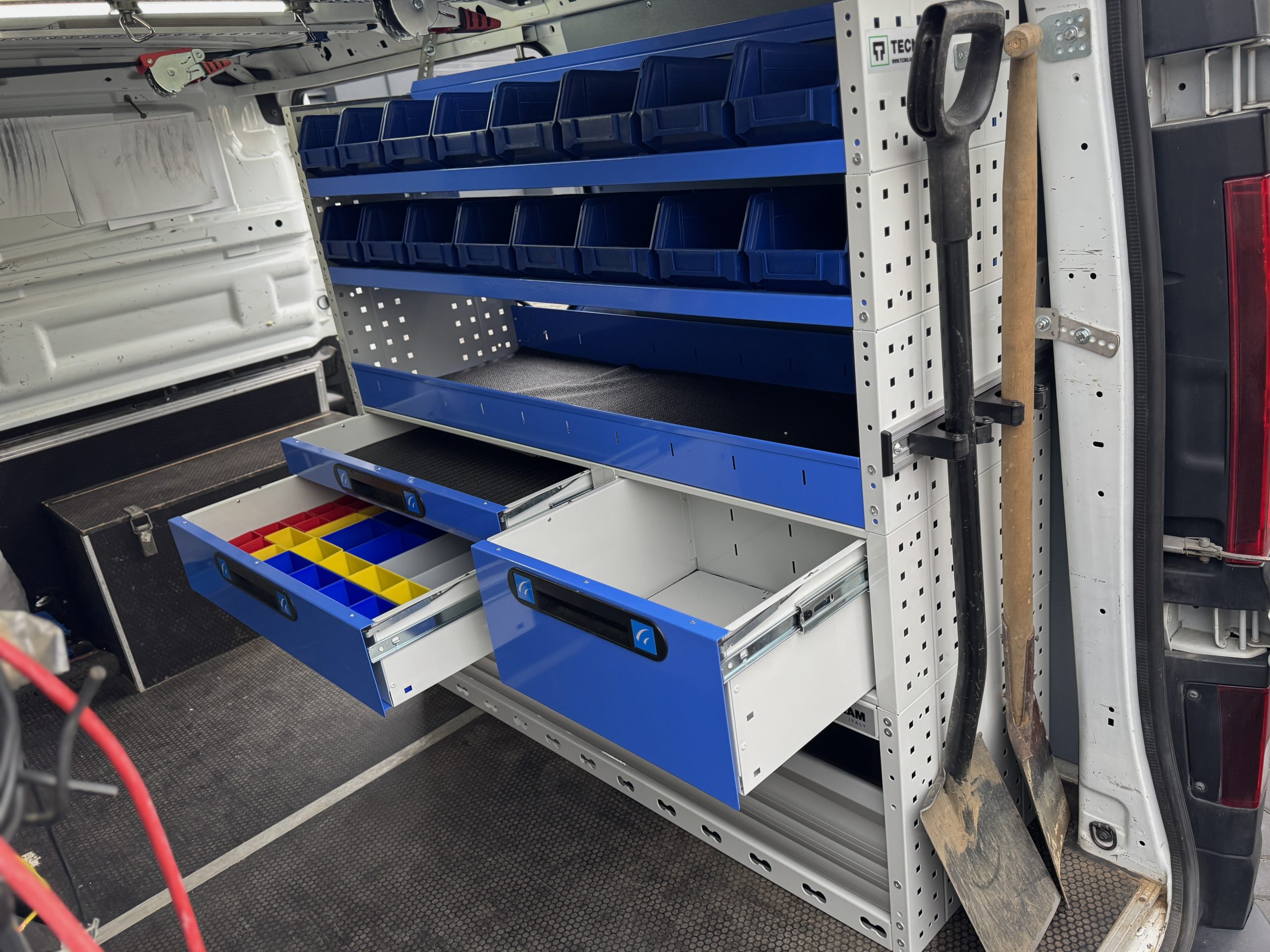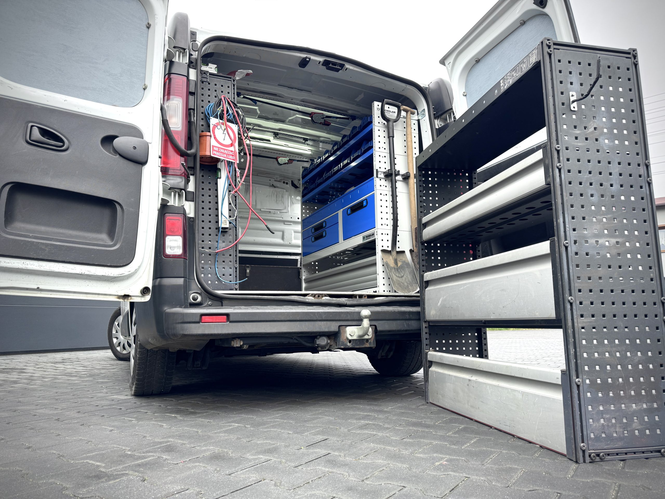 W tym projekcie wymieniliśmy stary regał na nowoczesny system włoskiej firmy Tecnolam, dopasowany do potrzeb użytkownika. Regał uzupełniliśmy o aluminiową listwę narzędziową z gumowymi uchwytami, umożliwiającą bezpieczne i wygodne przechowywanie łopat oraz kluczy hydraulicznych, przy jednoczesnej oszczędności miejsca.