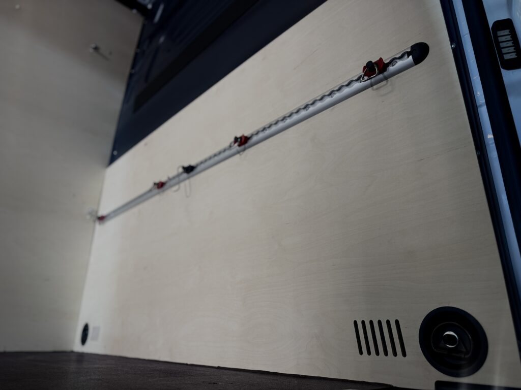 Ścianę grodziową zabezpieczyliśmy do połowy i umieściliśmy na niej listwę airline z uchwytami do mocowania ładunków oraz praktycznym wieszakiem na ubrania. To rozwiązanie gwarantuje, że przewożone ładunki pozostaną na swoim miejscu, bez ryzyka przesunięć czy uszkodzeń – wszystko jest solidnie i bezpiecznie zabezpieczone.