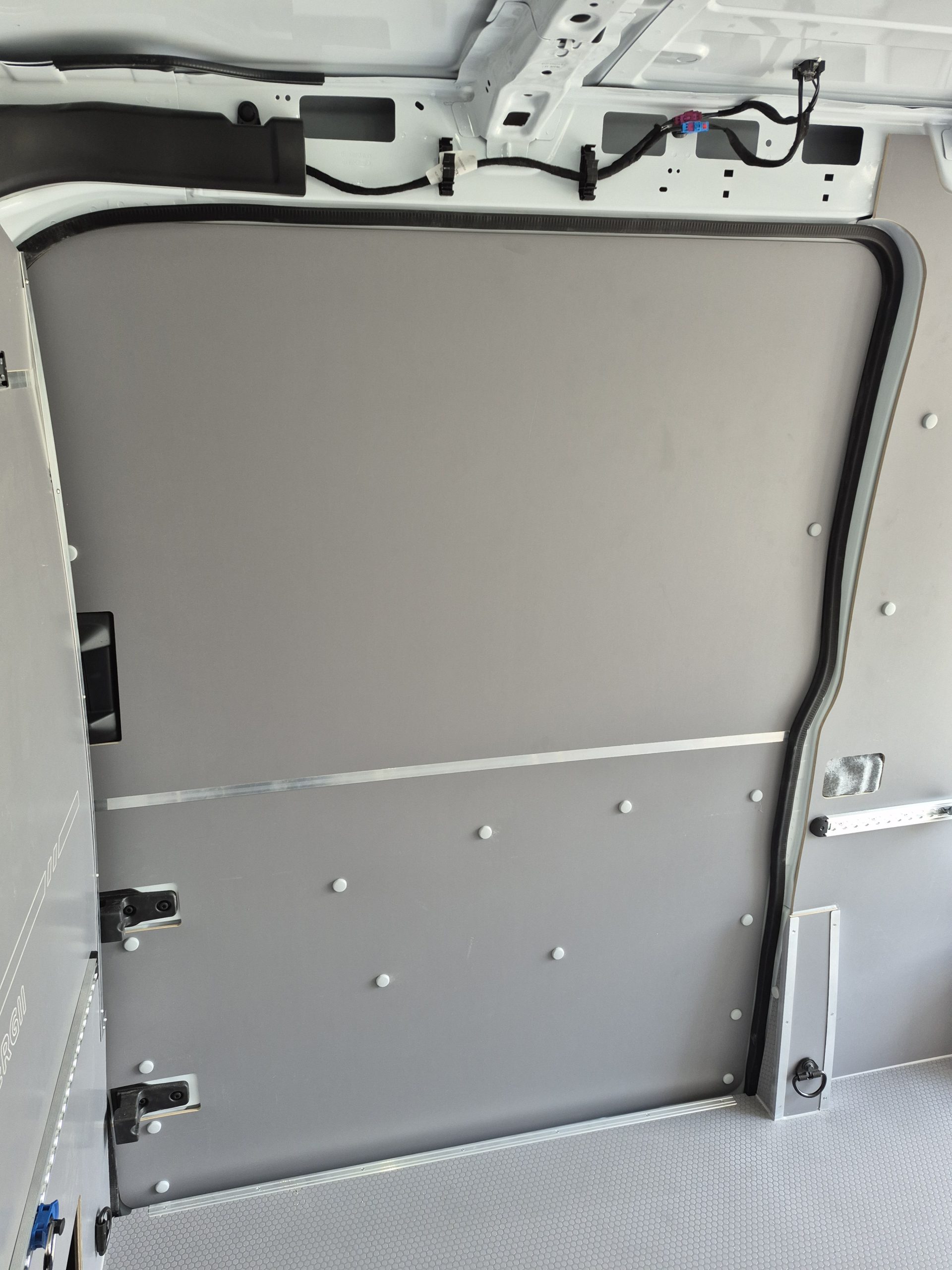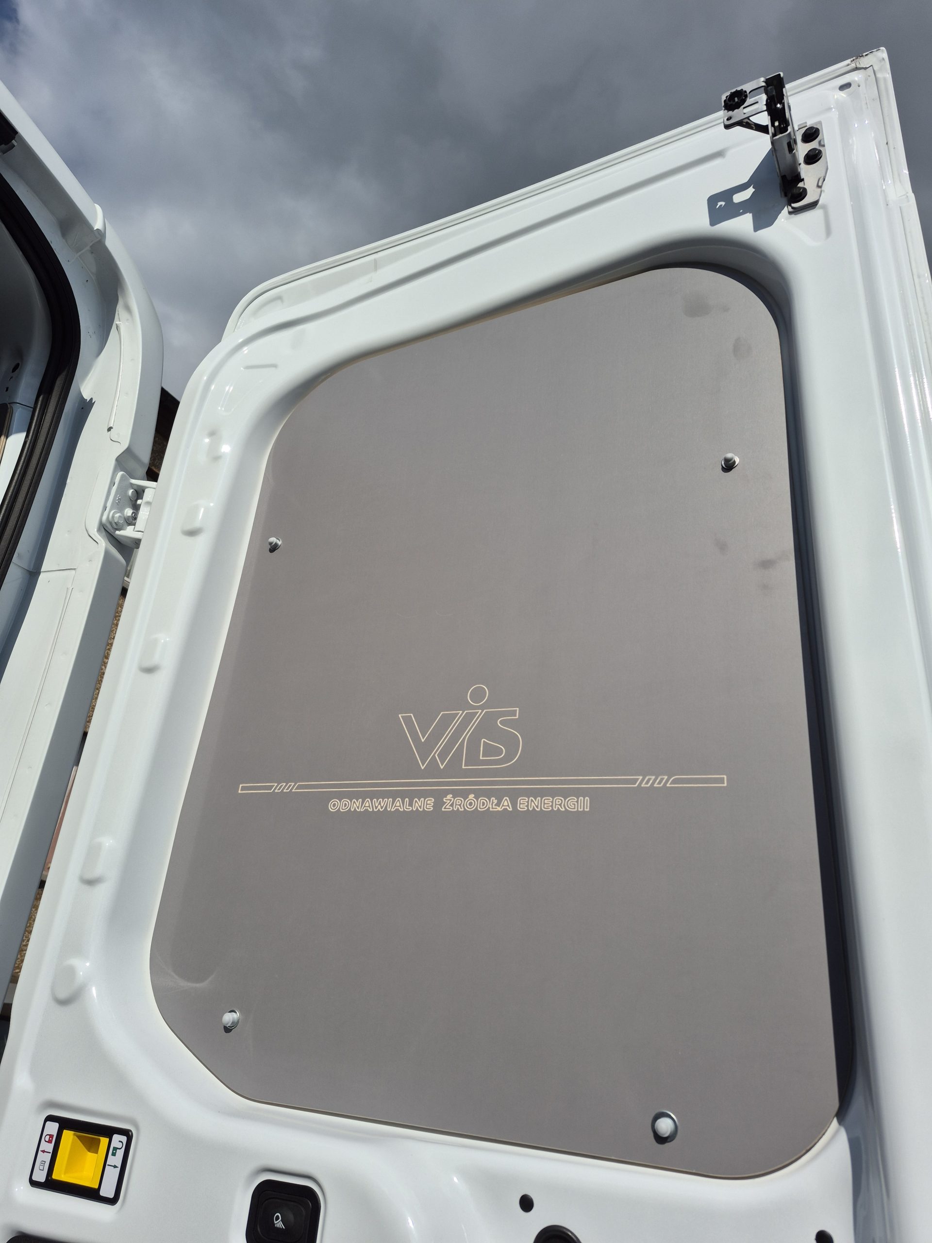W ścianie grodziowej wycięliśmy otwór i wykonaliśmy przesuwne drzwiczki rewizyjne w celu powiększenia przestrzeni ładunkowej. Klient będzie przewoził elementy – profile o długości 4 metrów. Fabryczna ściana grodziowa została wykonana ze słabego, klejonego materiału, dlatego musieliśmy ją wzmocnić, zabezpieczając ją laminowaną sklejką.