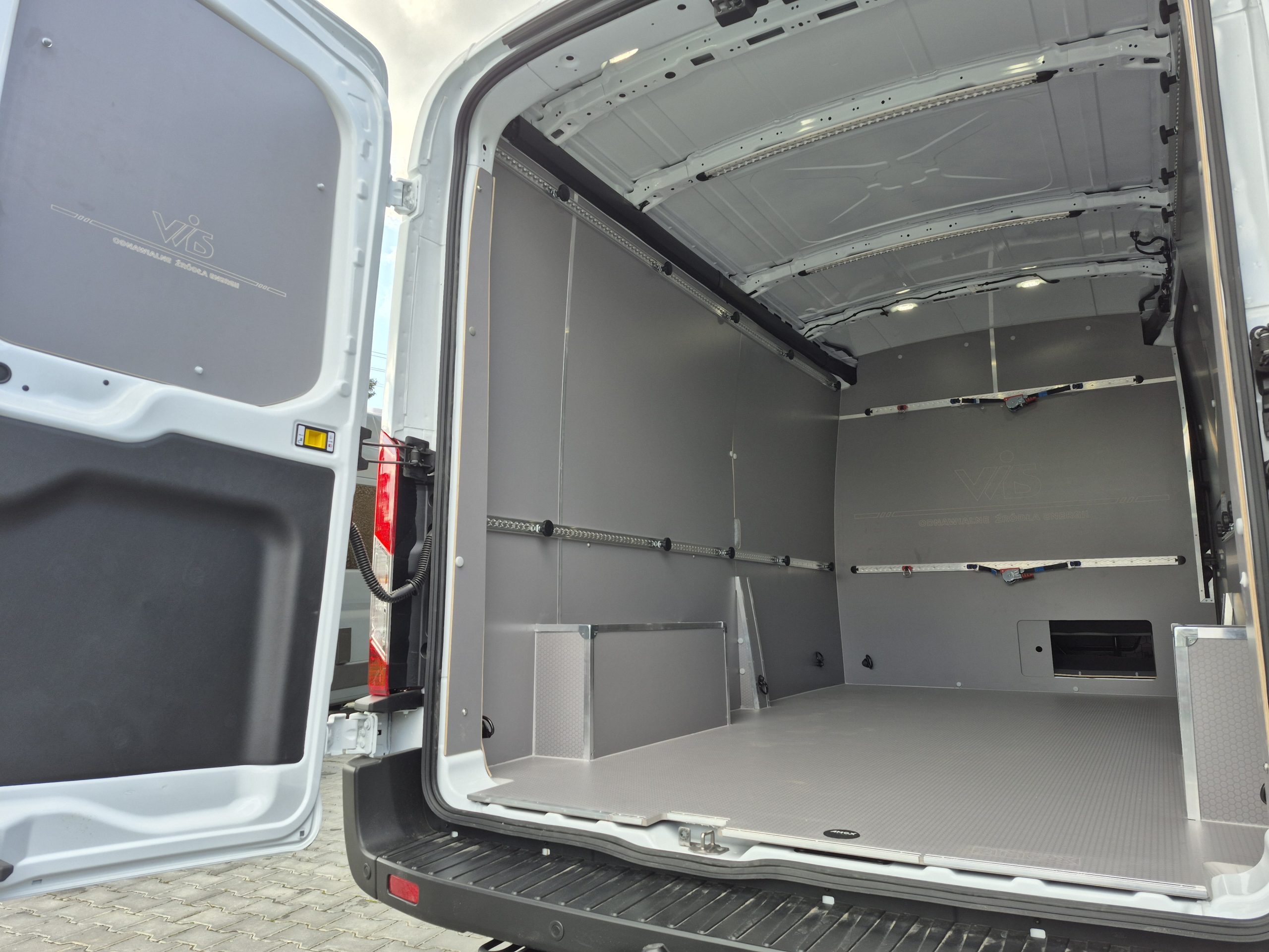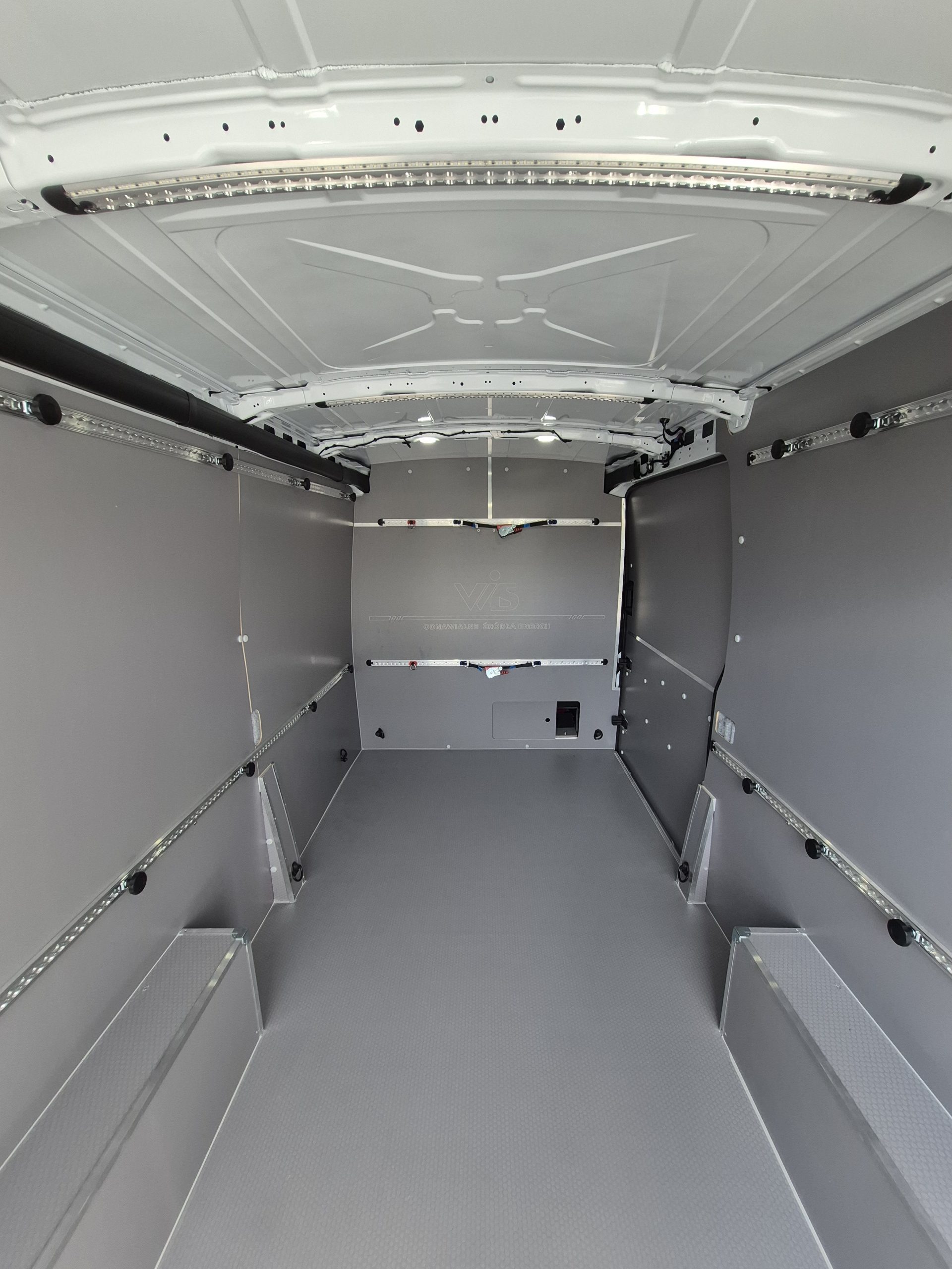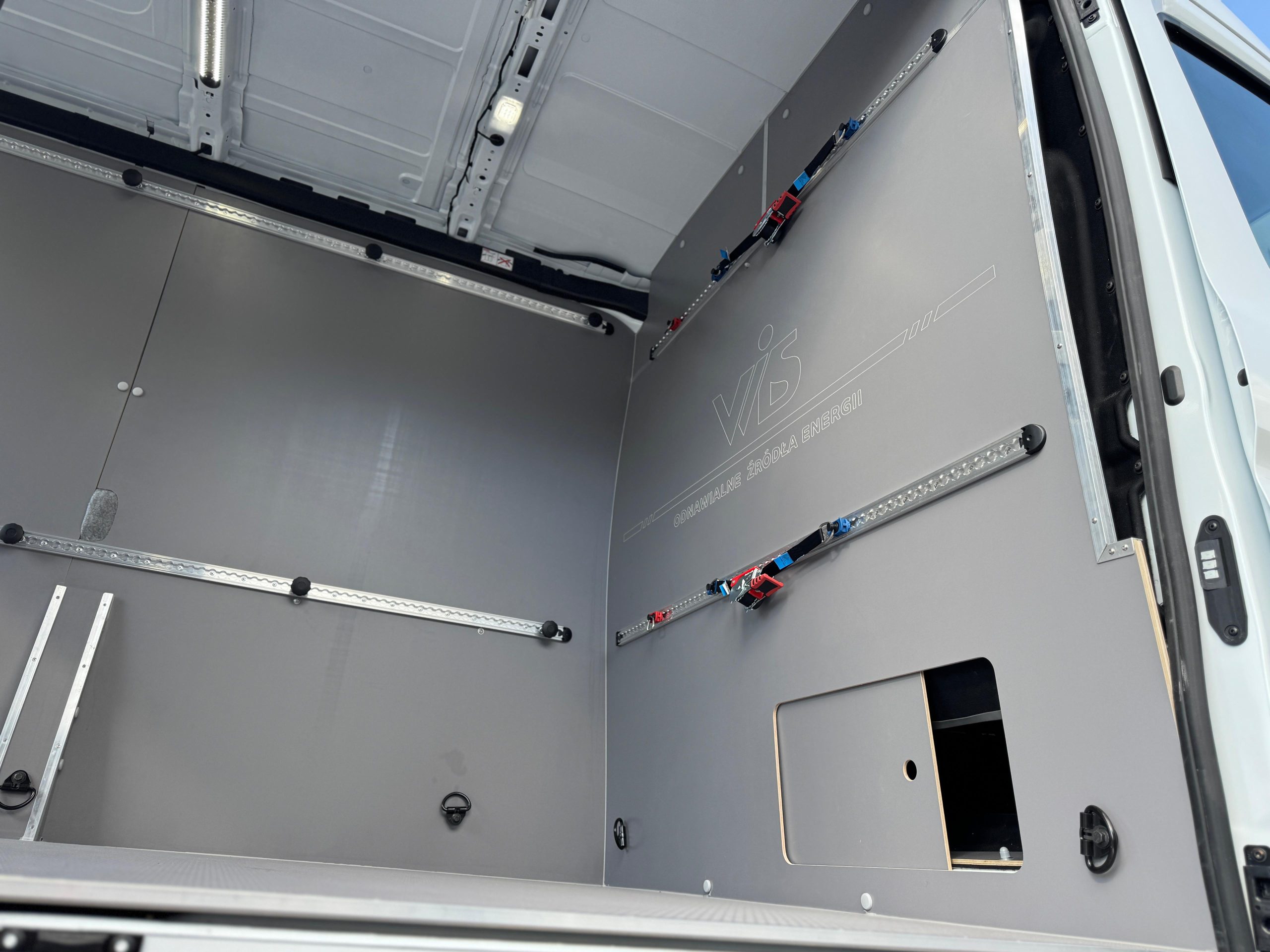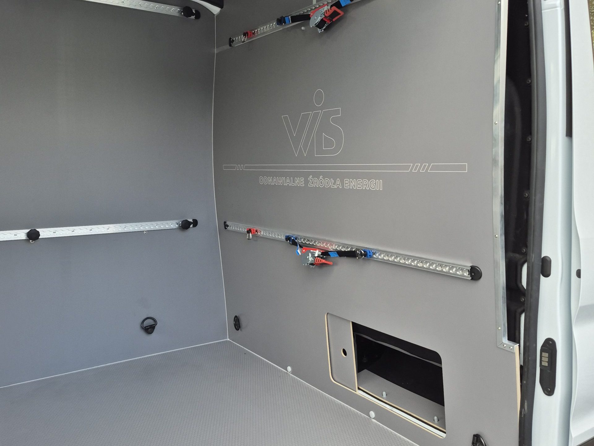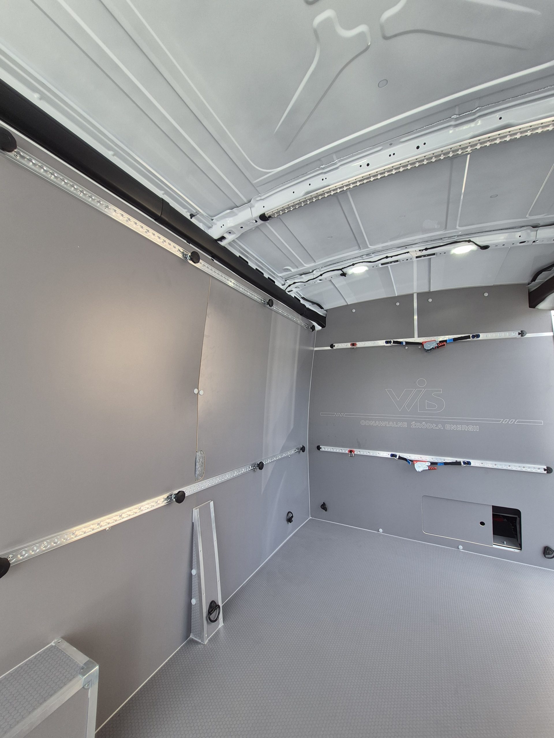 Na suficie zamontowano specjalne listwy LED, które zapewniają dobre oświetlenie przestrzeni ładunkowej. Na ścianach bocznych oraz ścianie grodziowej, na dwóch poziomach, zamontowaliśmy listwy mocujące ładunek typu Airline oraz specjalistyczne uchwyty motylkowe z możliwością przesuwania, ponieważ klient planuje w tym miejscu montaż własnych regałów.