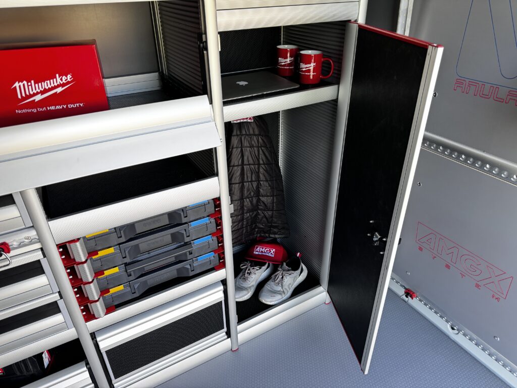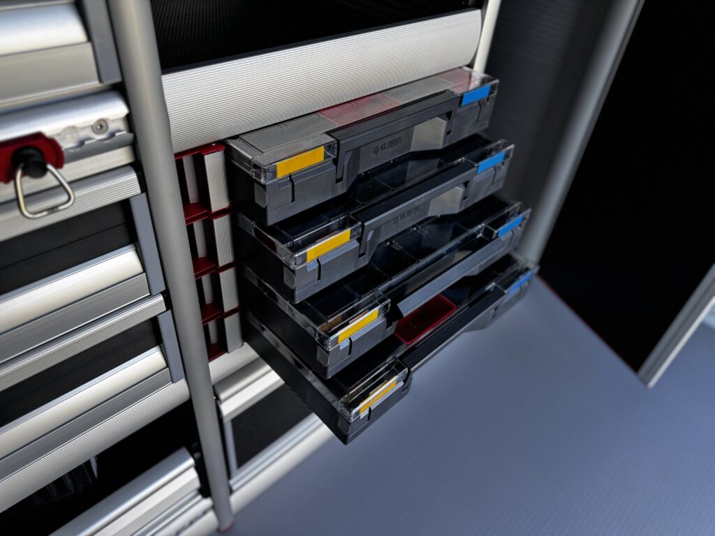 Regały GEMA zostały wyposażone w modułowe walizki i szuflady z innowacyjnym systemem otwierania, który umożliwia łatwy i szybki dostęp do narzędzi i sprzętu. System ten pozwala na elastyczne zarządzanie przestrzenią, co ułatwia organizację i zapewnia porządek w przestrzeni ładunkowej. Modułowe walizki można łatwo wyjmować i przenosić, co zwiększa mobilność i wygodę pracy w różnych miejscach.