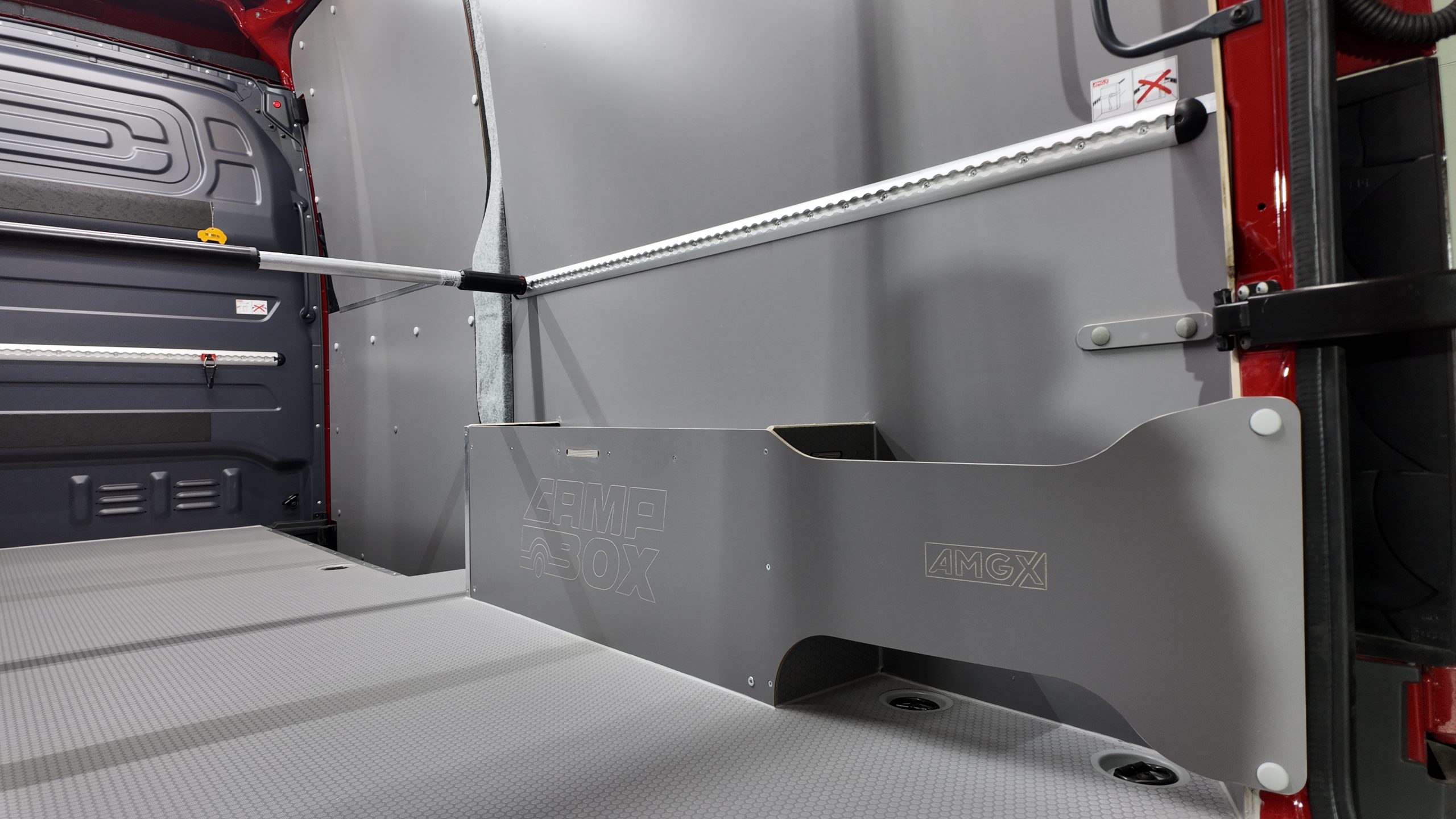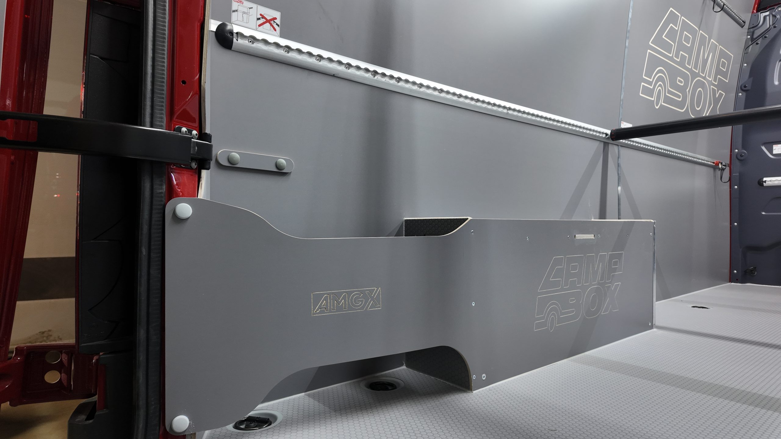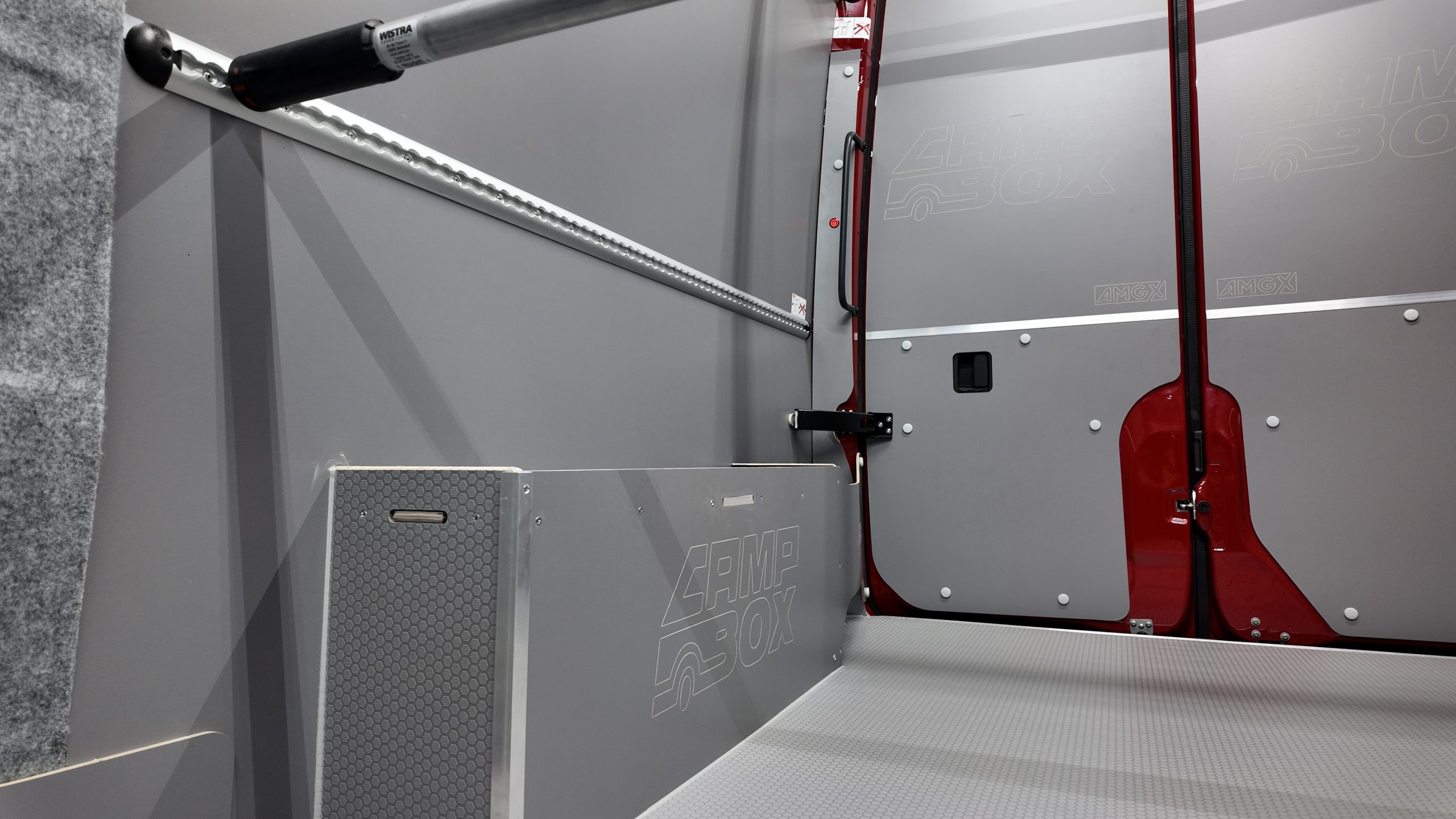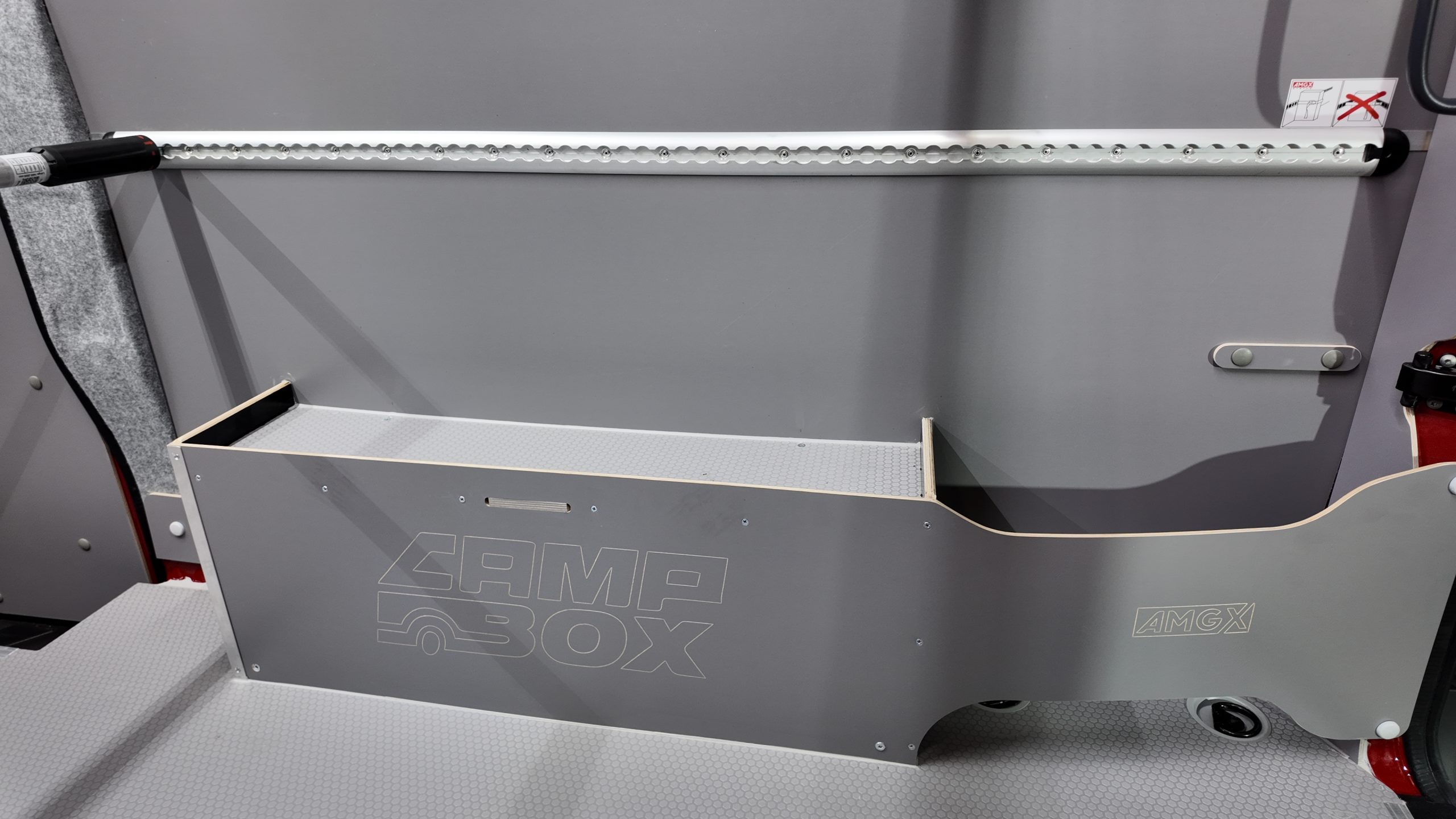 Wykonaliśmy grawerowanie logo CampBox, co podkreśla profesjonalny charakter zabudowy. Dodatkowo w kokpicie kierowcy zamontowaliśmy lampkę kontrolną informującą o stanie oświetlenia wnętrza pojazdu.