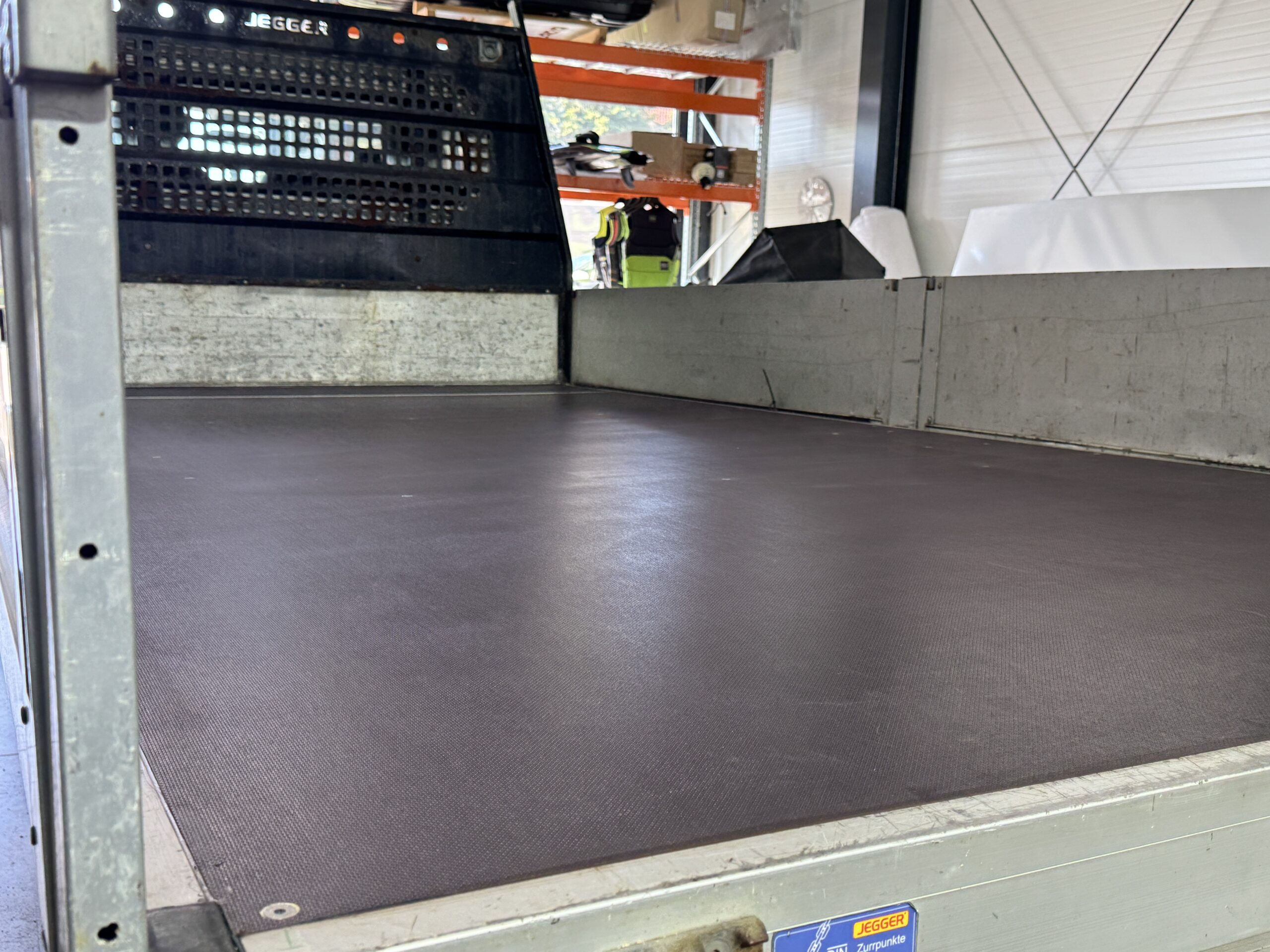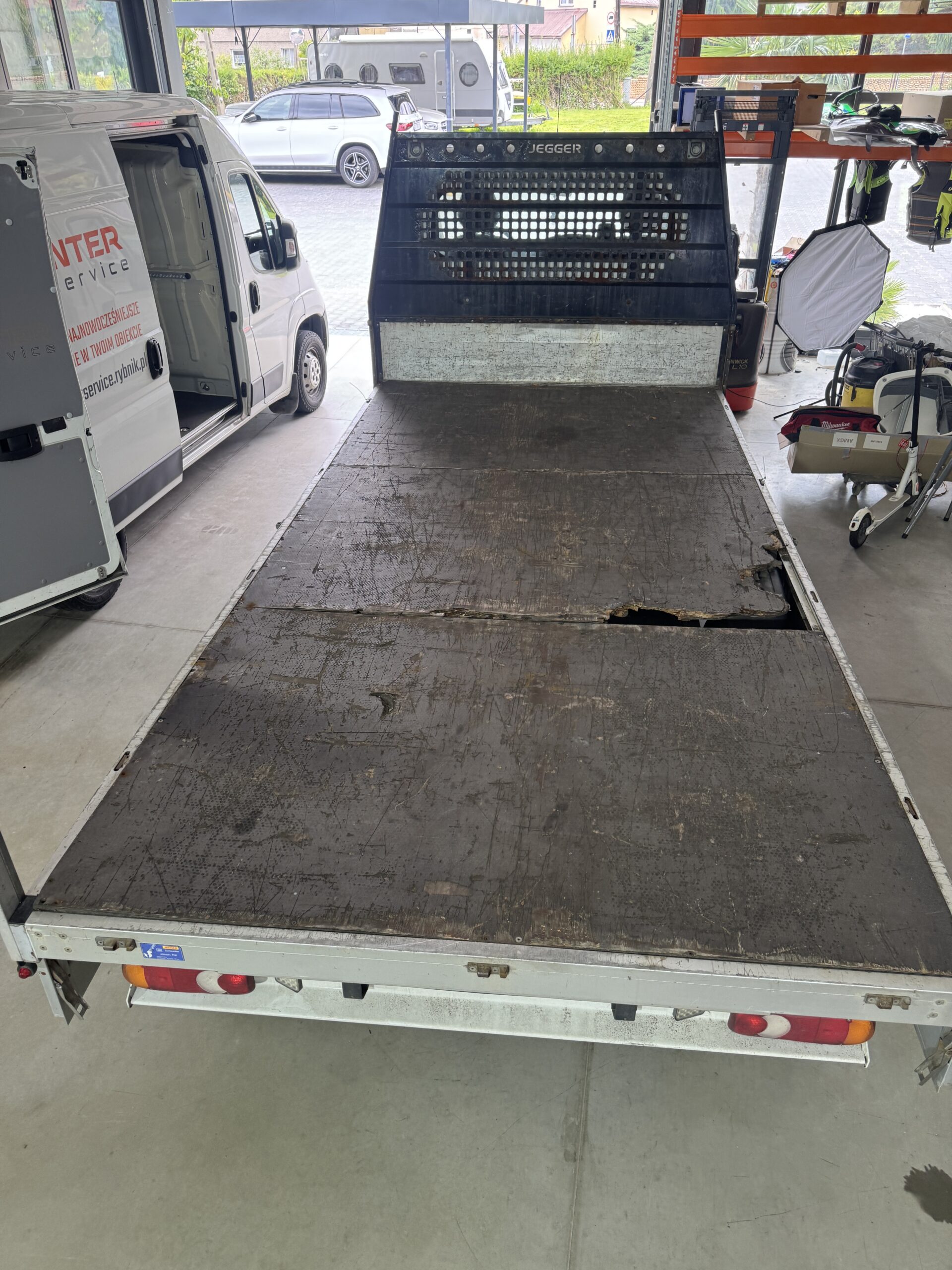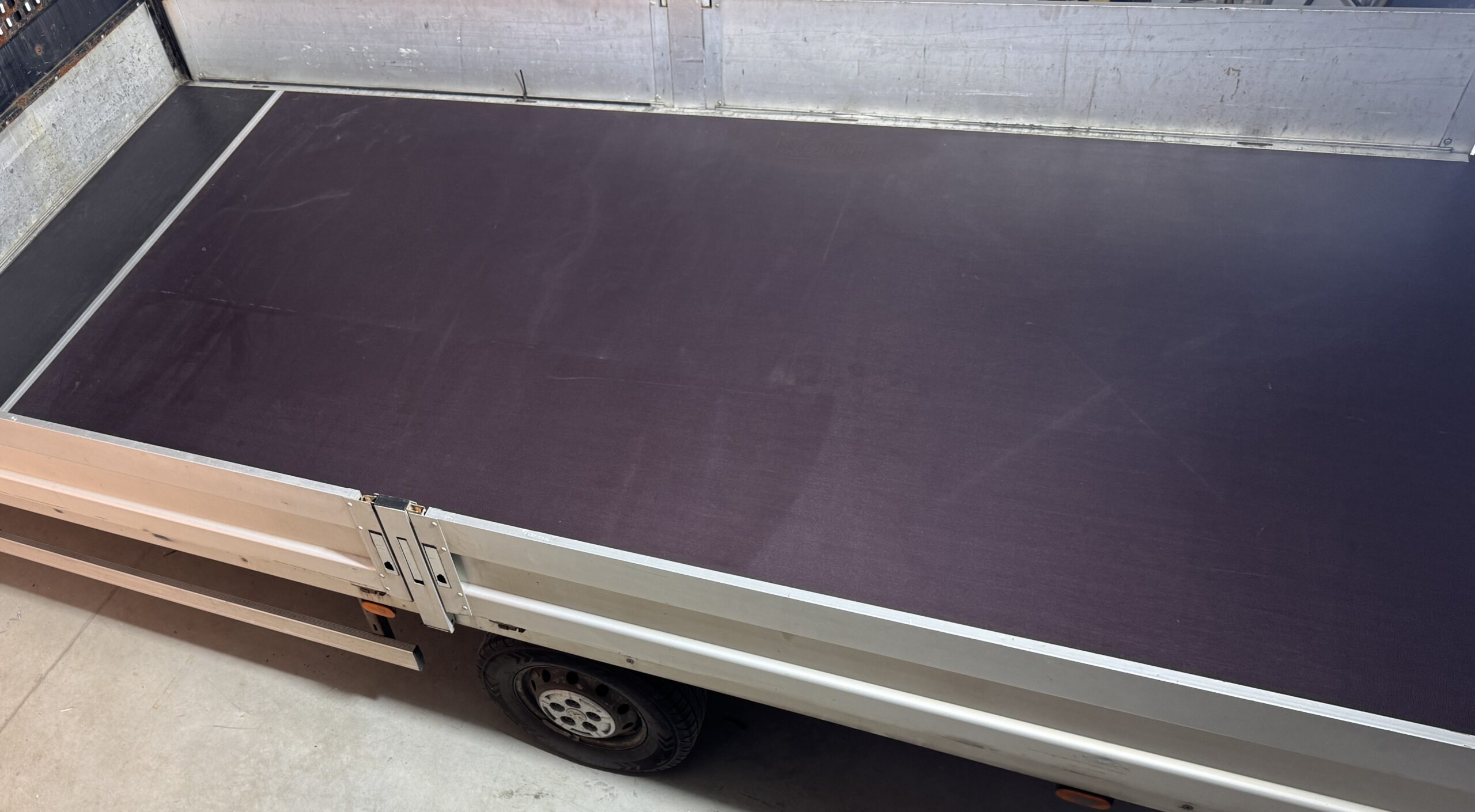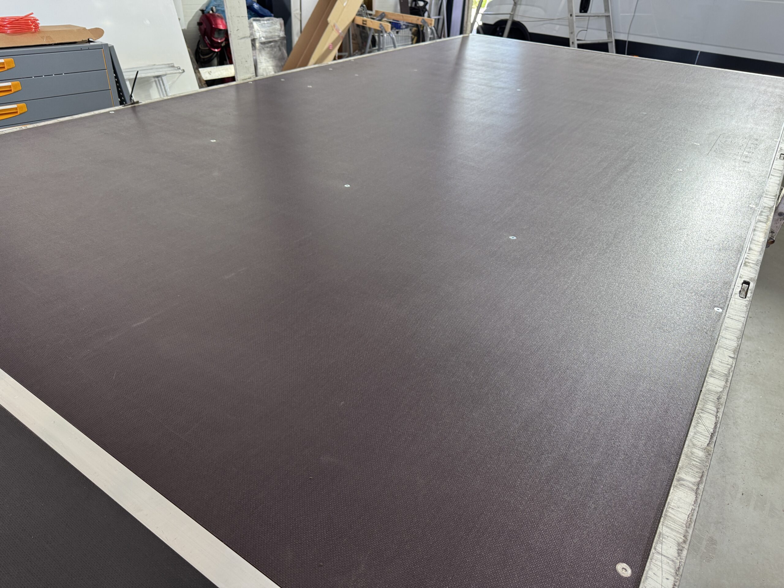 Zastosowaliśmy nową podłogę wykonaną z solidnej sklejki o grubości 18 mm, połączonych aluminiową listwą łączącą. Takie rozwiązanie gwarantuje trwałość, estetykę oraz jednolitą i wytrzymałą powierzchnię.