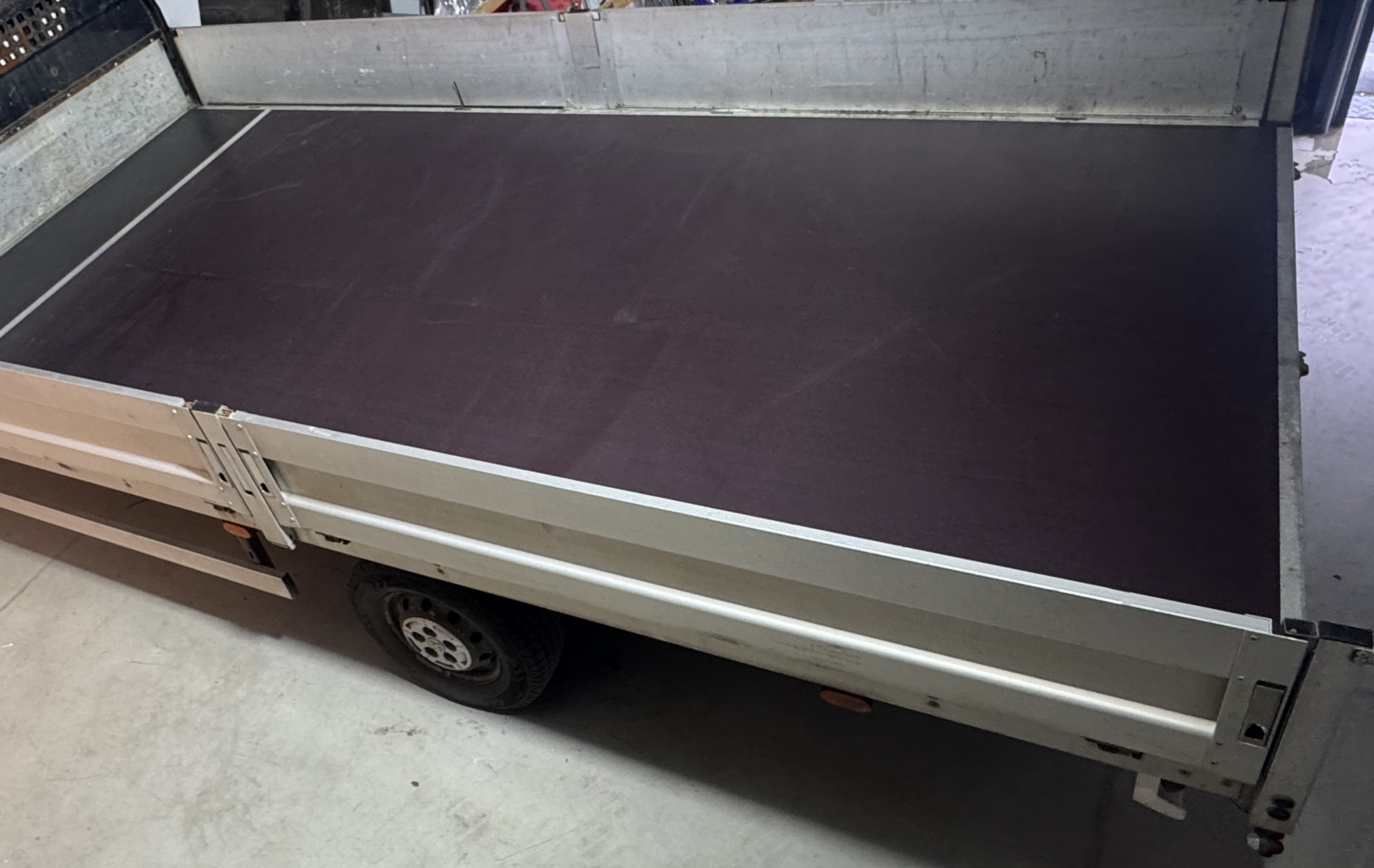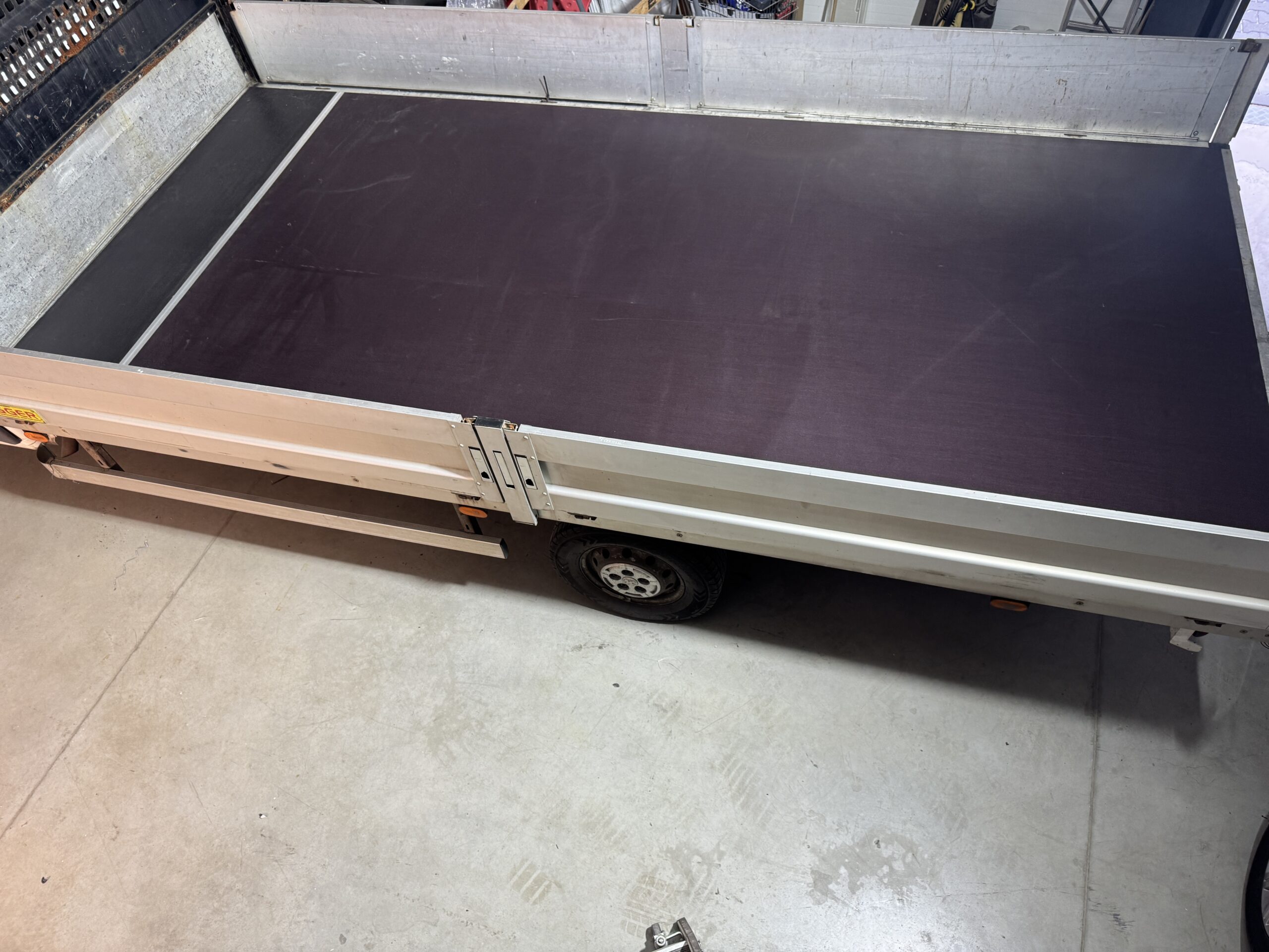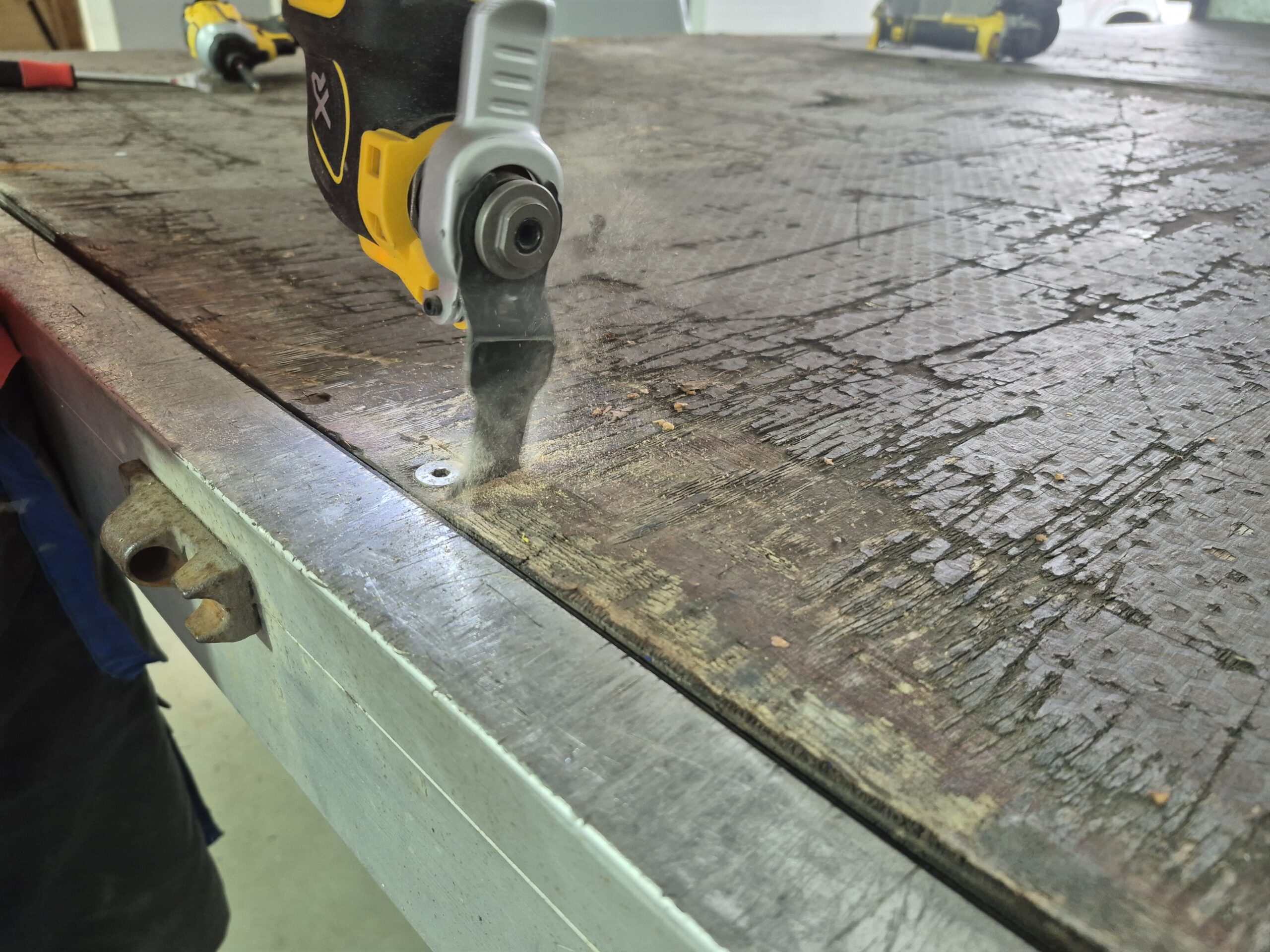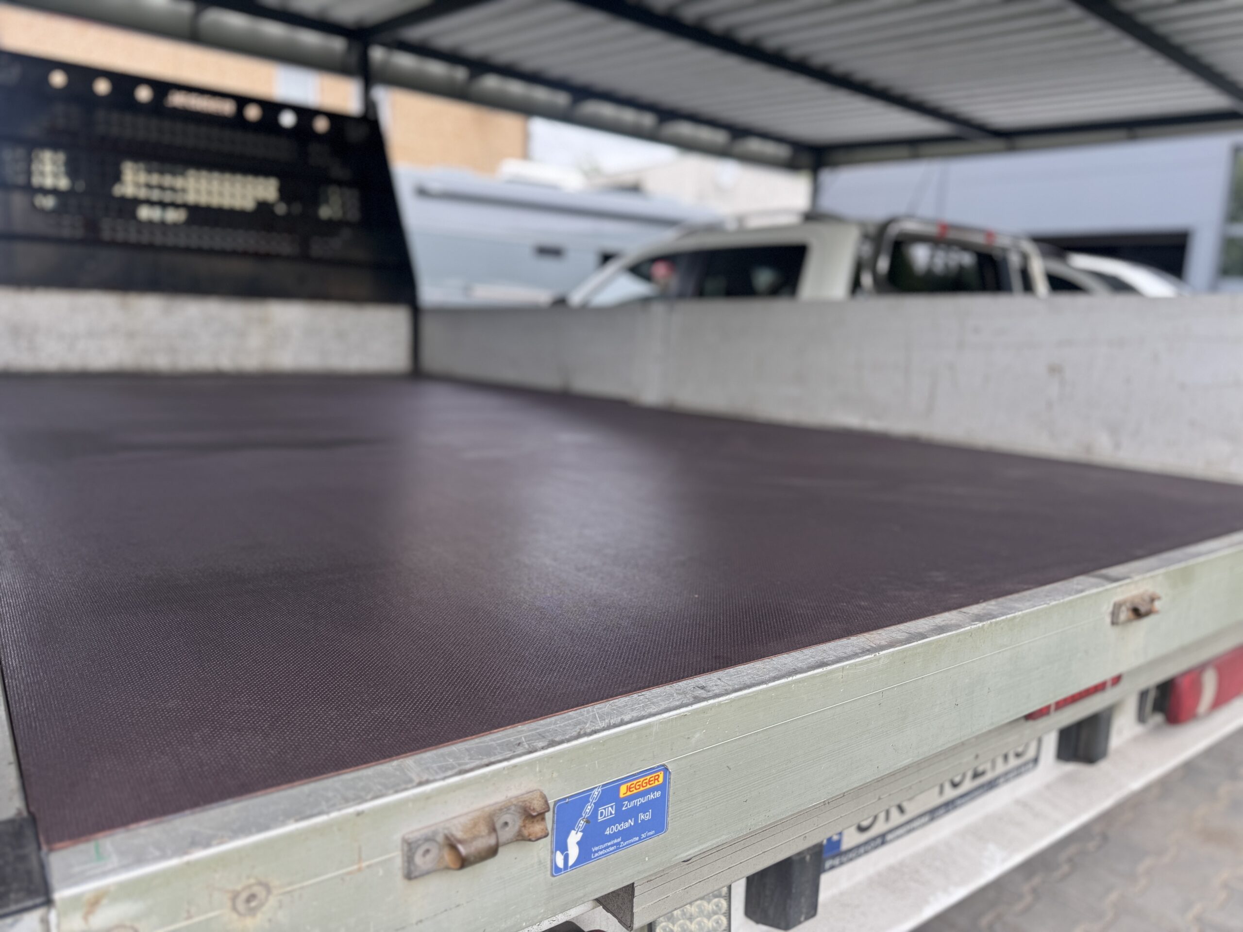 Zastosowaliśmy nową podłogę wykonaną z solidnej sklejki o grubości 18 mm, połączonych aluminiową listwą łączącą. Takie rozwiązanie gwarantuje trwałość, estetykę oraz jednolitą i wytrzymałą powierzchnię.