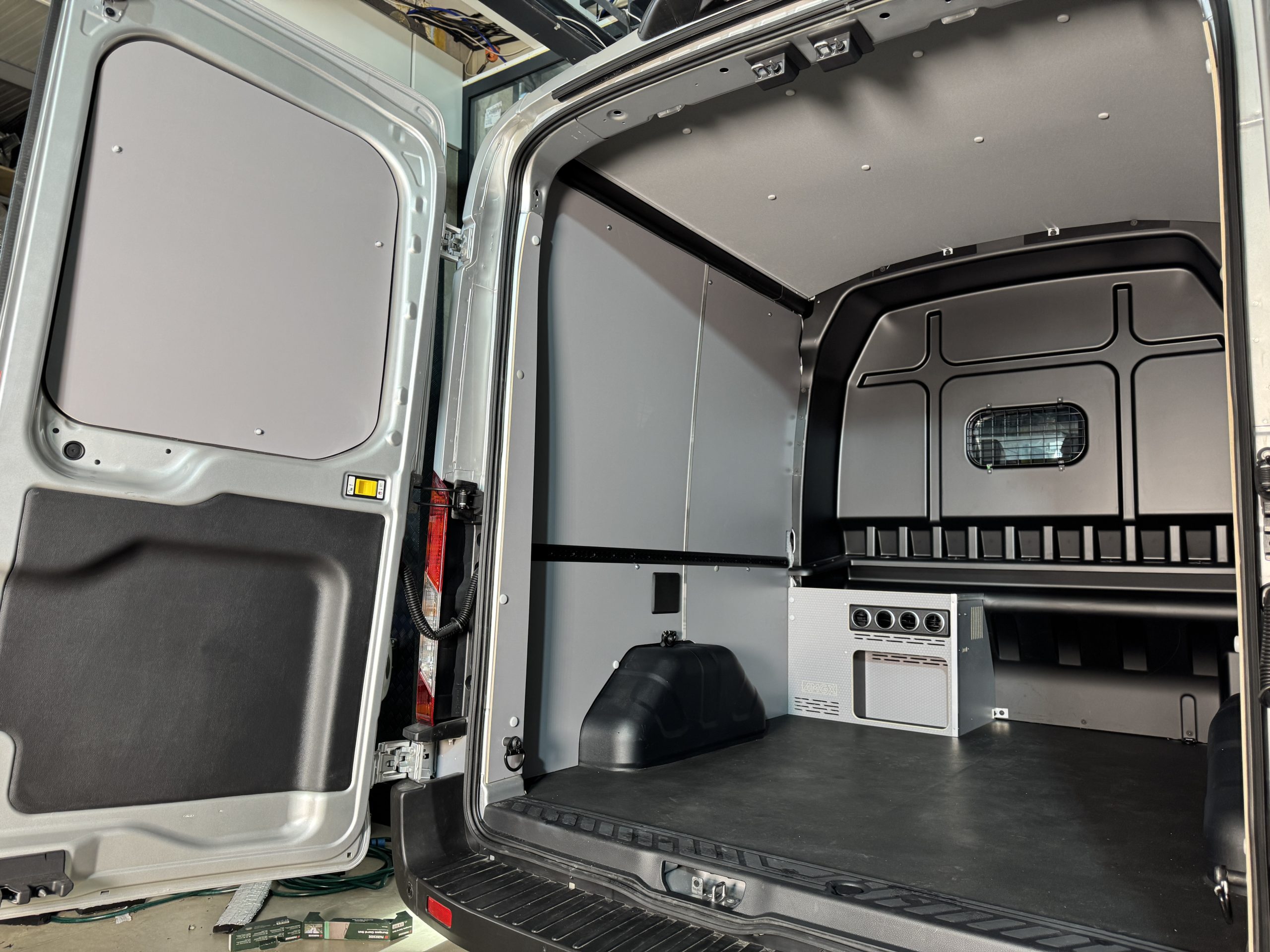 Pierwszym etapem realizacji była izolacja ścian bocznych oraz sufitu Forda Transita Brygadowego L3H2. Do wykonania prac zastosowaliśmy matę kauczukową z warstwą folii aluminiowej, która posiada właściwości termoizolacyjne oraz akustyczne.