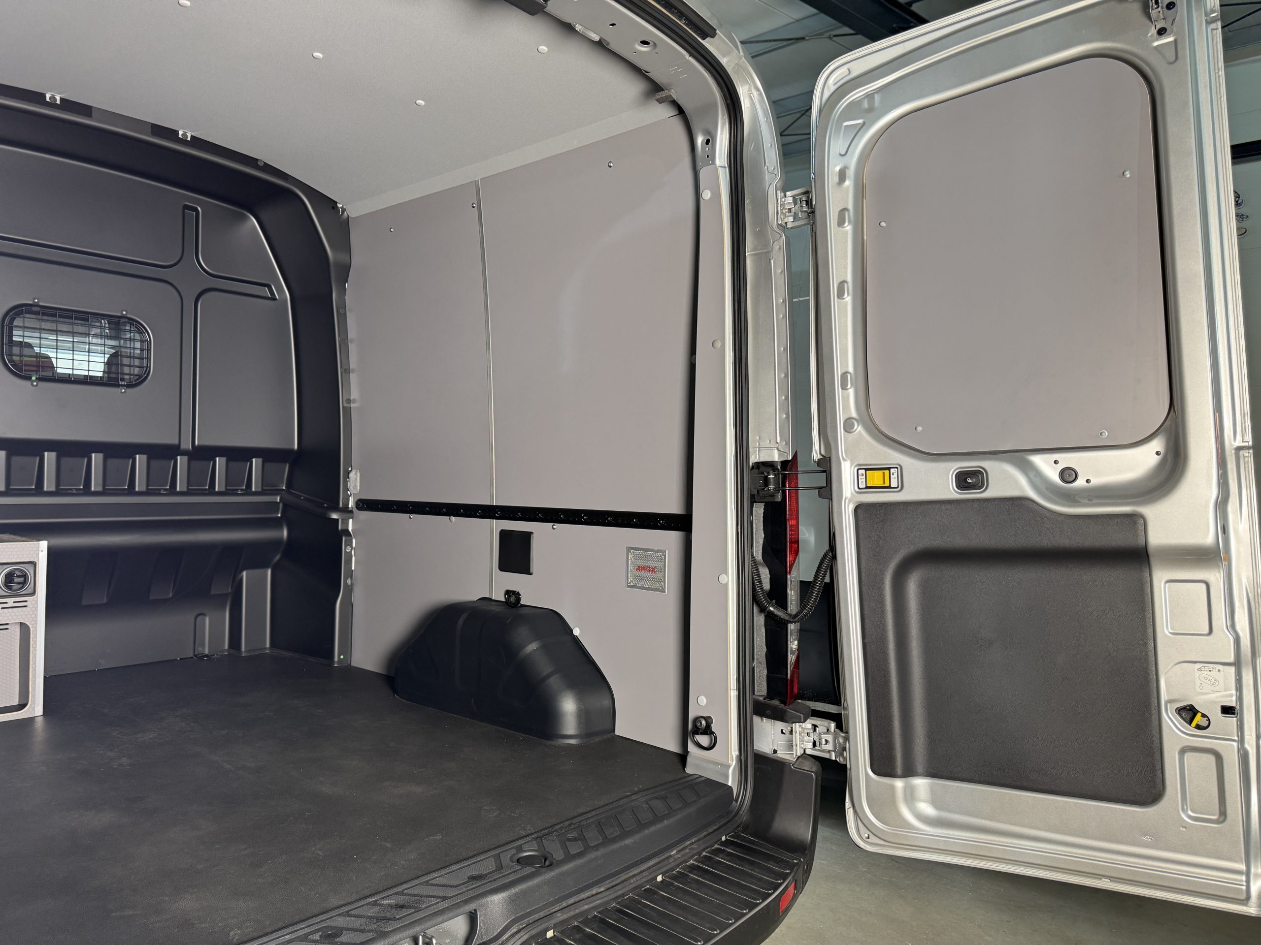 Na ścianach bocznych zamontowaliśmy czarne listwy mocowania ładunku typu Airline, które umożliwiają szybkie i bezpieczne zabezpieczenie przewożonych elementów. System Airline to rozwiązanie cenione w branży transportowej za swoją uniwersalność, wytrzymałość i możliwość konfiguracji.
