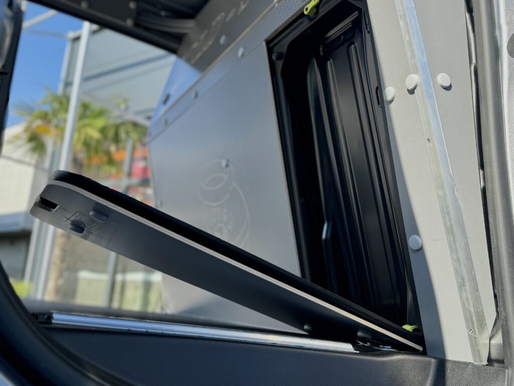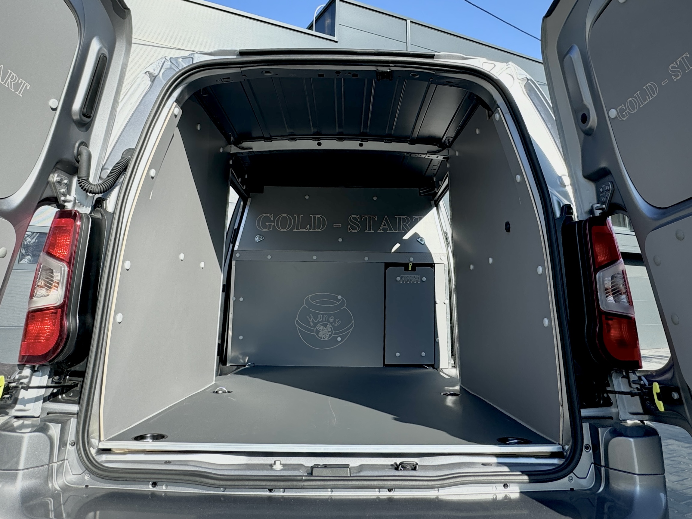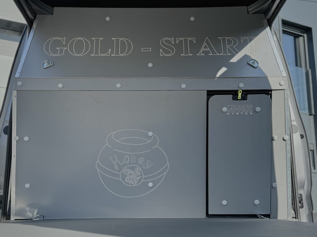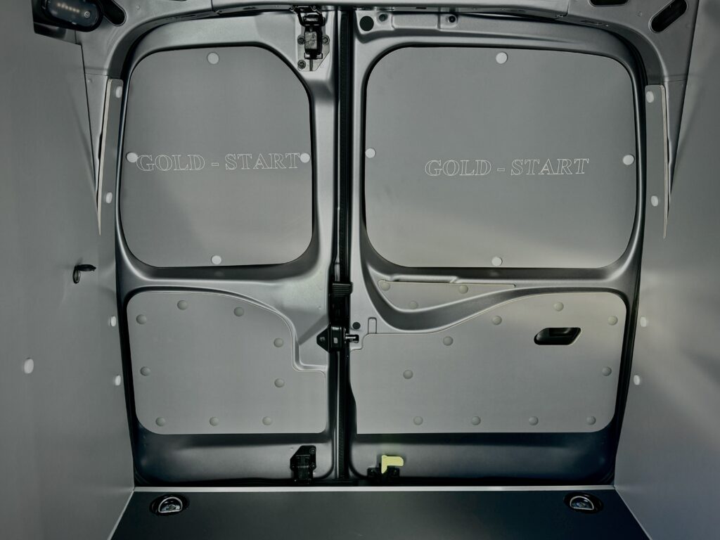 Dzięki wytrzymałej laminowanej sklejce o grubości 6,5 mm, ściany boczne są zabezpieczone od podłogi do sufitu. Takie rozwiązanie tworzy jednolitą, trwałą powierzchnię, która chroni ładunek, ułatwia utrzymanie czystości i jest gotowa na wszelkie wyzwania transportowe. Zamontowaliśmy gniazdo zapalniczki w ścianie bocznej, a także zabezpieczyliśmy ścianę grodziową oraz otwierany schowek sklejką, co zwiększa komfort użytkowania. Wyfrezowane logo klienta na tylnej ścianie i drzwiach nadaje wnętrzu wyjątkowy charakter, łącząc estetykę z profesjonalizmem oraz dbałością o detale.