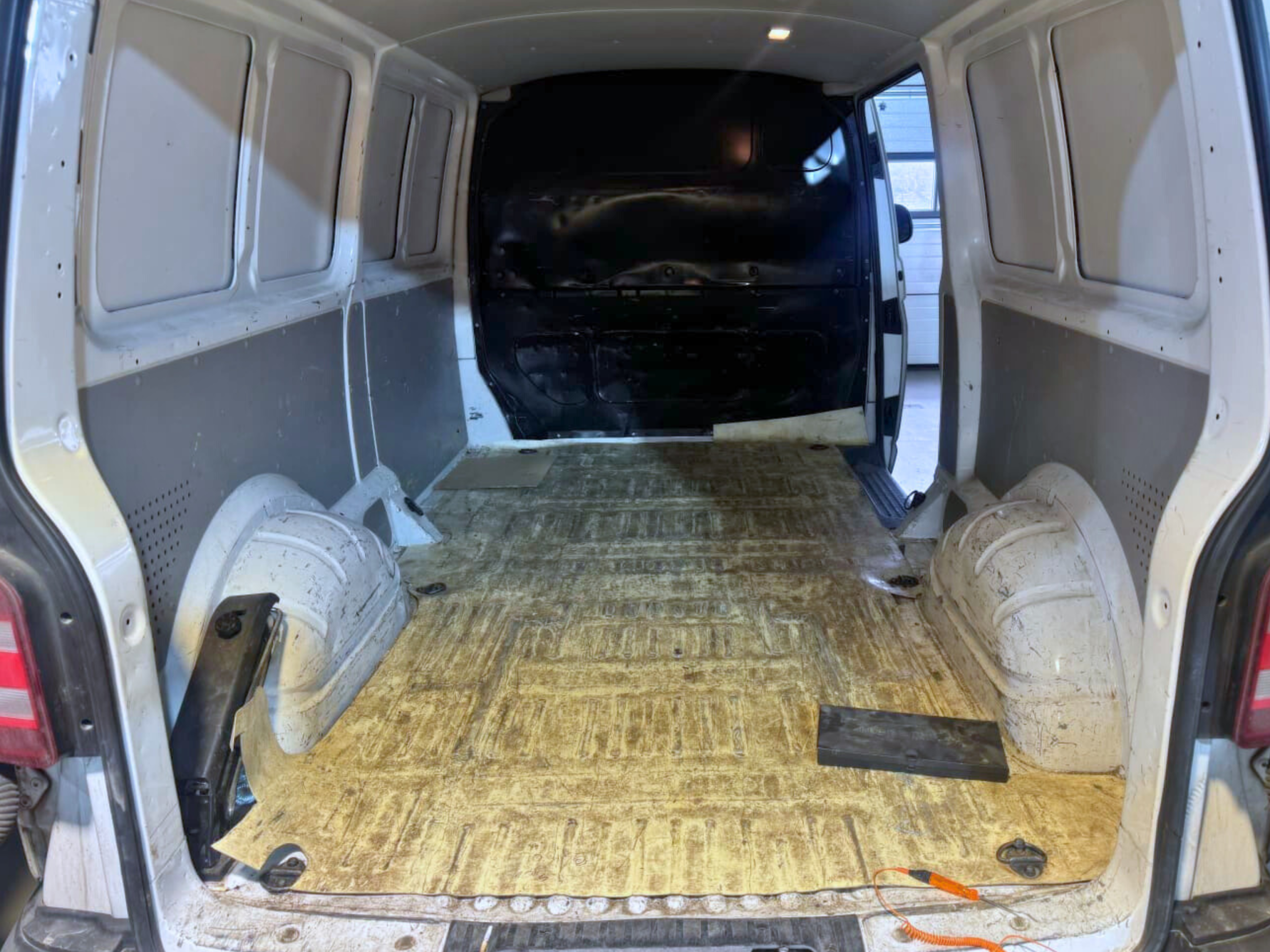 Rozpoczęliśmy realizację od dokładnego oczyszczenia wnętrza Volkswagena T4, co pozwoliło odpowiednio przygotować powierzchnię pod dalsze prace montażowe. Następnie zamontowaliśmy podłogę o grubości 12 mm wraz z miseczkami, wykończoną aluminiowymi listwami podłogowymi, które zwiększają trwałość i estetykę zabudowy.