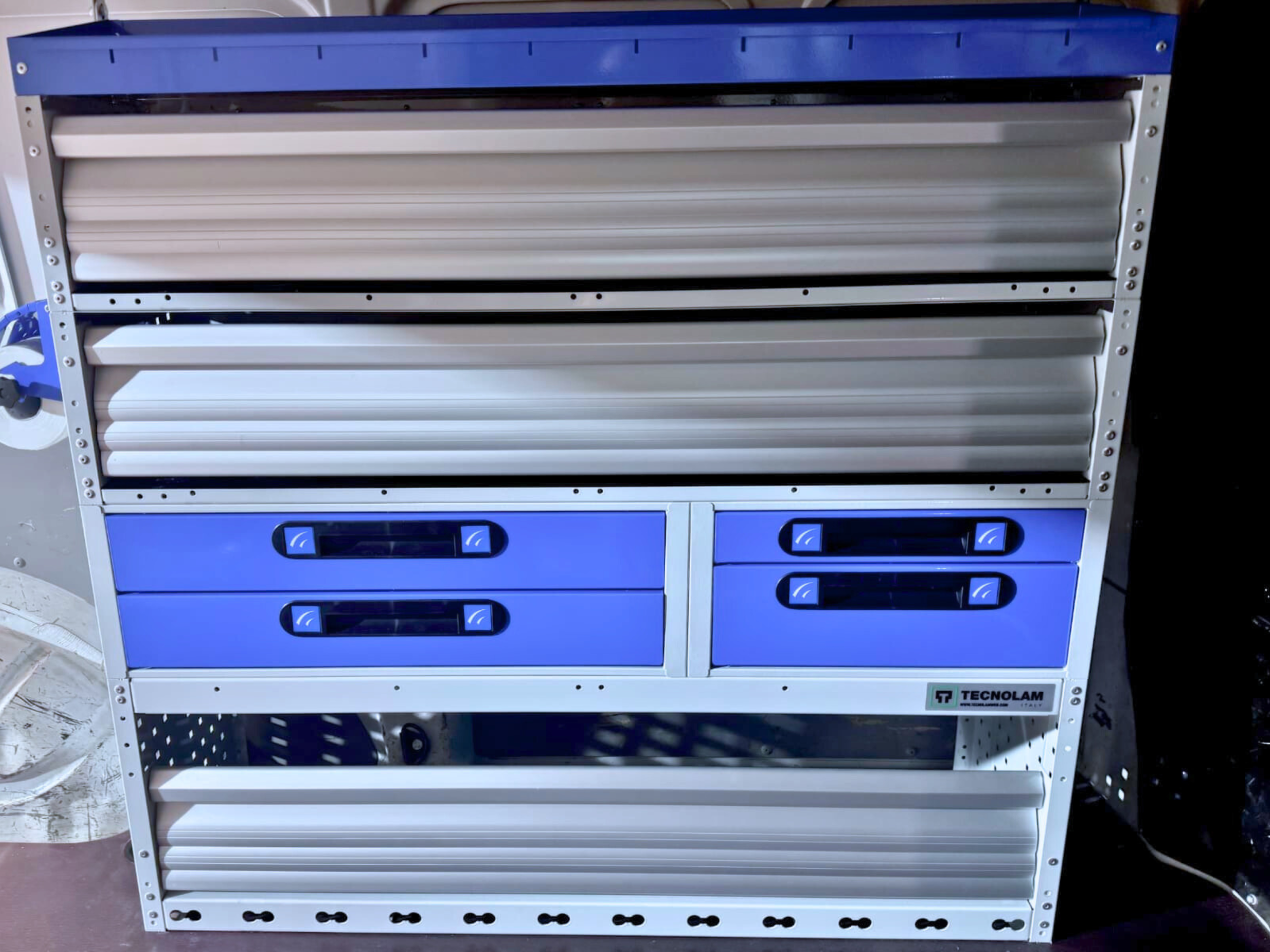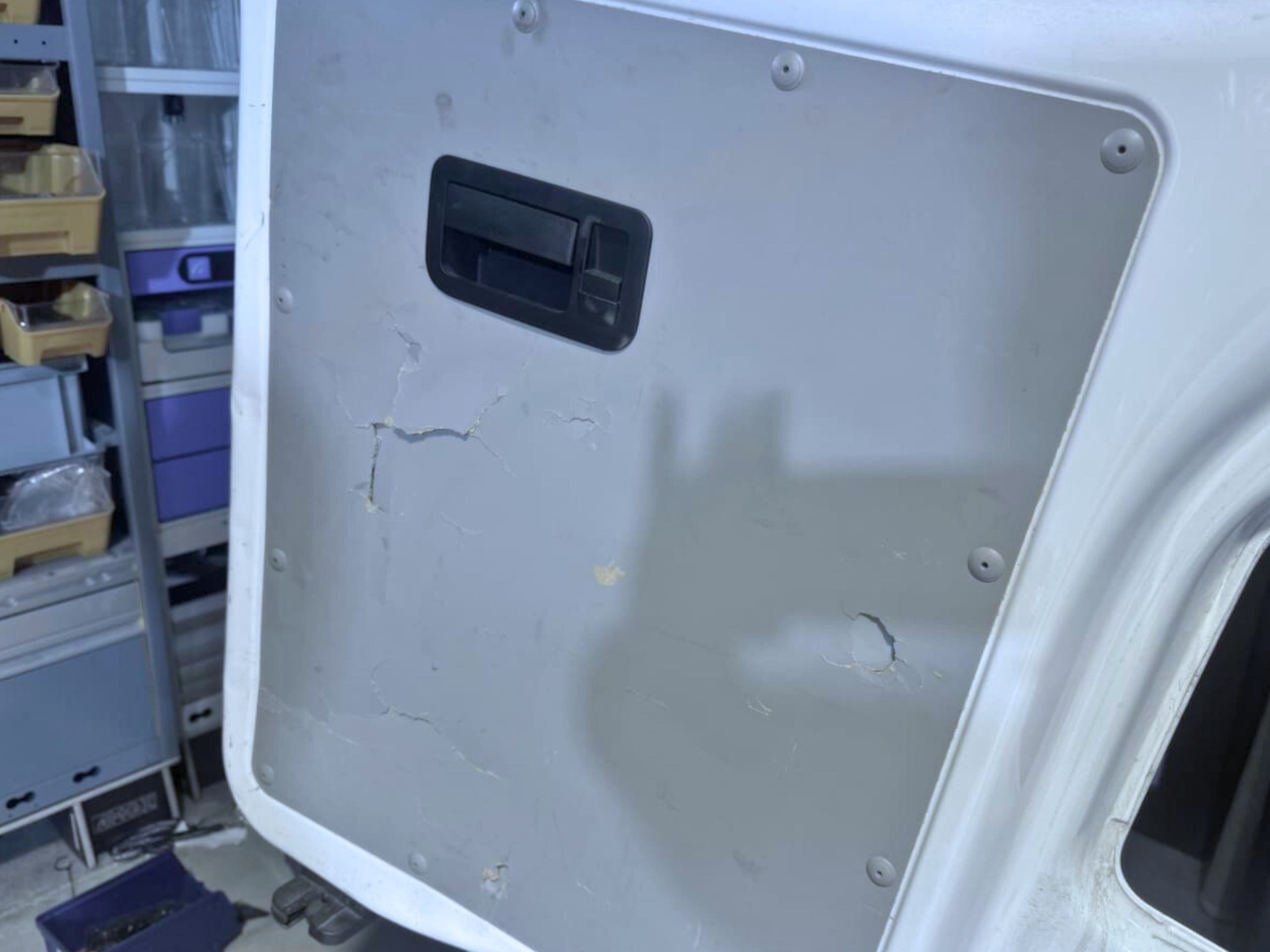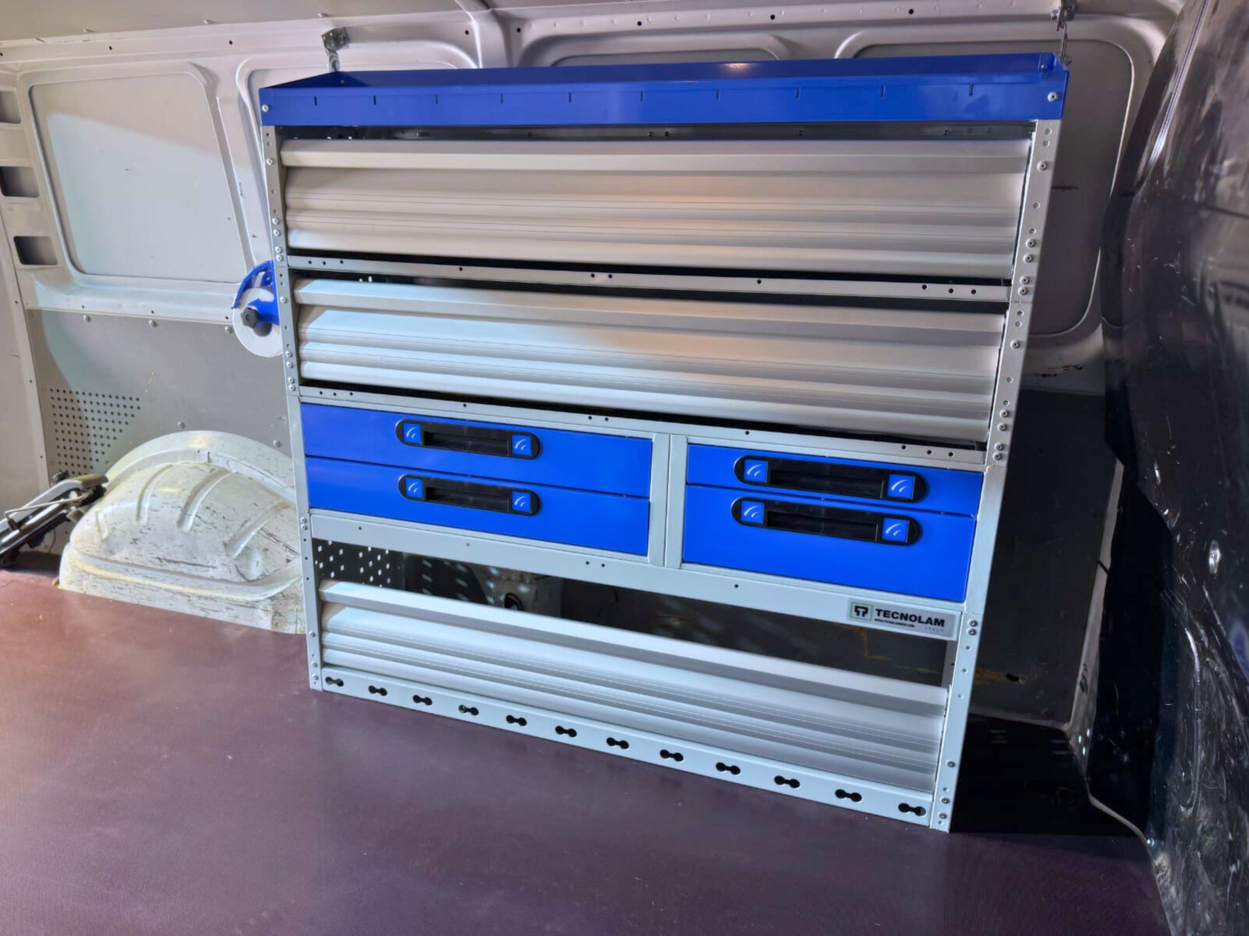 Wymieniliśmy panele drzwi na wodoodporną, laminowaną sklejkę 6,5 mm oraz doposażyliśmy wnętrze w regał TECNOLAM z szafkami i półkami oraz przenośny kącik czystości, tworząc trwałą i funkcjonalną zabudowę do pracy i podróży.