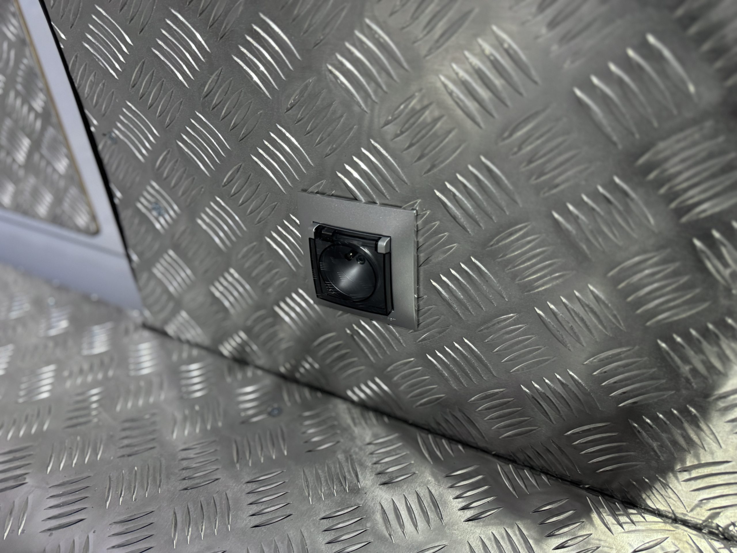 - Panele boczne oraz drzwi, które w pierwszym etapie zostały zabudowane sklejką wodoodporną laminowaną obustronnie 6,5 mm, a następnie dodatkowo zabezpieczone blachą ryflowaną.