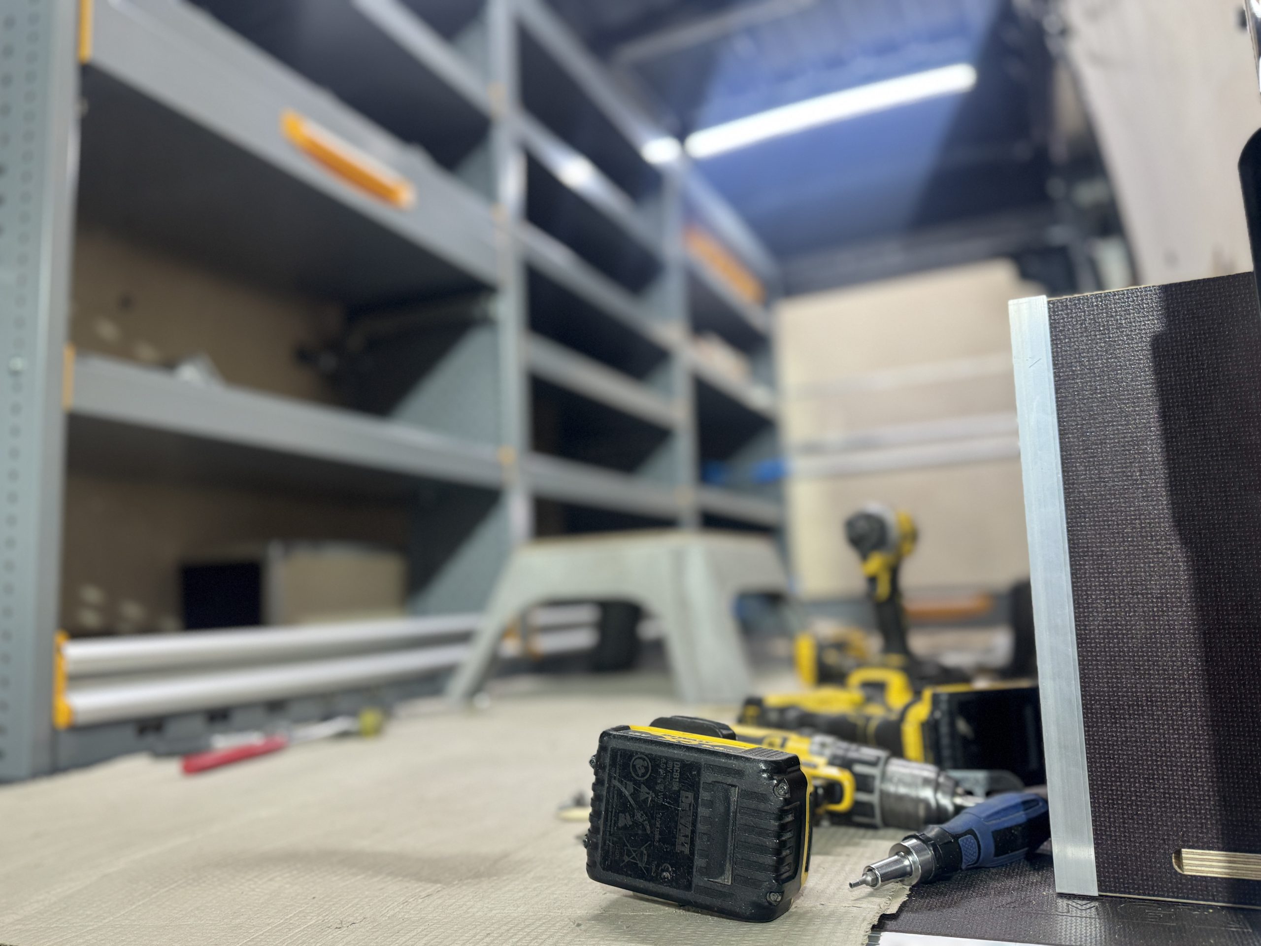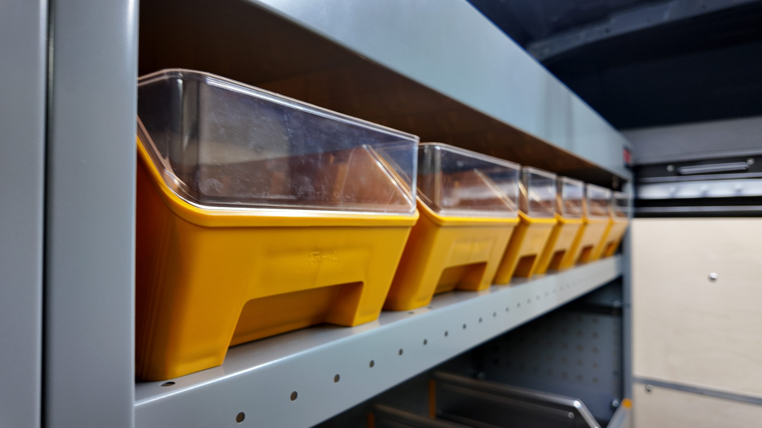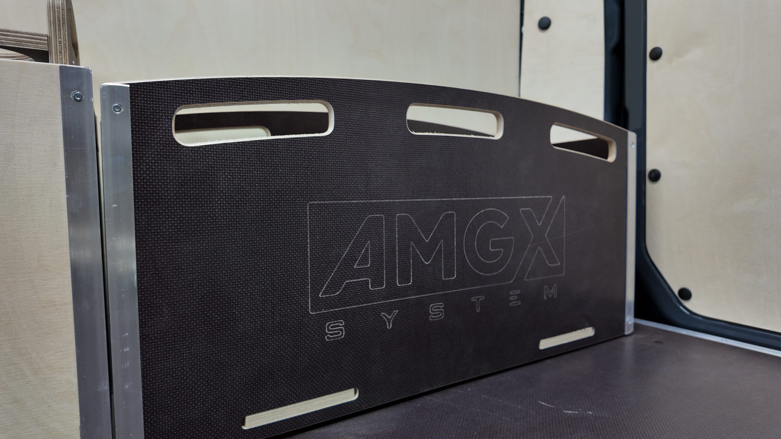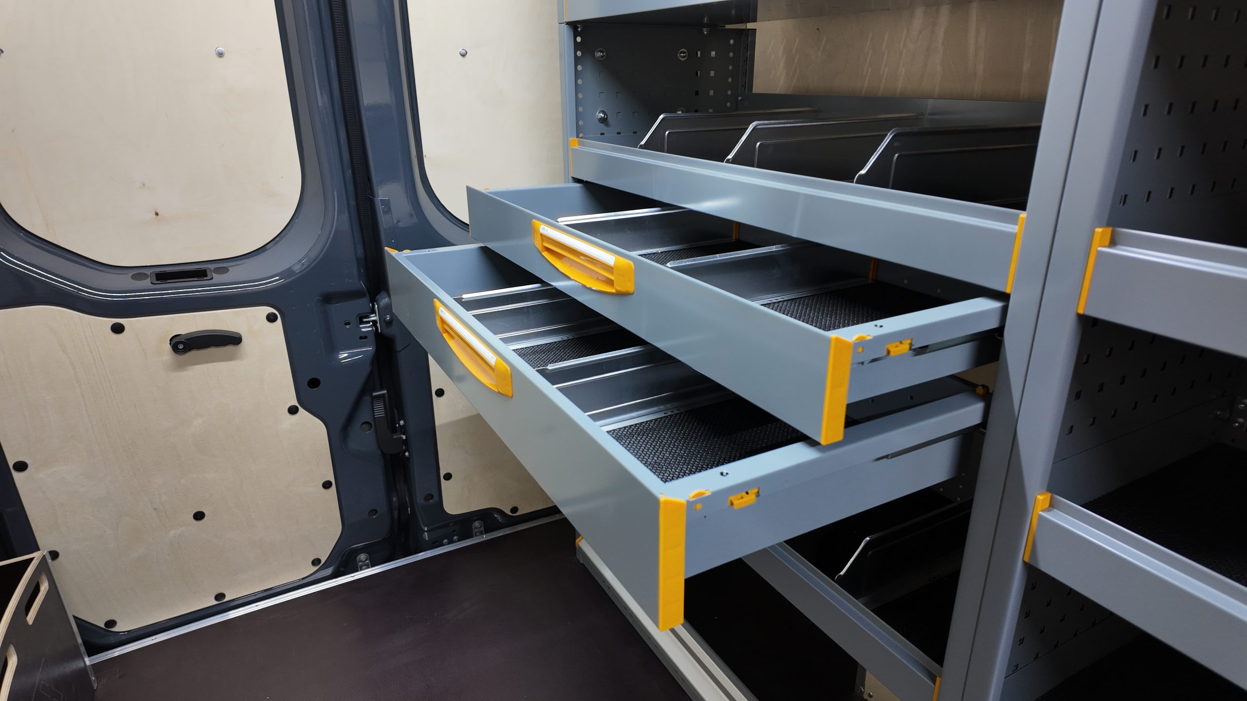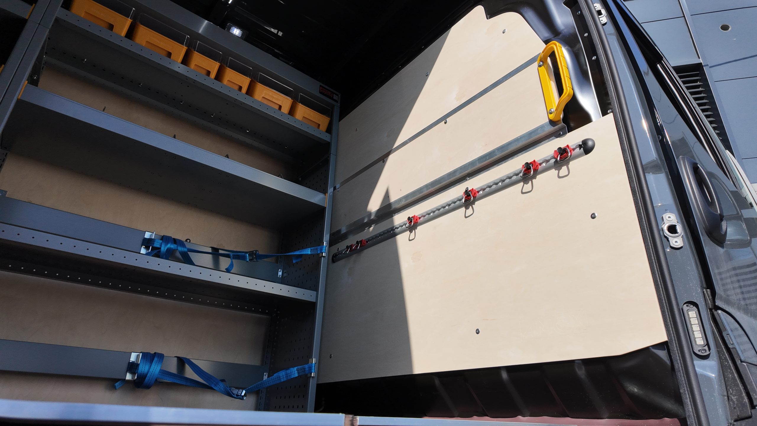 Podłogę antypoślizgową o grubości 12 mm zamontowaliśmy w jednym elemencie, wykończyliśmy aluminiowymi listwami, co zapewnia stabilność oraz odporność na uszkodzenia. Panele boczne, drzwi oraz ścianę grodziową wykonaliśmy są ze sklejki liściastej o grubości 6,5 mm, odpornej na codzienne zużycie. Ścianę grodziową wykonaliśmy z trzech części, dzięki czemu nie ograniczyliśmy przestrzeni w pojeździe.