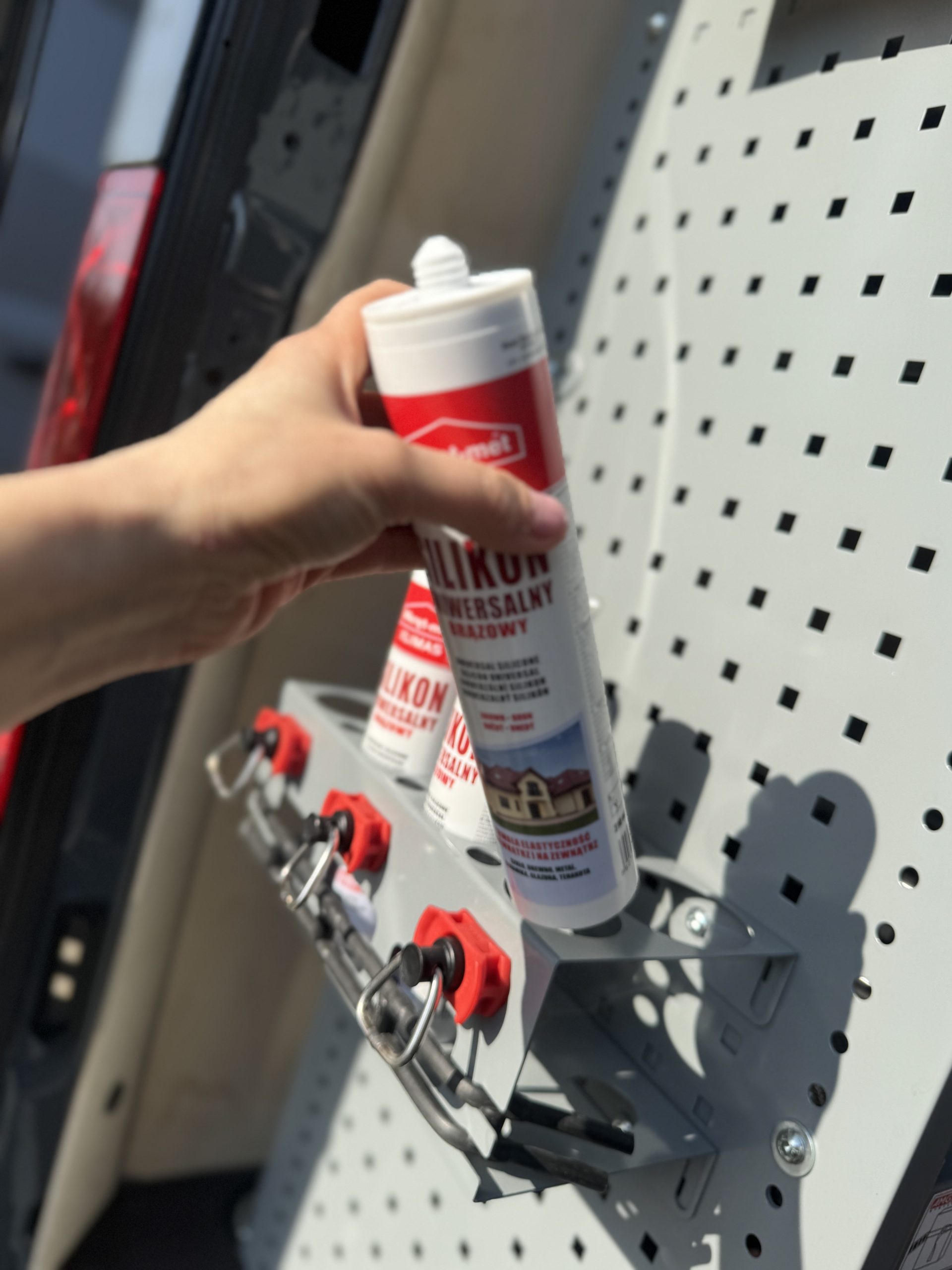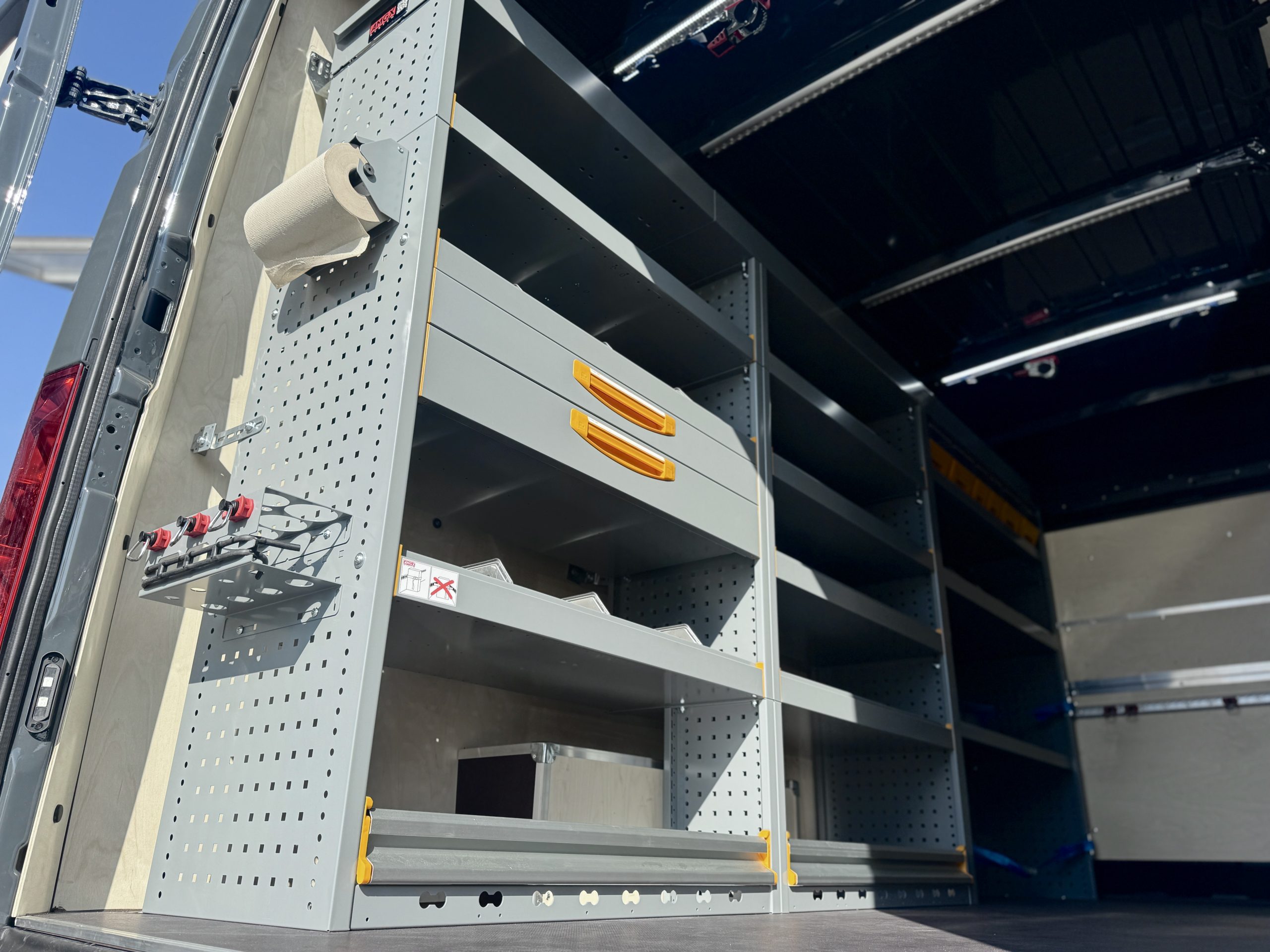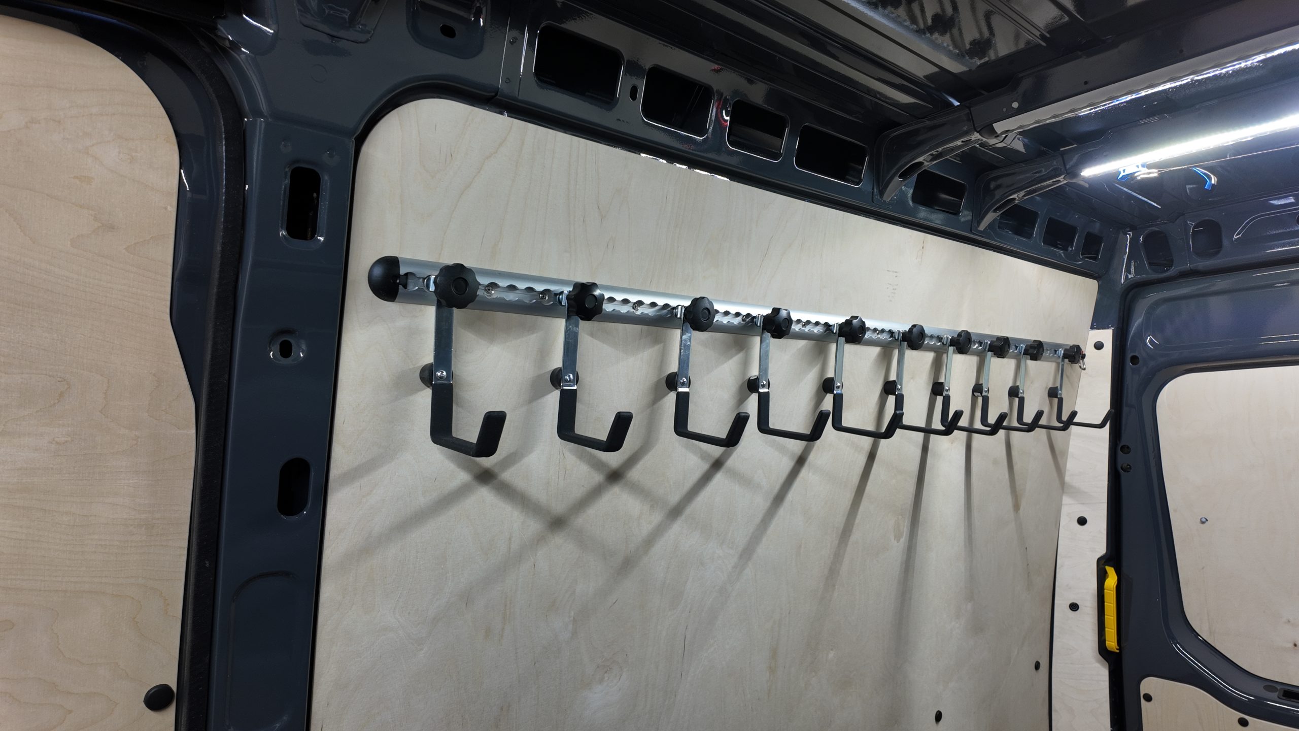 W pojeździe zamontowaliśmy także listwy Airline: na ścianach z stalowymi wieszakami na kable z gumowymi odbojnikami – zamontowane na dodatkowej podbudowie wzmacniającej konstrukcję – oraz na suficie, gdzie dwie z nich wyposażone są w oświetlenie LED. Listwy posiadają również dedykowane pasy automatyczne oraz uchwyty mocowania ładunku, które są kompatybilne z systemem StoreVan, co zwiększa uniwersalność zabudowy.