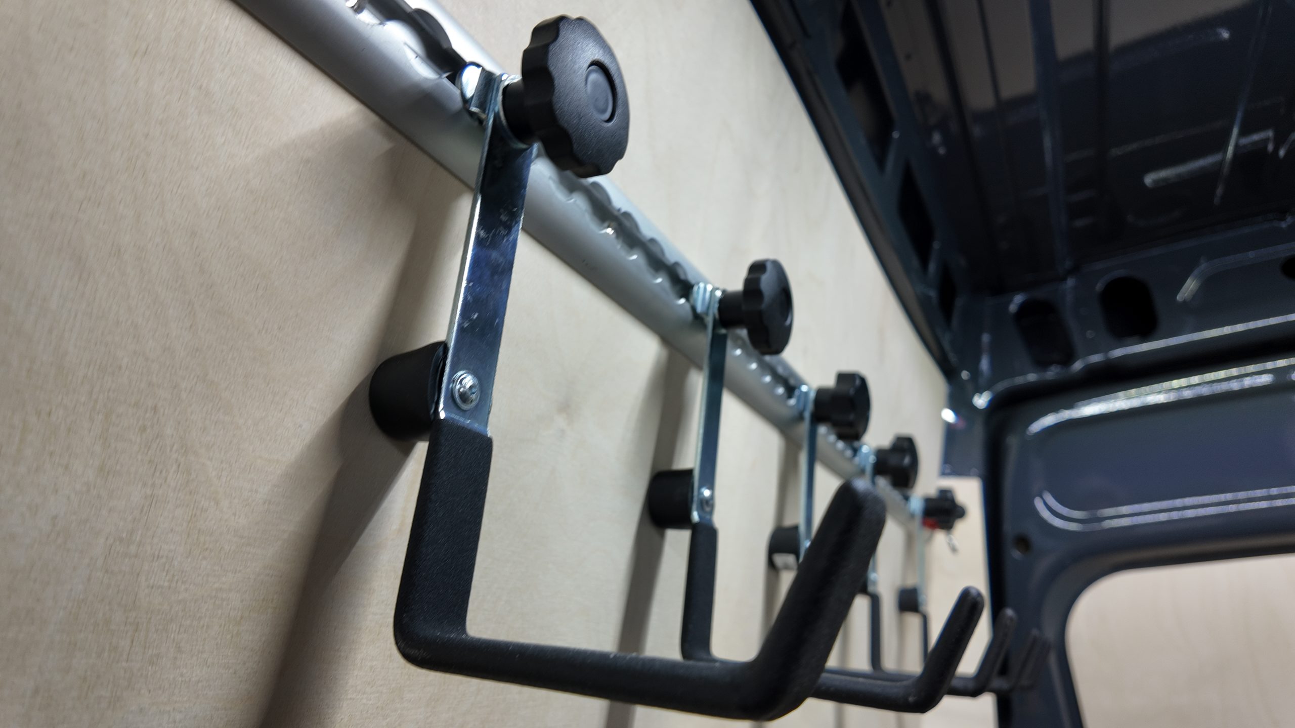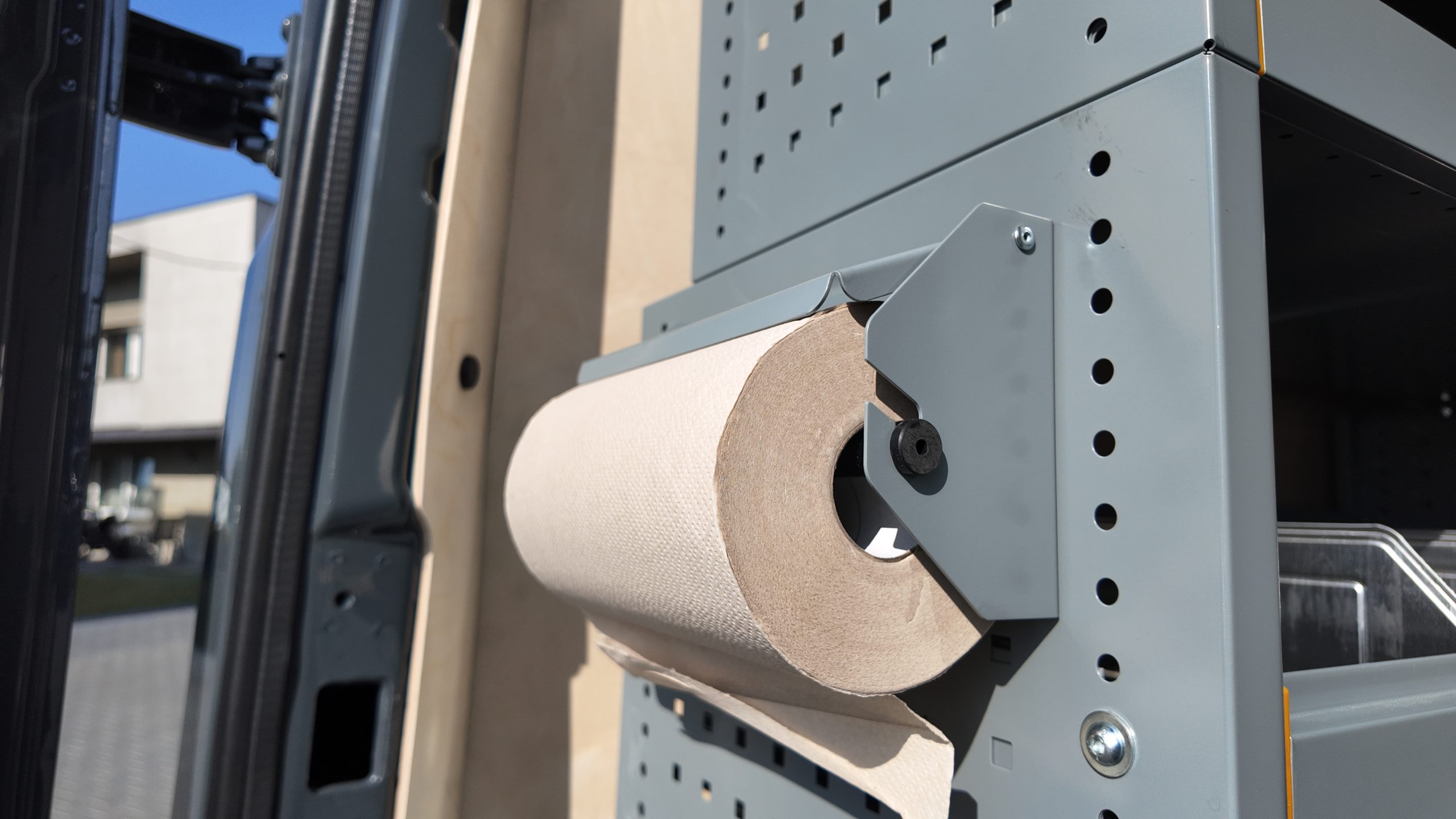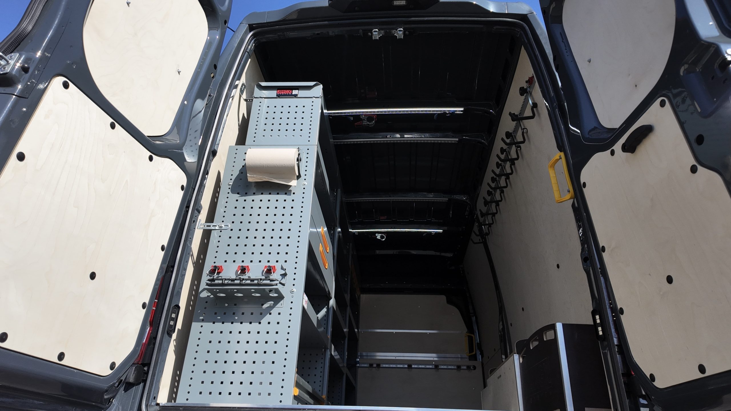 W pojeździe zamontowaliśmy także listwy Airline: na ścianach z stalowymi wieszakami na kable z gumowymi odbojnikami – zamontowane na dodatkowej podbudowie wzmacniającej konstrukcję – oraz na suficie, gdzie dwie z nich wyposażone są w oświetlenie LED. Listwy posiadają również dedykowane pasy automatyczne oraz uchwyty mocowania ładunku, które są kompatybilne z systemem StoreVan, co zwiększa uniwersalność zabudowy.