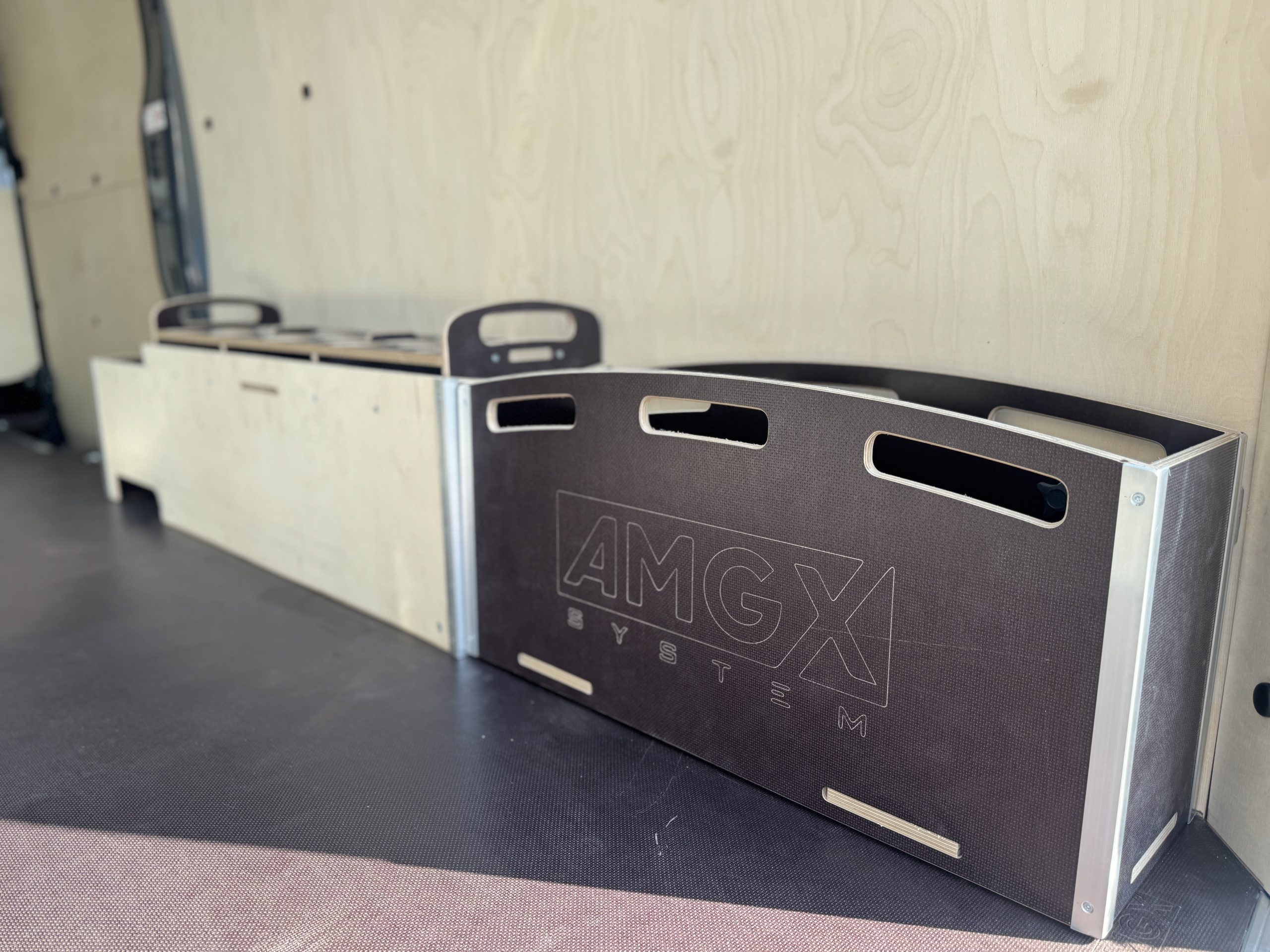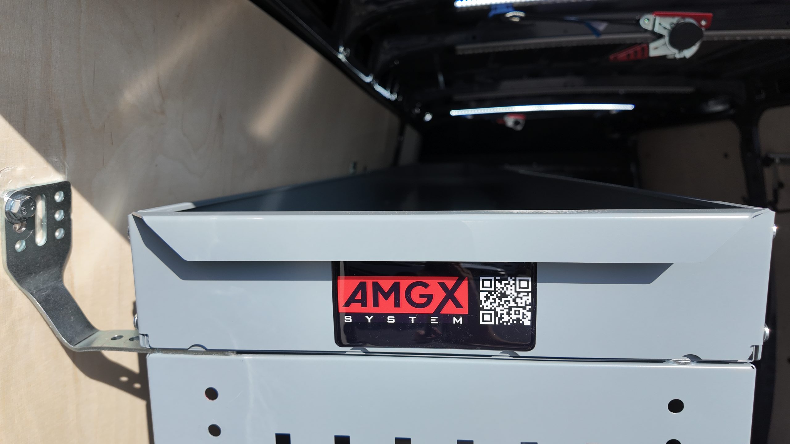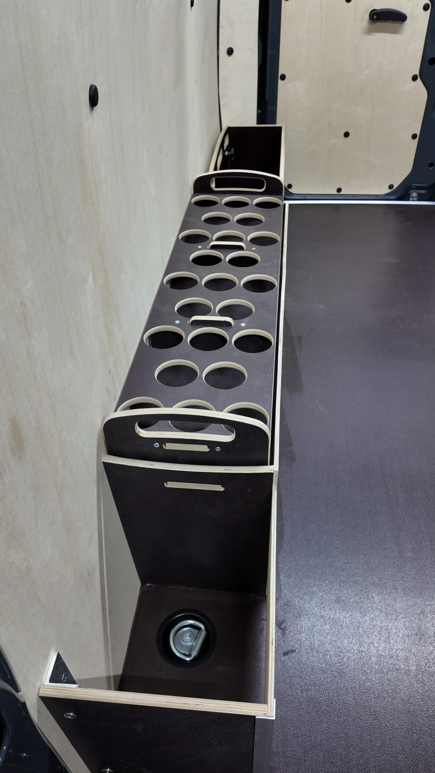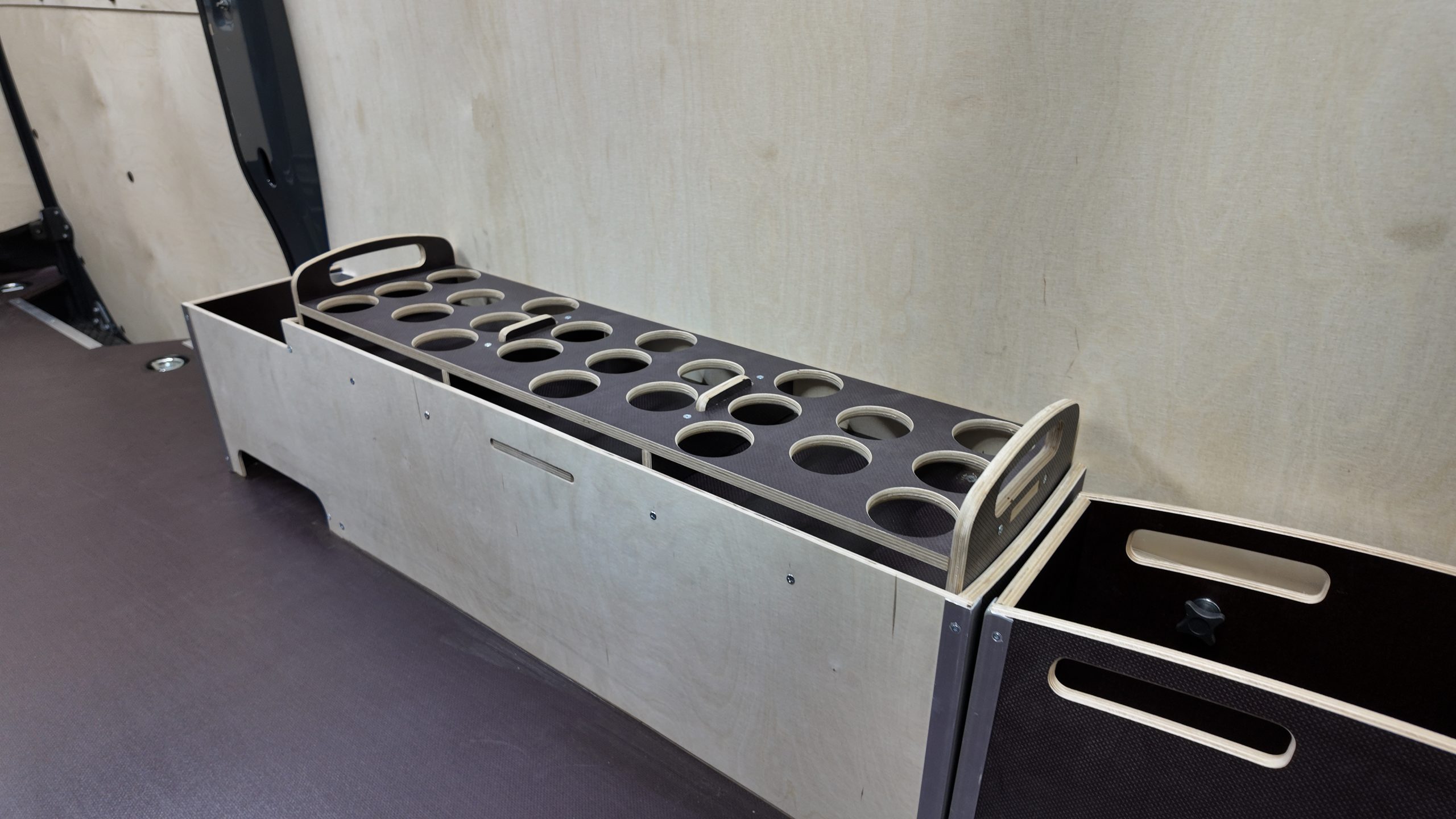 Dodatkowo wykonaliśmy nadkole Xtra, wydłużone w stronę drzwi bocznych, oraz panel nadkolowy ze sklejki 12 mm przeznaczony do bezpiecznego przechowywania pojemników aerozolowych. Skrzynia transportowa (box) ze sklejki 12 mm została dopasowana do bębnów kablowych i jest w pełni demontowalna.