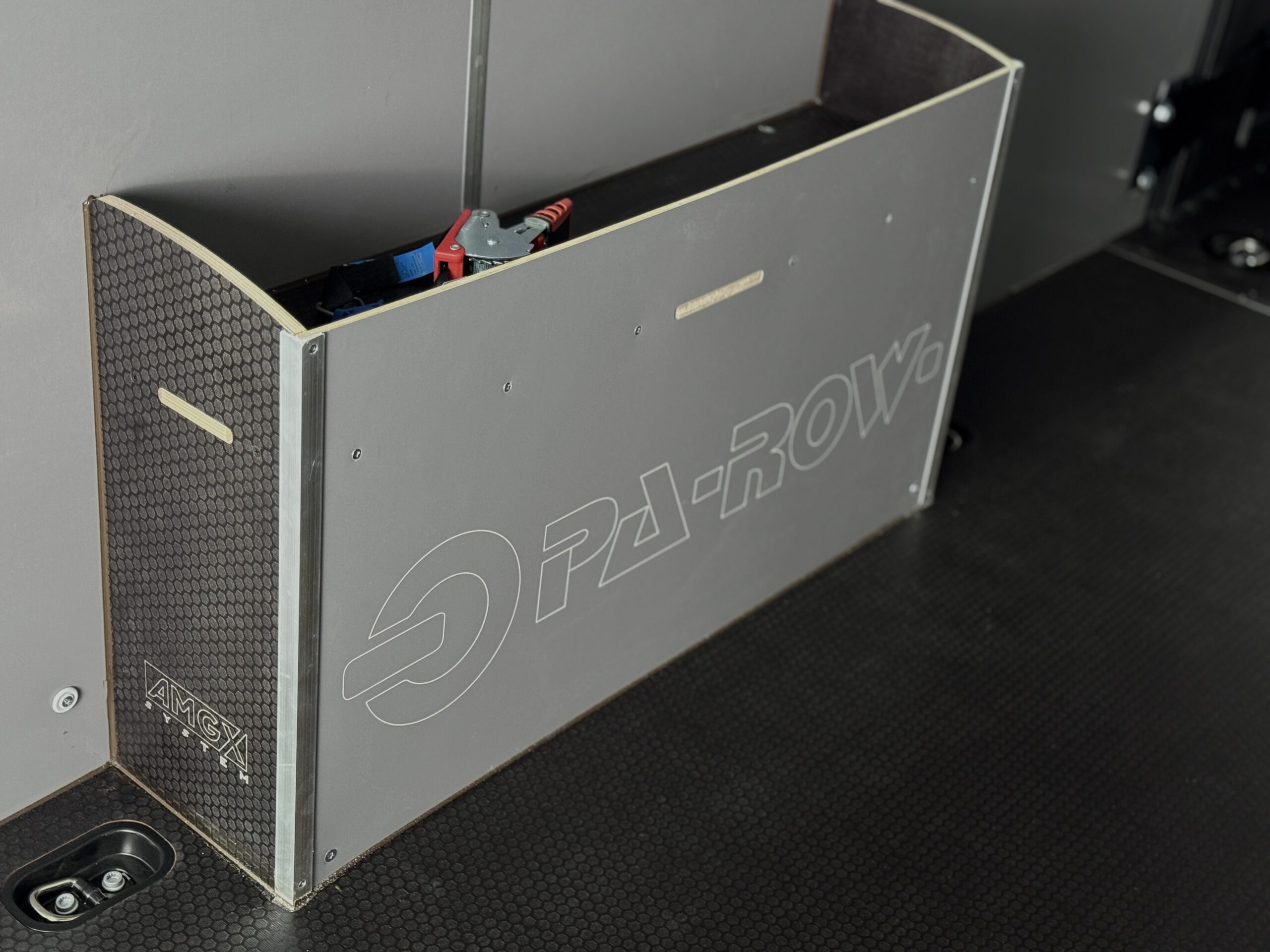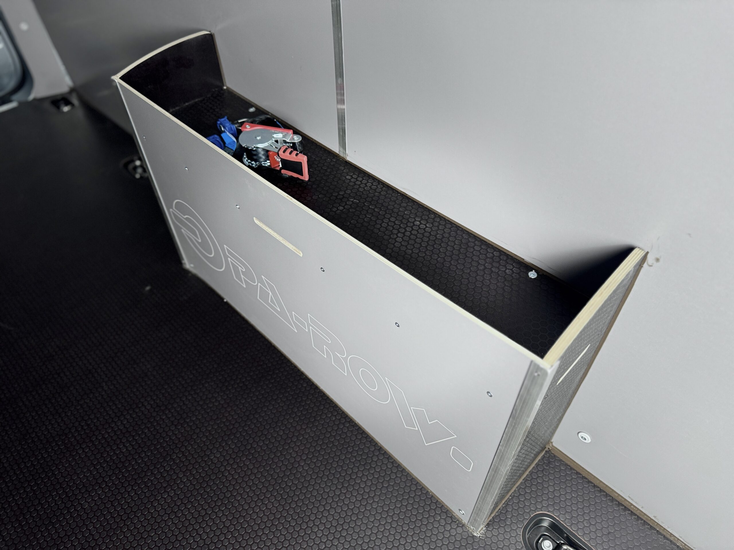 Model wykonany z solidnej sklejki o grubości 6,5 mm z przodu i 12 mm po bokach, zabezpieczony aluminiową listwą. Dodatkowo nadkola wyposażono w półkę na drobne przedmioty. Dla profesjonalnego wyglądu umieściliśmy na nich logo firmy. - Ściany boczne i drzwi
