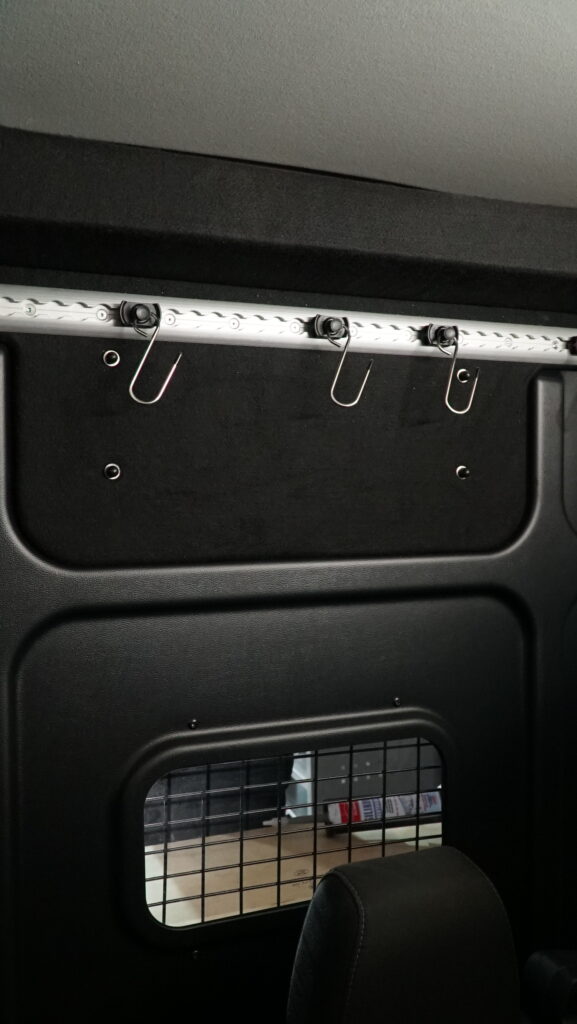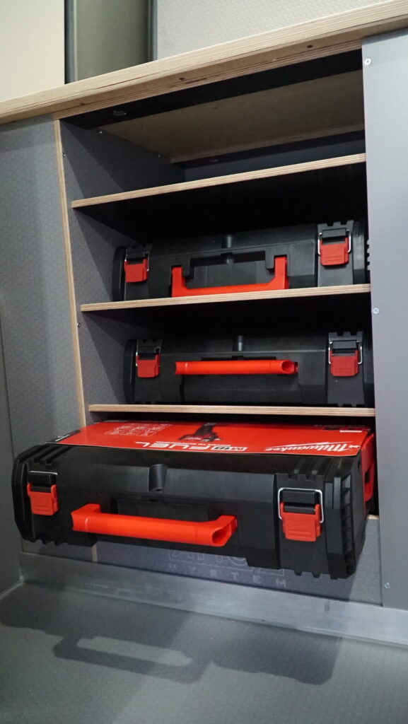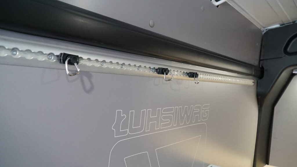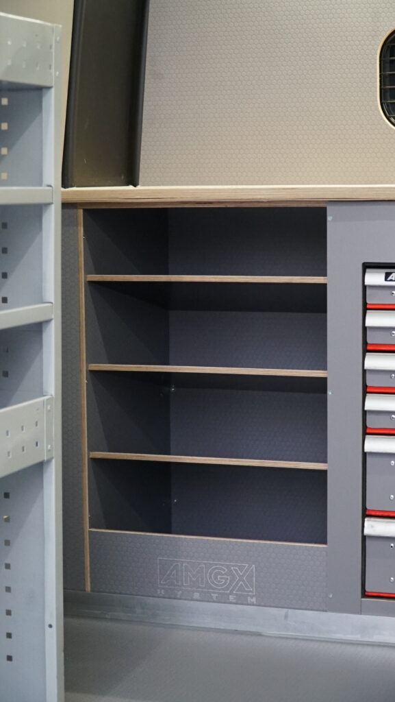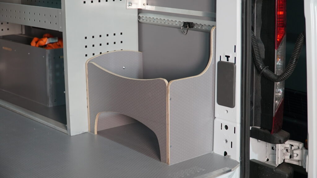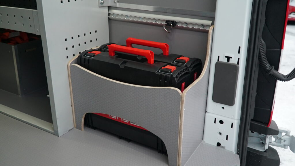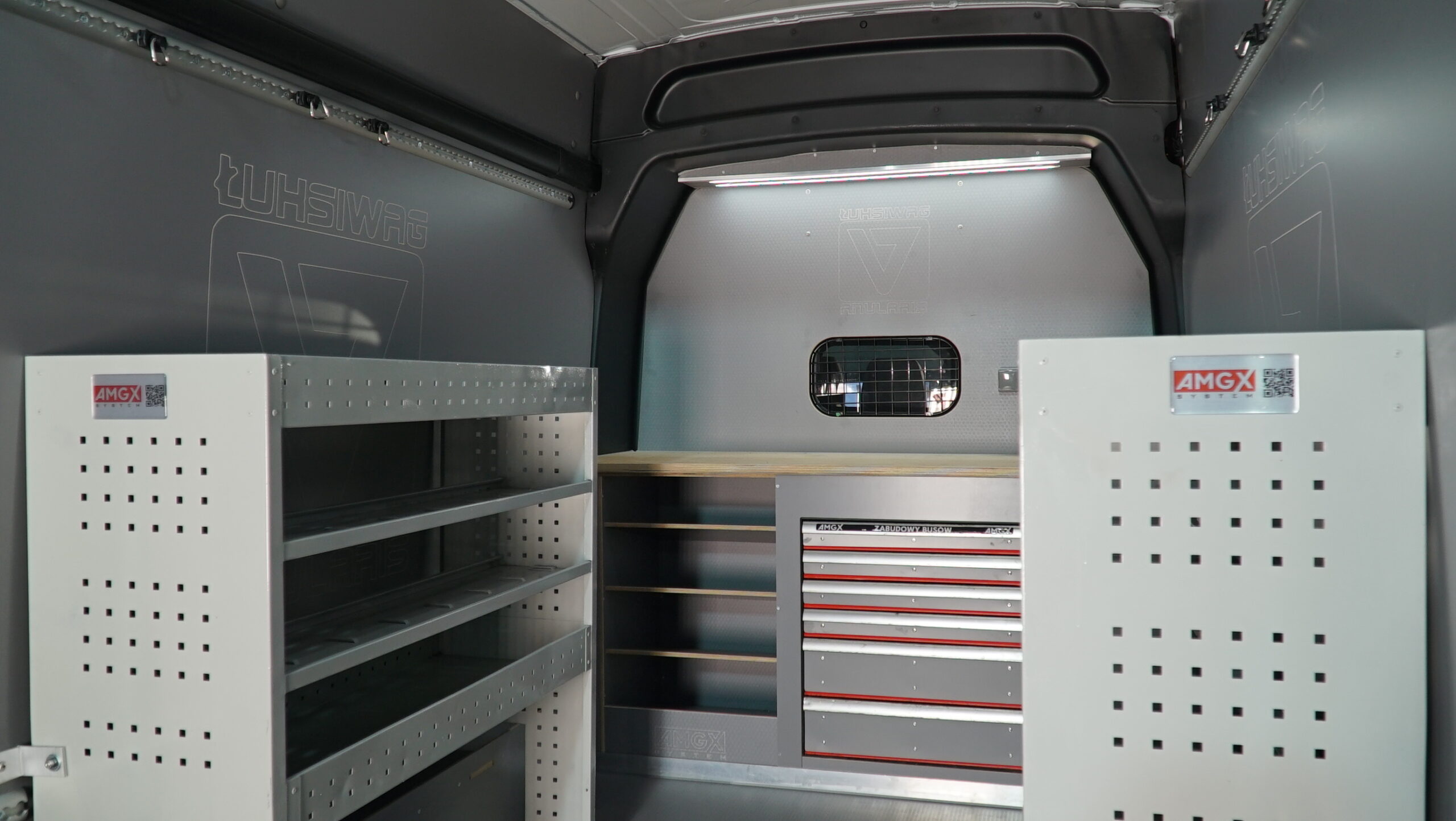 Na całej długości ścian bocznych zamocowaliśmy listwy airline, które pozwalają na bezpieczne mocowanie ładunków. Dodatkowe w tylnej części wykonaliśmy praktyczne schowki po obu stronach samochodu służące do transportu walizek narzędziowych.