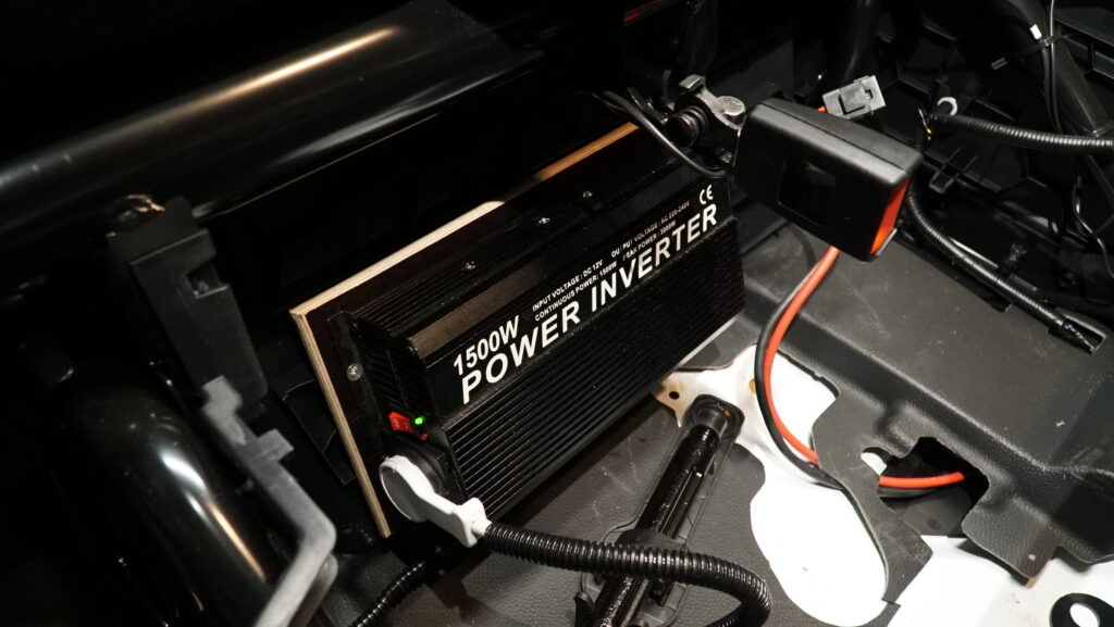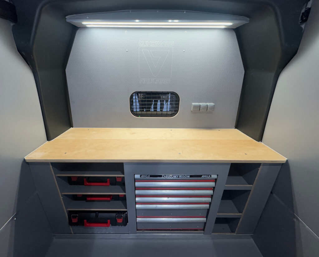 Ściana grodziowa została zabezpieczona sklejką premium HEXA o grubości 12 mm, w której precyzyjnie wycięliśmy otwór na okna techniczne. Do niej zamontowaliśmy regał z blatem roboczym, w których zabudowaliśmy miejsca na walizki oraz odnowiony wózek narzędziowy. Na ścianie grodziowej zamontowaliśmy gniazdka 230V oraz oświetlenie LED, co zapewnia funkcjonalność i komfort użytkowania. Dodatkowo, w częściach pasażerskich zainstalowaliśmy przetwornicę, co zwiększa funkcjonalność zabudowy.