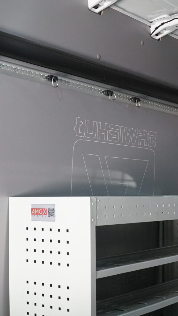 Odnowione regały warsztatowe zamontowane na ścianach bocznych, które zabezpieczyliśmy wysokiej jakości sklejką o grubości 6,5 mm, pokrytą filmem fenolowym, co zapewnia odporność na wilgoć oraz uszkodzenia mechaniczne, gwarantując trwałość i estetyczny wygląd na wiele lat. Dodatkowym udogodnieniem jest półka oraz listwa airline z hakami na ubrania, zamontowane w przestrzeni pasażerskiej. Na całej zabudowie wyfrezowaliśmy logo firmy, co podkreśla jej wizerunek.