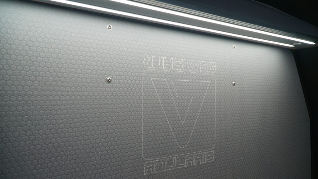 Zastosowaliśmy szarą podłogę HEXA premium o grubości 12 mm. Dzięki wodoodporności i wytrzymałej strukturze idealnie sprawdza się przy intensywnym użytkowaniu, zapewniając komfort pracy i łatwość w utrzymaniu czystości. Na lewych drzwiach zamontowaliśmy ShoulderSink – przenośny kącik czystości, zapewniający czystość dłoni w dowolnym miejscu.