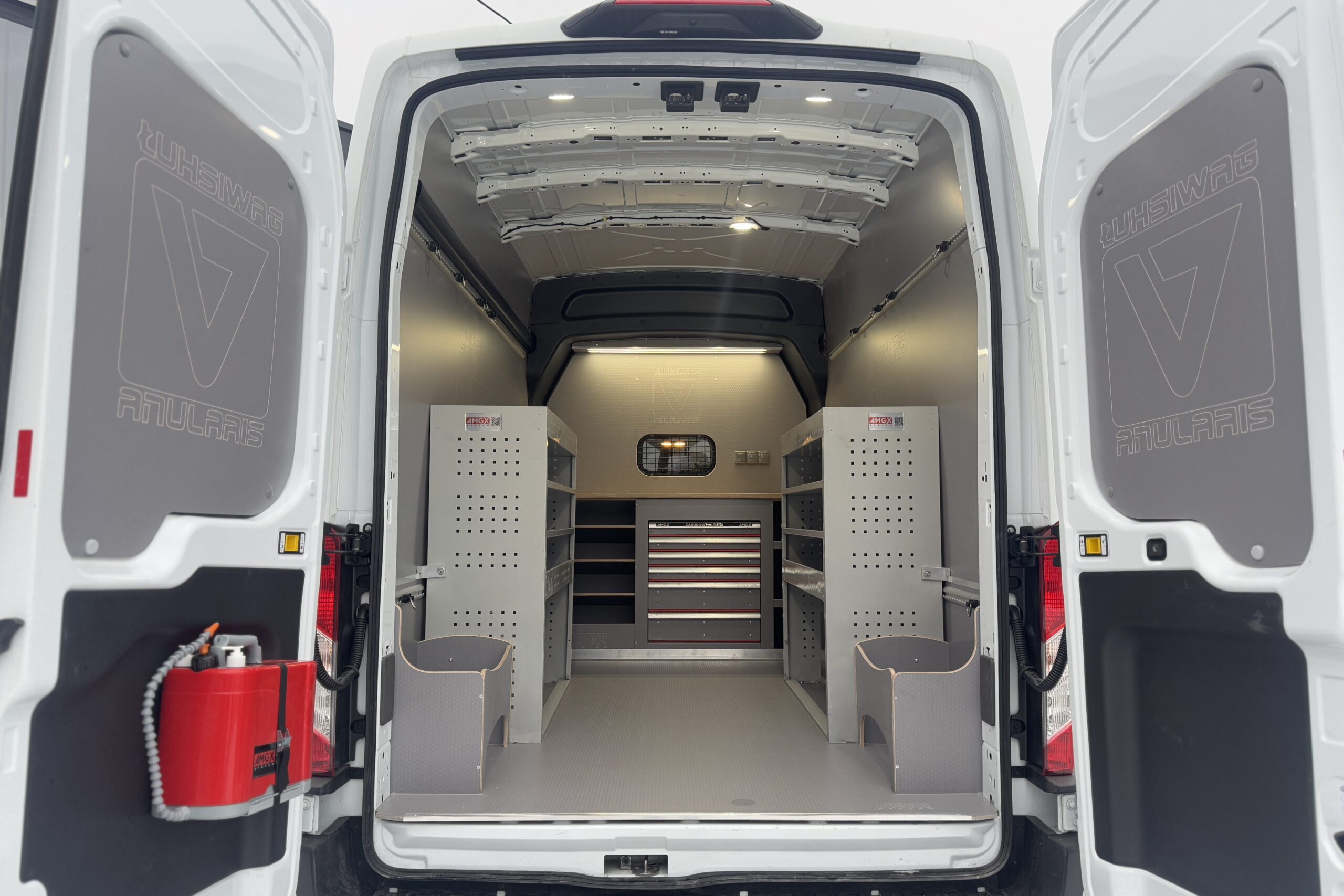 Zabudowa została zaprojektowana dla firmy Anularis, specjalizującej się w produkcji maszyn, naprawie urządzeń elektrycznych oraz pracach budowlanych. Całość jest dostosowana do potrzeb profesjonalistów pracujących w terenie, zapewniając funkcjonalność i pełną wygodę.
