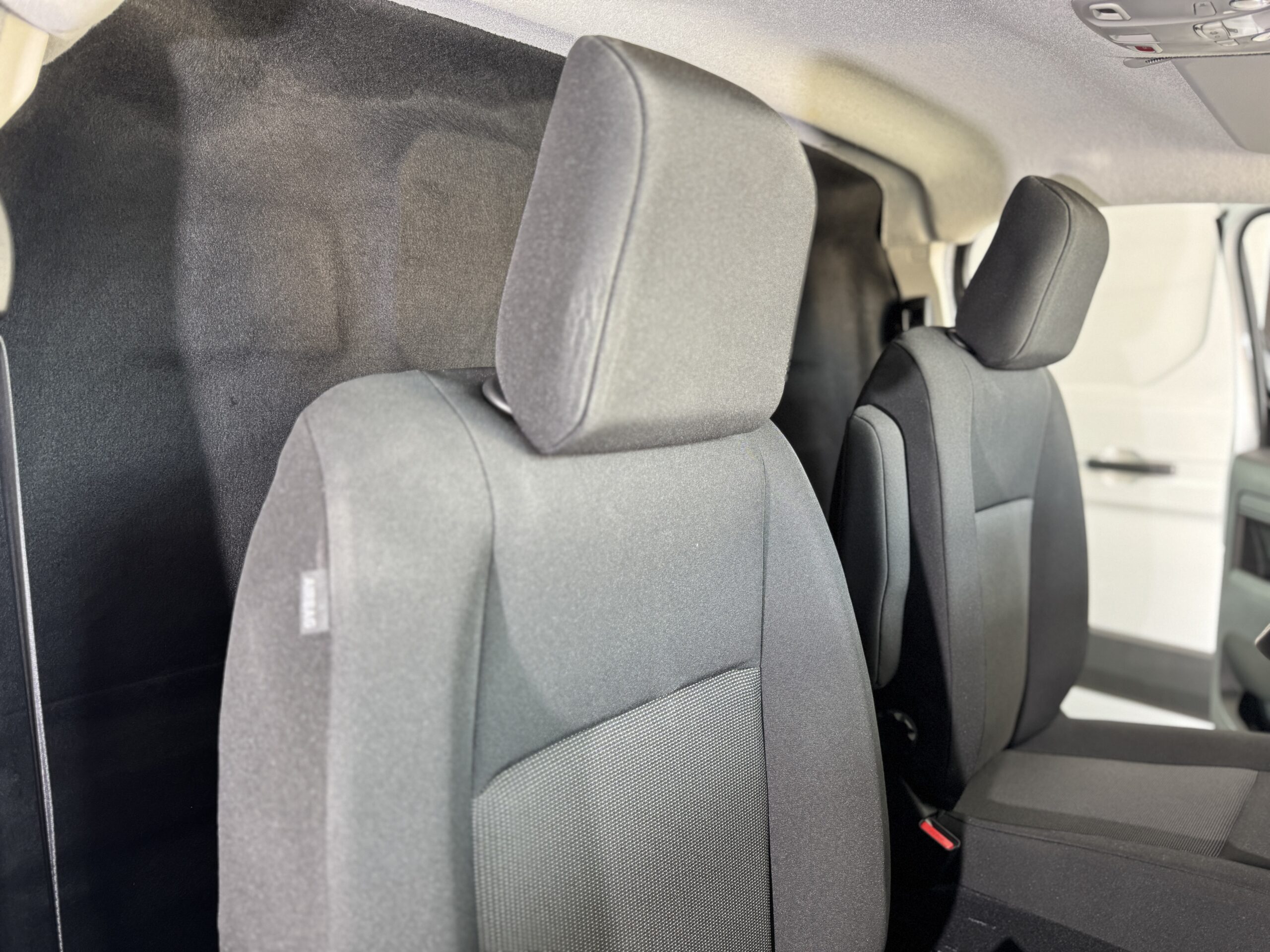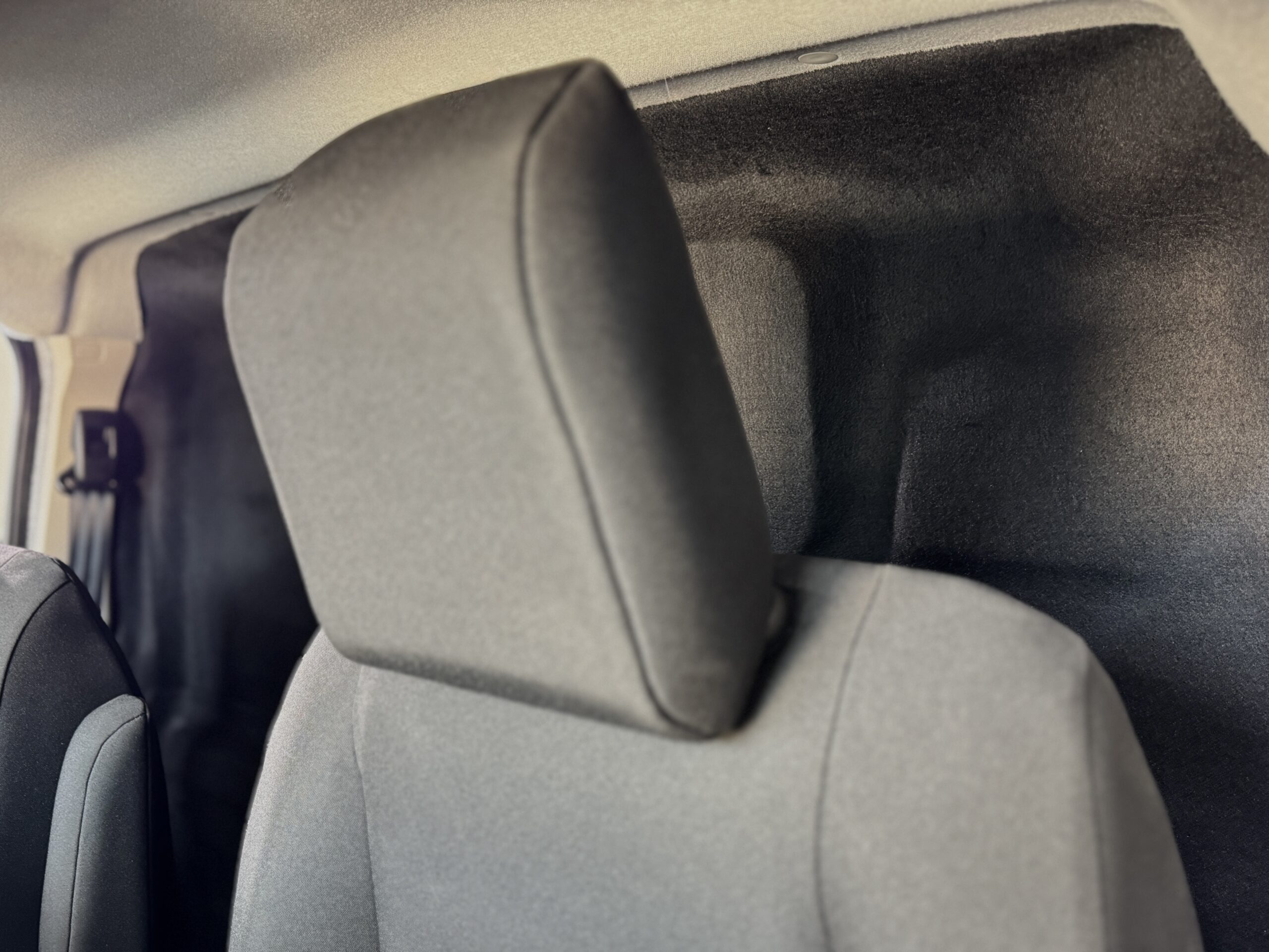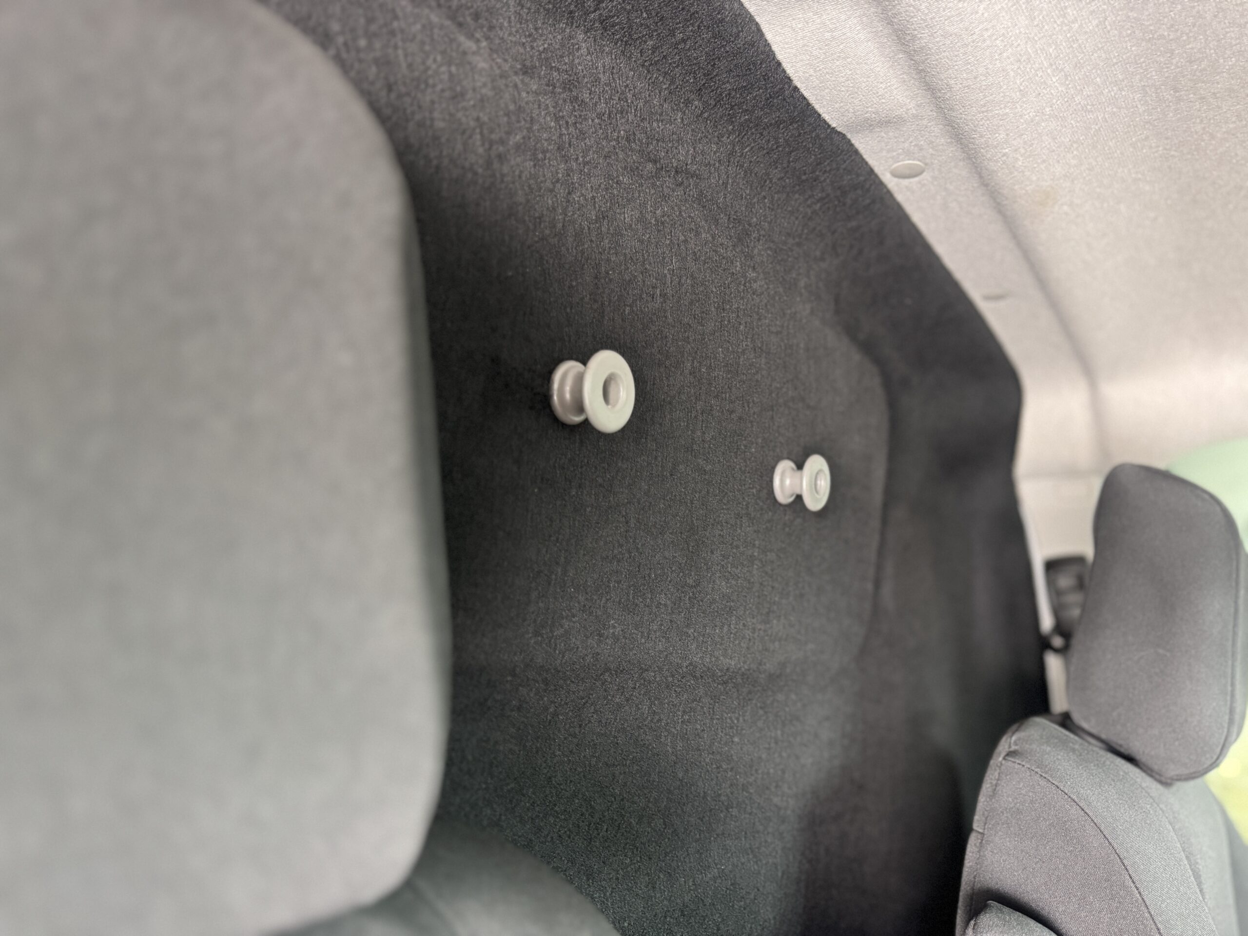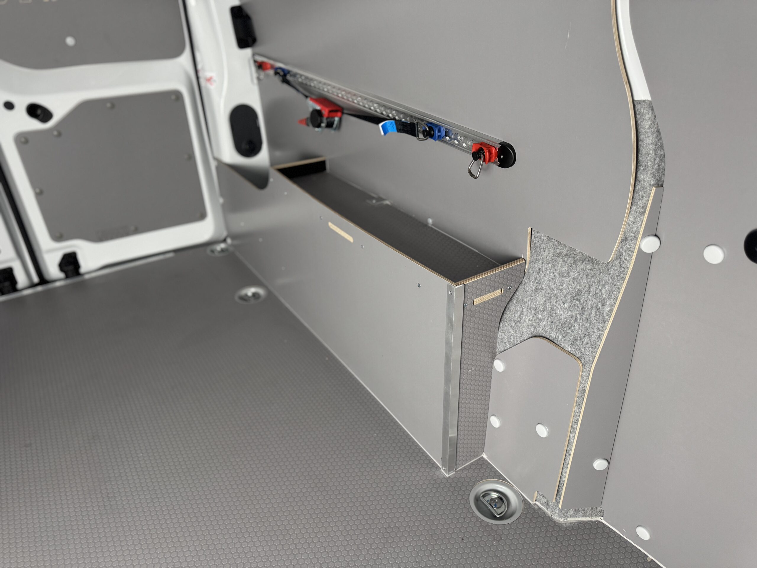 Ściana grodziowa została poddana modyfikacjom: zdemontowaliśmy kratę, którą następnie zaślepiliśmy. Dolna część grodzi zabezpieczona została sklejką, natomiast cała powierzchnia od strony kierowcy została wygłuszona matą butylową z folią aluminiową i pokryta wysokiej klasy filcem technicznym oraz dodaliśmy wieszaki na ubrania.
