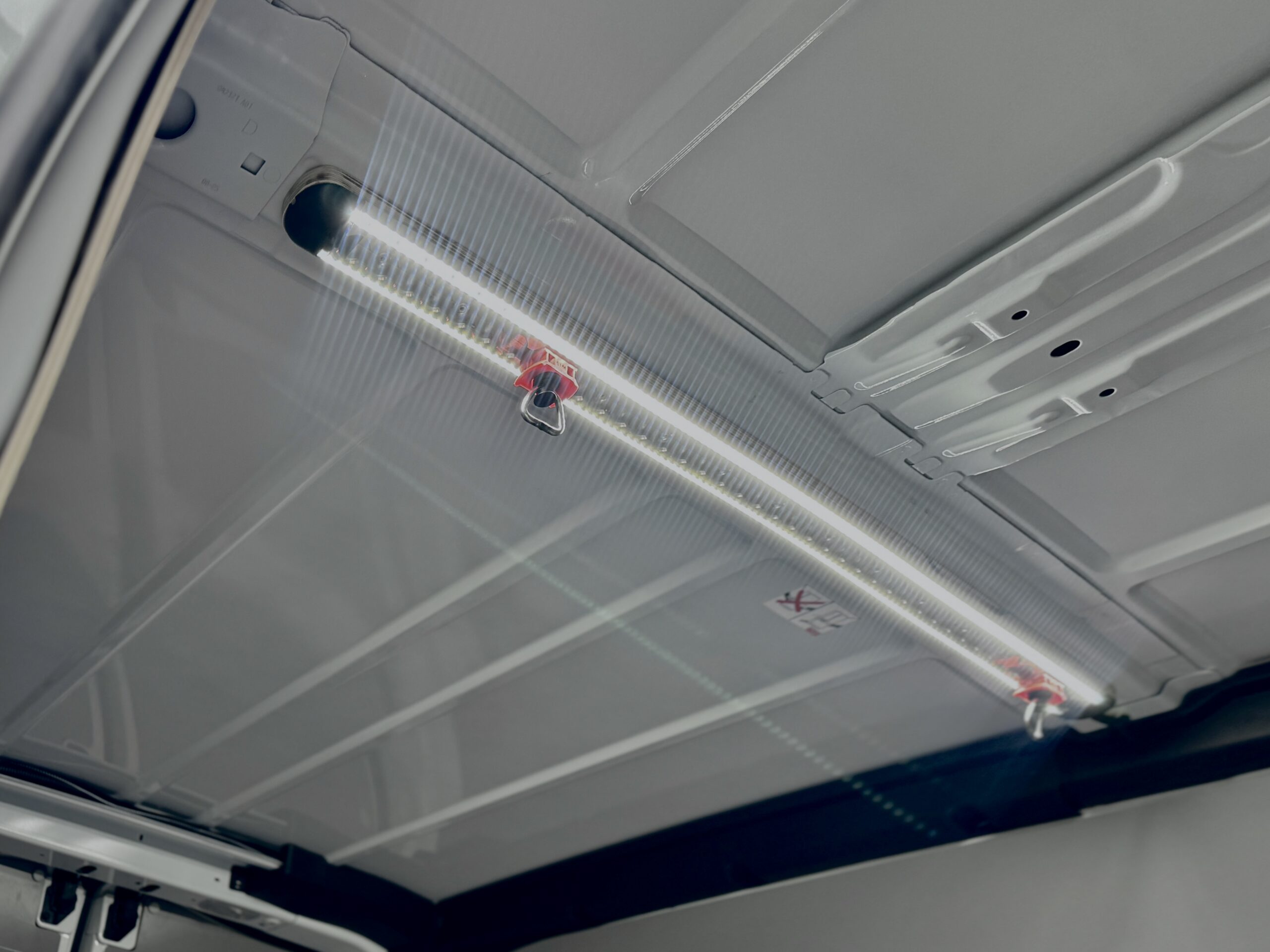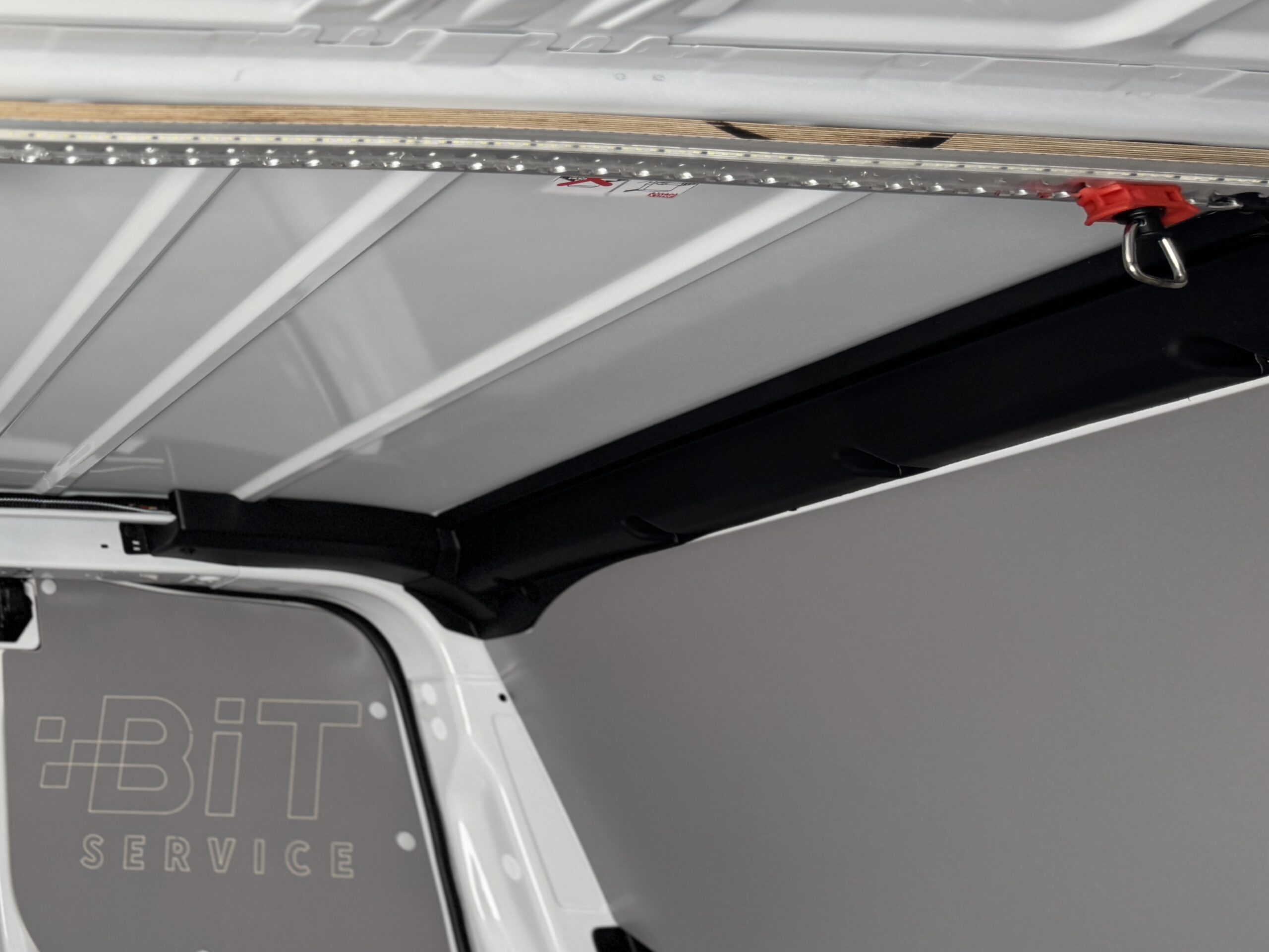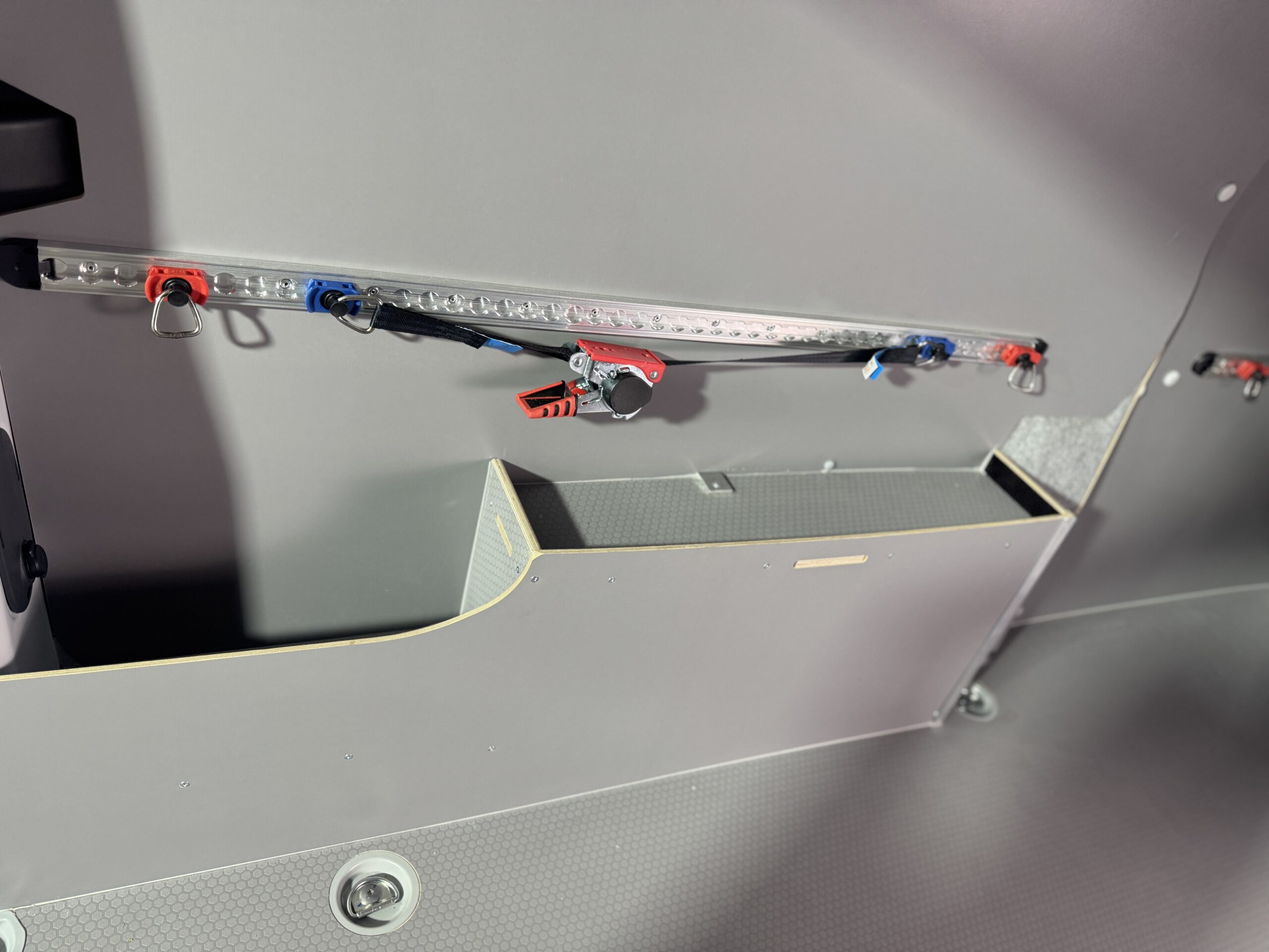 Na ścianach bocznych oraz suficie zamontowaliśmy systemy mocowania ładunku w postaci aluminiowych listew AIRLINE z uchwytami i automatycznymi pasami mocującymi. Dodatkowo listwa na suficie jest wyposażona w zintegrowane oświetlenie LED, co zwiększa komfort i funkcjonalność przestrzeni roboczej.