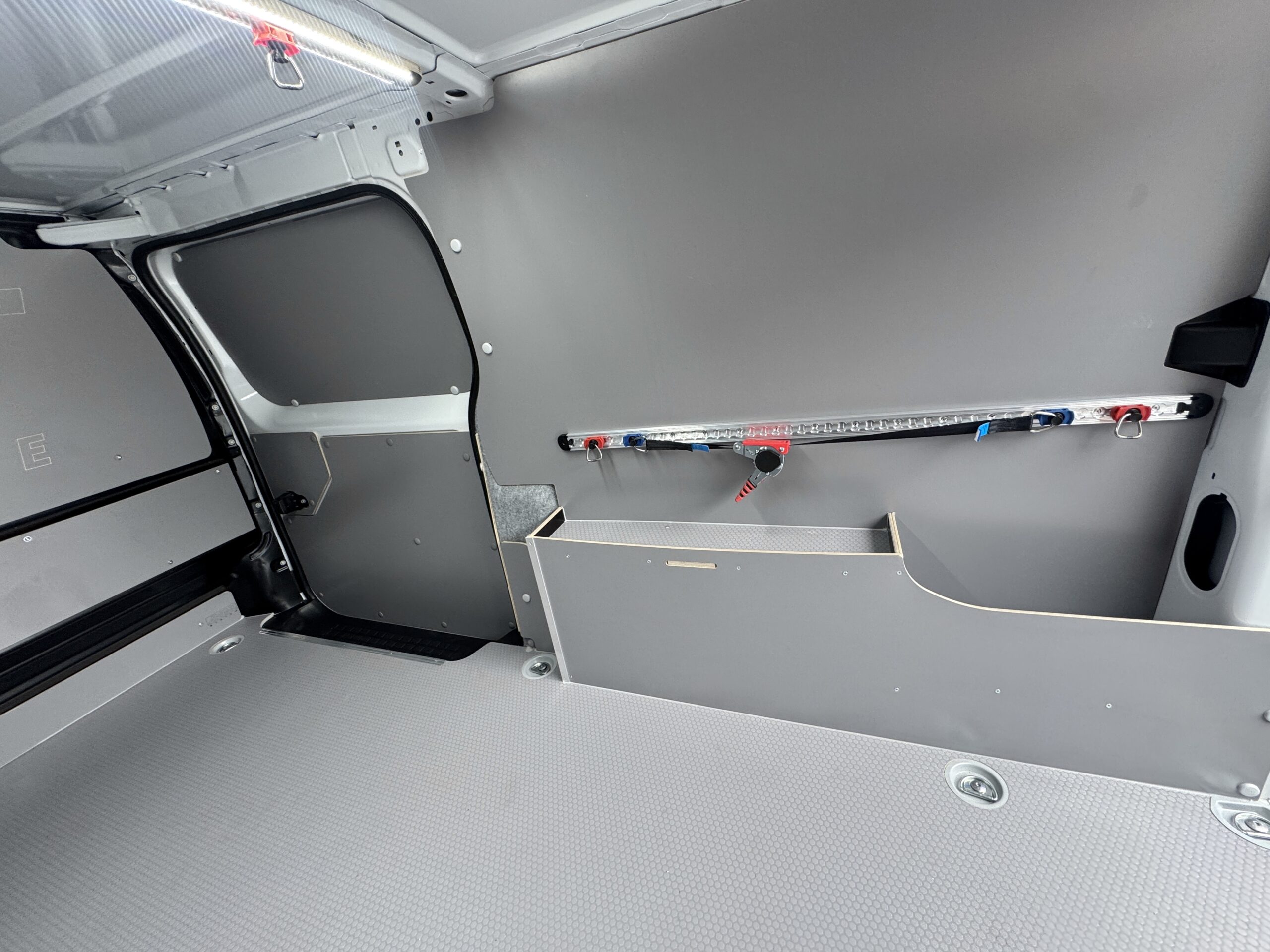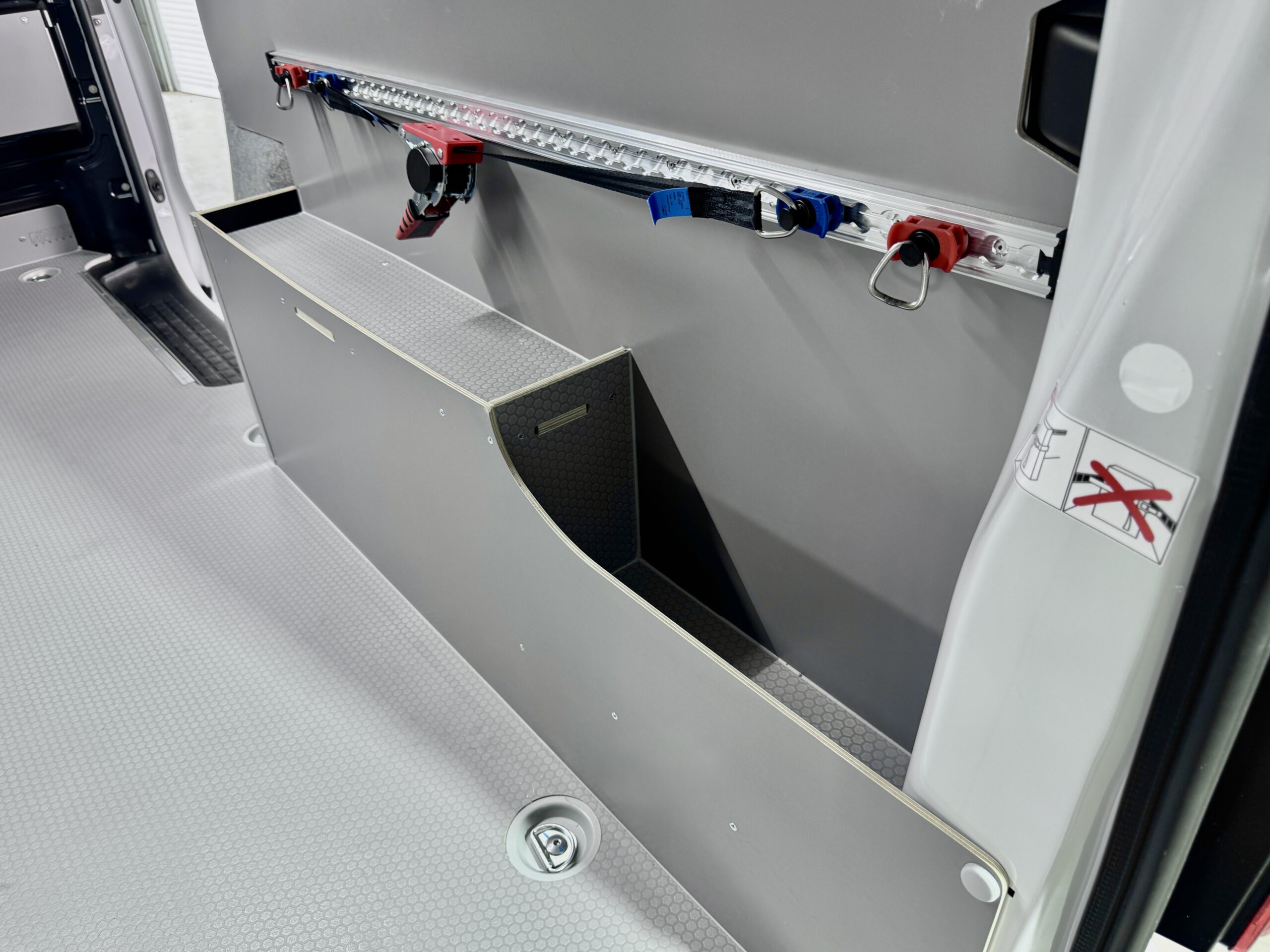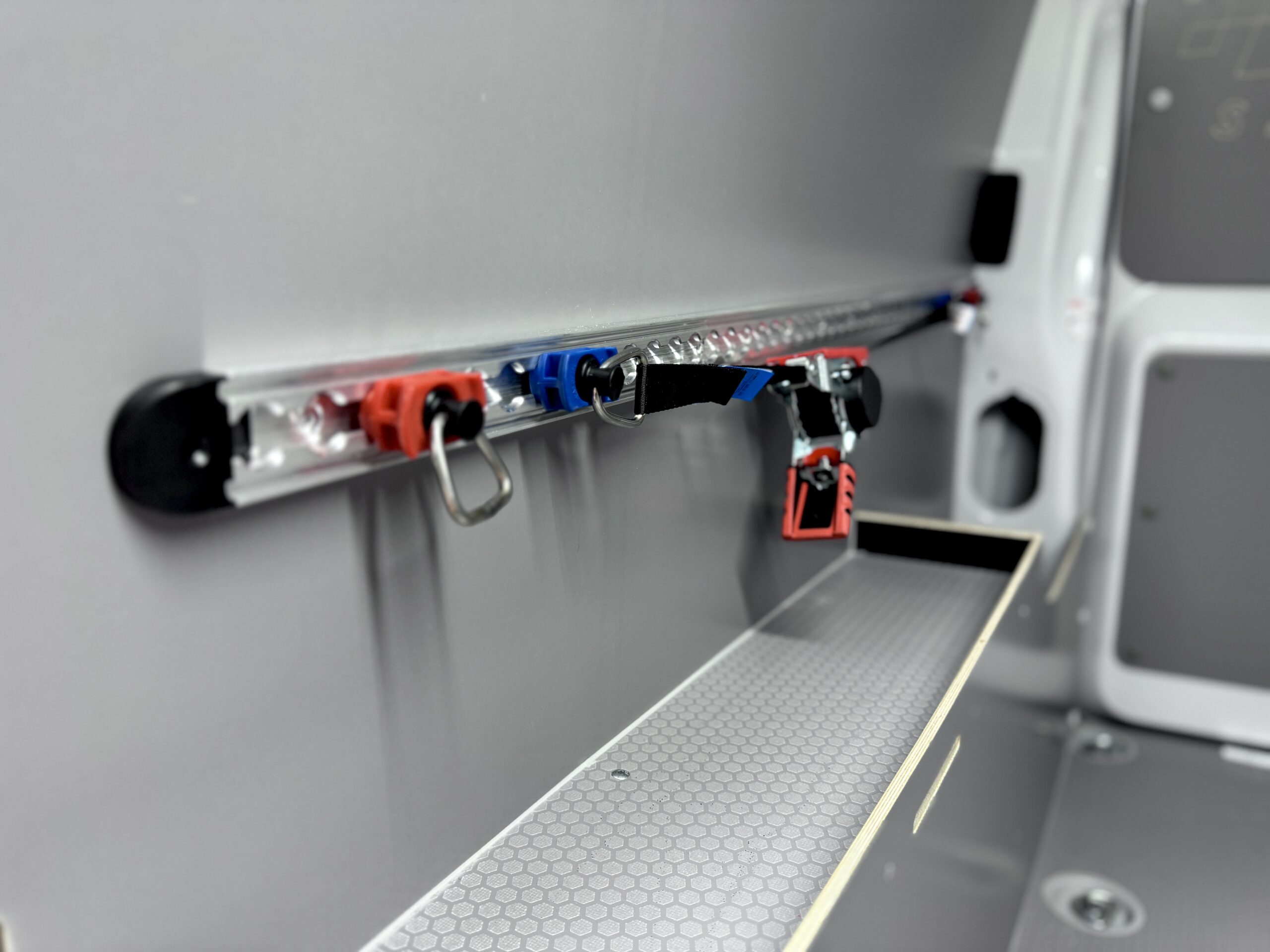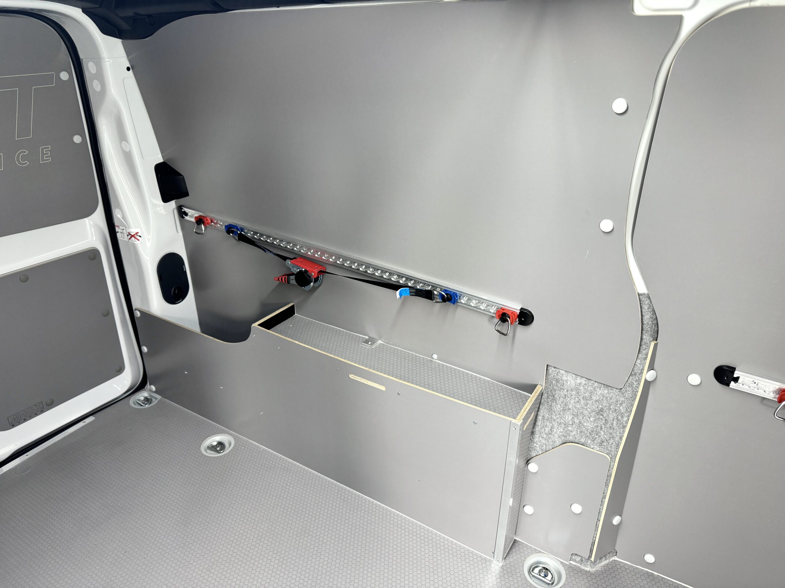 Na ścianach bocznych oraz suficie zamontowaliśmy systemy mocowania ładunku w postaci aluminiowych listew AIRLINE z uchwytami i automatycznymi pasami mocującymi. Dodatkowo listwa na suficie jest wyposażona w zintegrowane oświetlenie LED, co zwiększa komfort i funkcjonalność przestrzeni roboczej.