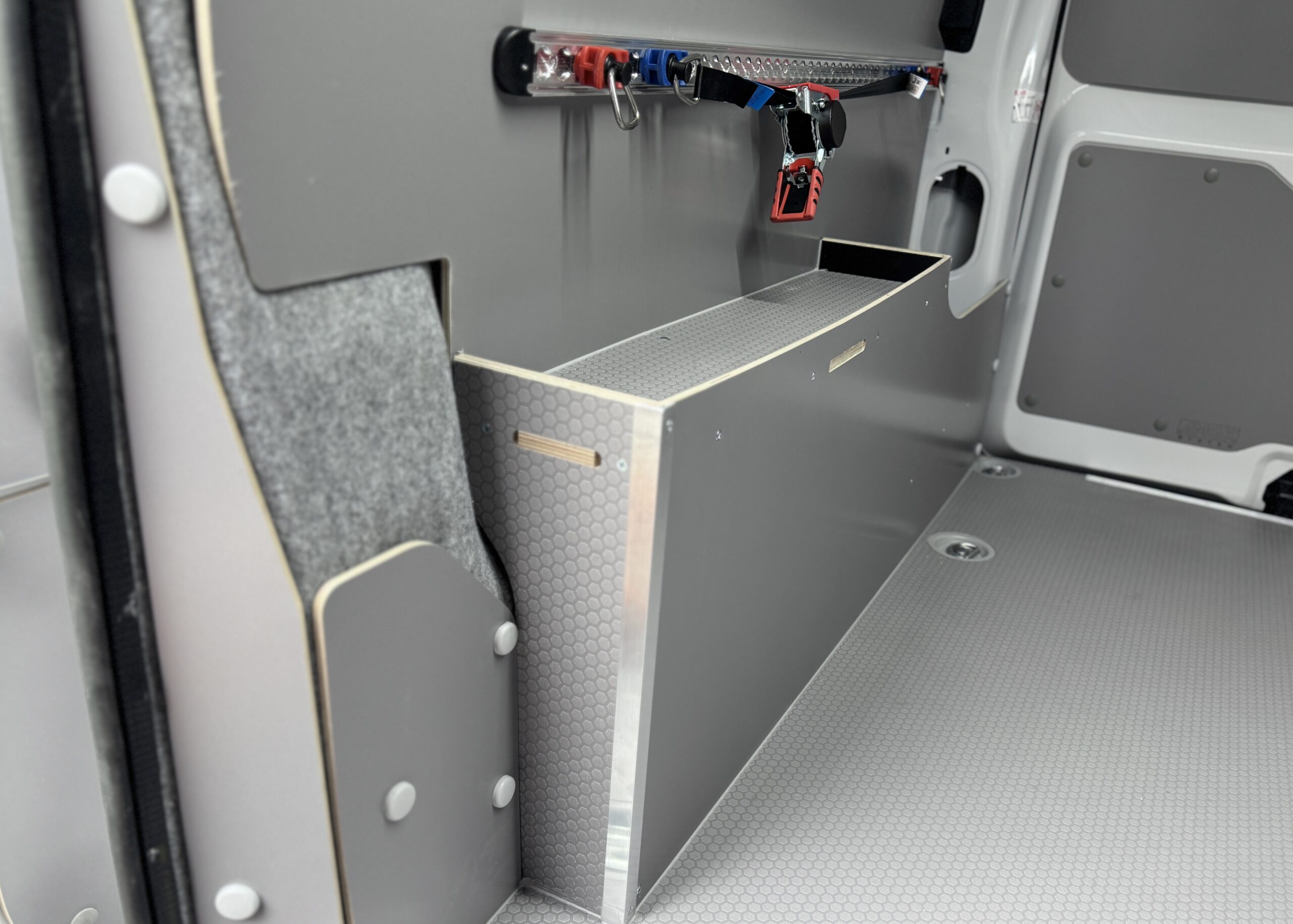 W pierwszej kolejności usunęliśmy fabryczną sklejkę oraz podłogę, które zostały zastąpione przez nasze autorskie rozwiązania. Ściany boczne wyłożyliśmy wodoodporną, obustronnie laminowaną sklejką o grubości 6,5 mm, natomiast wszystkie trudno dostępne elementy karoserii zabezpieczyliśmy wytrzymałym filcem technicznym. Na podłodze pojawiła się wyjątkowo odporna na zużycie, wodoodporna sklejka o grubości 12 mm.