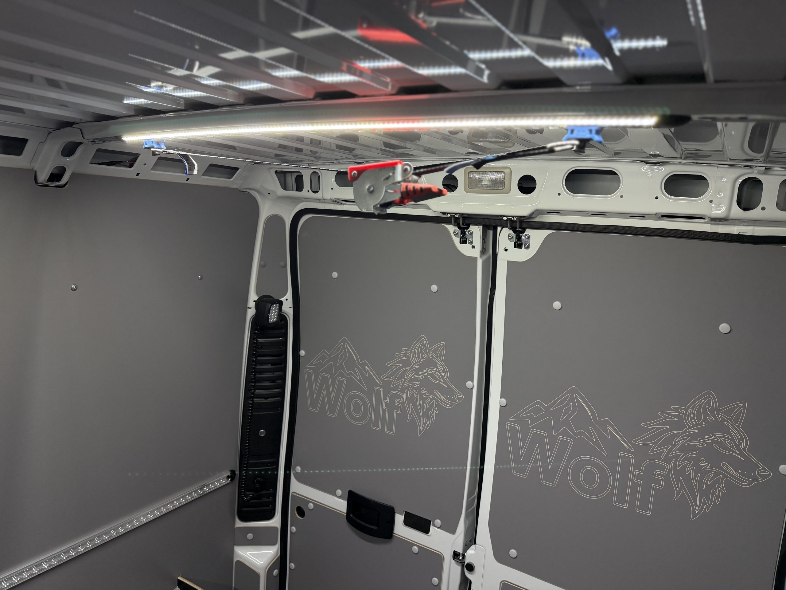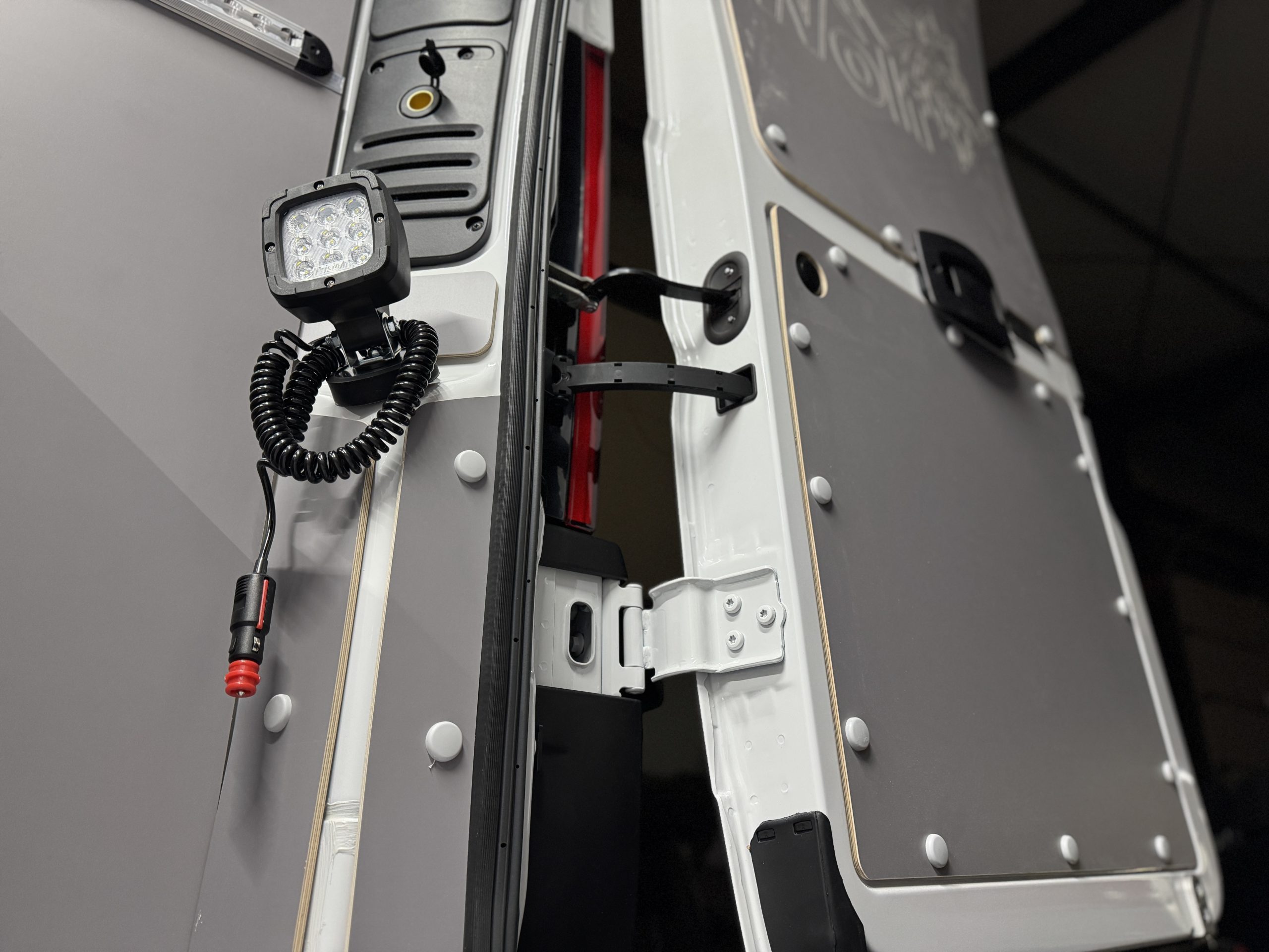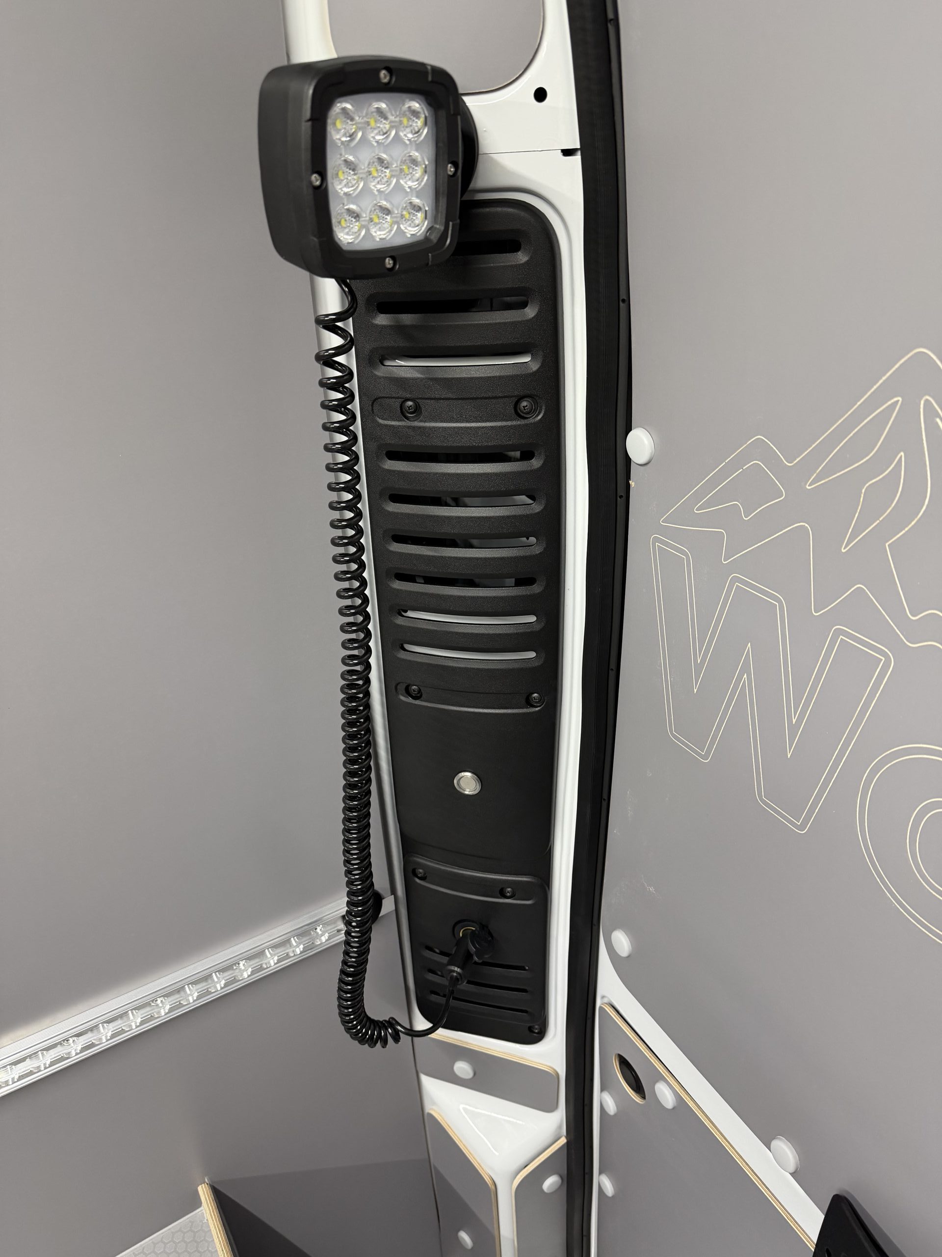 W pojeździe zastosowaliśmy listwy Airline renomowanej niemieckiej marki WISTRA, które umożliwiają bezpieczne i elastyczne mocowanie ładunku w dowolnym miejscu. Dodatkowo listwy Airline z LED zamontowaliśmy również na suficie, wraz z zintegrowaną lampka kontrolna w kabinie kierowcy. Szperacz LED na magnesie, zasilany z gniazda zapalniczki, idealny do pracy po zmroku.
