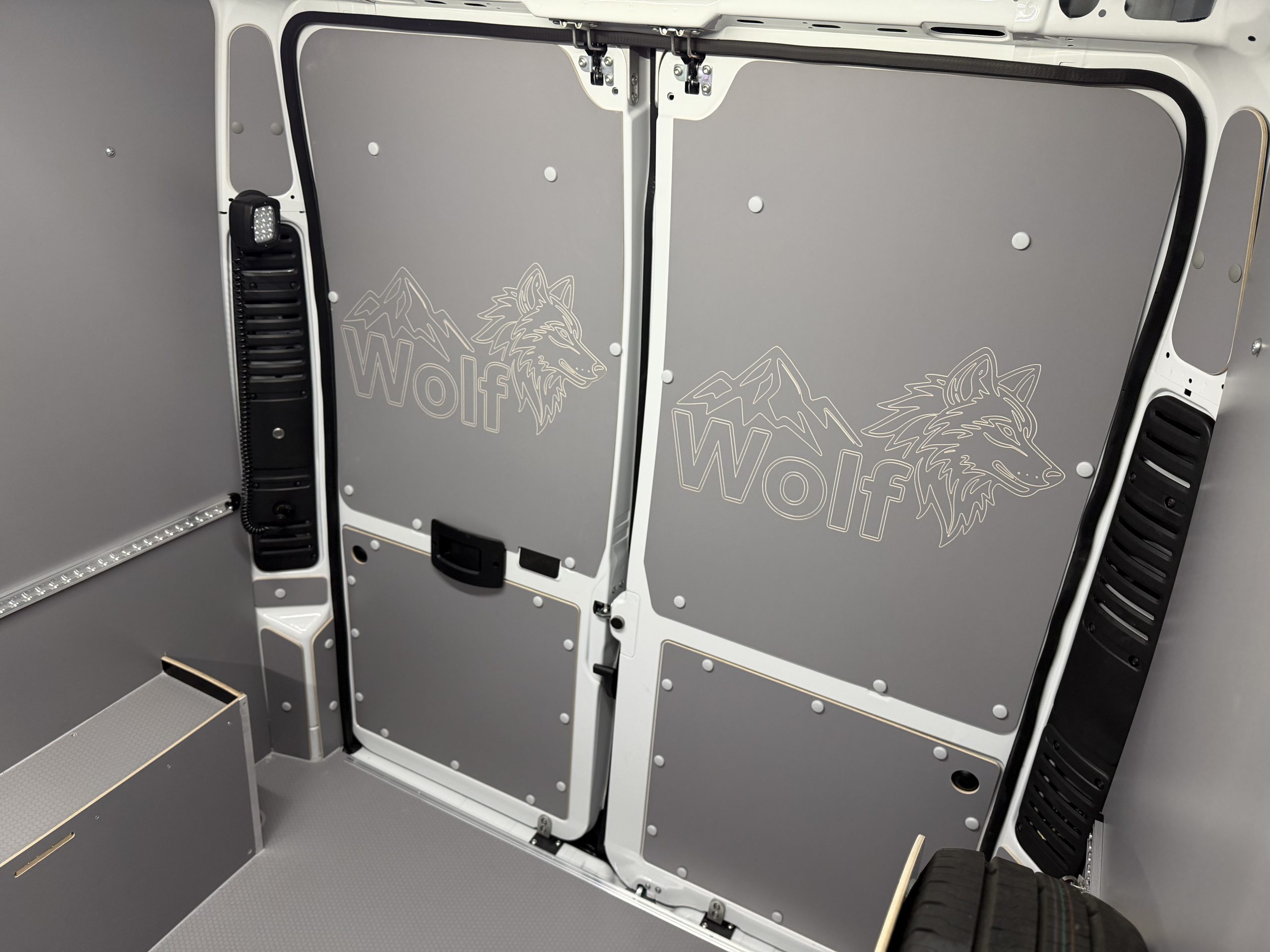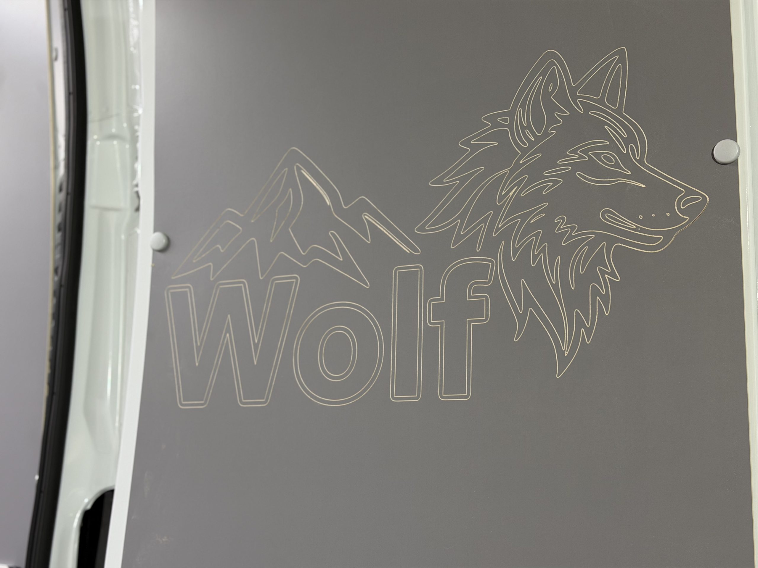 Wykonane z tej samej sklejki laminowanej 6,5 mm. Dodatkowo zastosowano grawer logo firmy, co podkreśla indywidualny charakter zabudowy.Ściana grodziowa