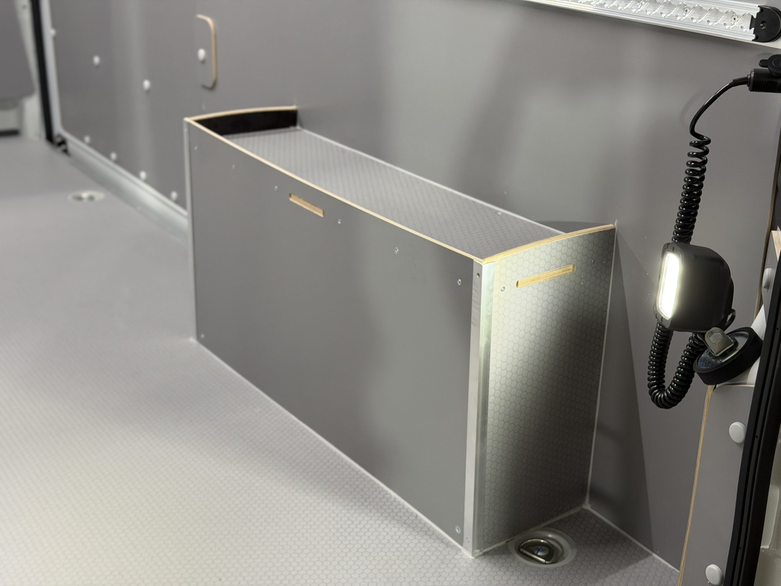 Wykonana ze sklejki wodoodpornej HEXA o grubości 12 mm. Powierzchnia antypoślizgowa, łatwa w czyszczeniu, zakończona aluminiowymi listwami podłogowymi.Panele boczne