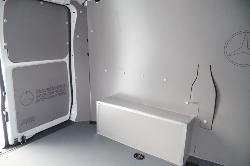 W trudno dostępnych miejscach, których nie można w całości pokryć sklejką, zastosowano filc techniczny, który doskonale dopasowuje się do nieregularnych kształtów Zabudowa wnętrza Mercedesa Vito to praktyczne i trwałe rozwiązanie, które skutecznie chroni samochód przed codziennym zużyciem. Precyzyjne oklejanie paneli, solidne zabezpieczenie nadkoli i boków przy tylnych drzwiach oraz zastosowanie filcu gwarantują dłuższą żywotność pojazdu i większy komfort użytkowania.